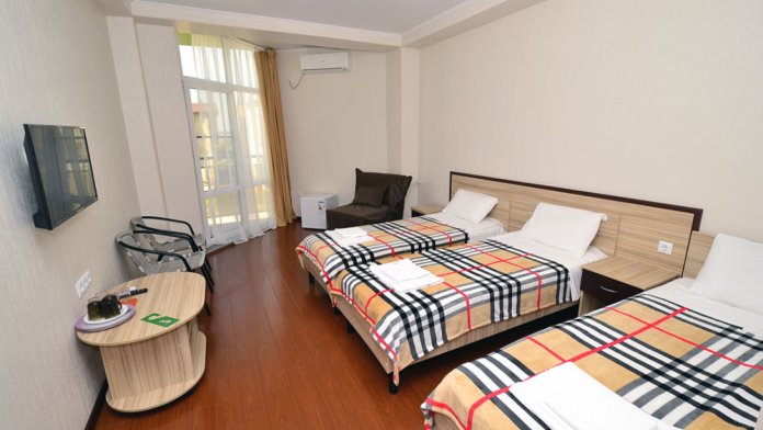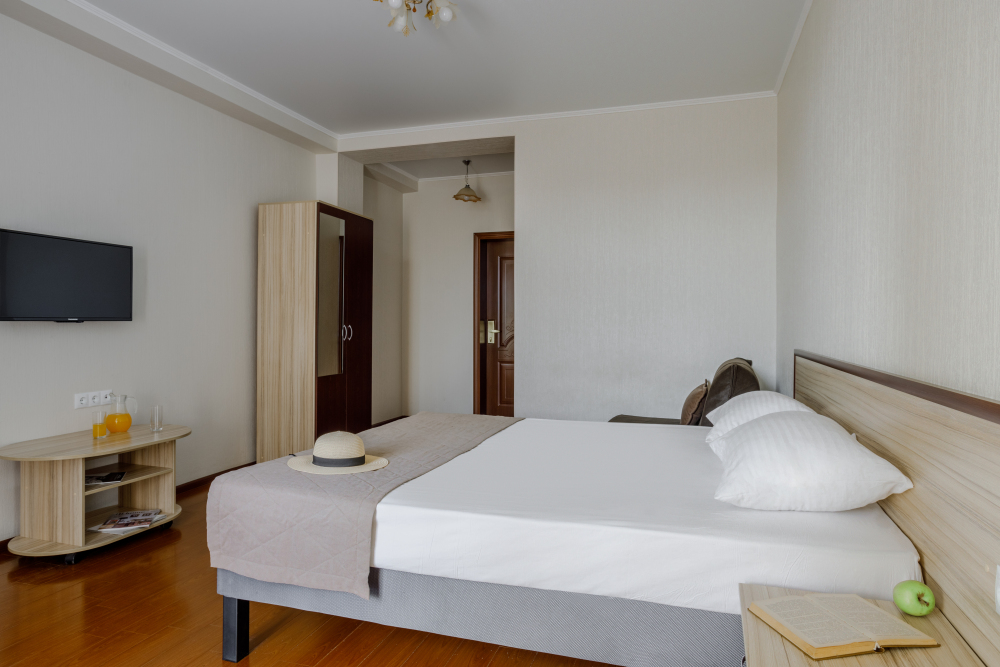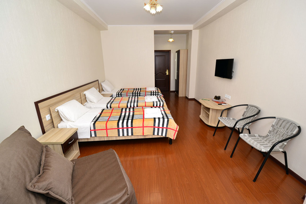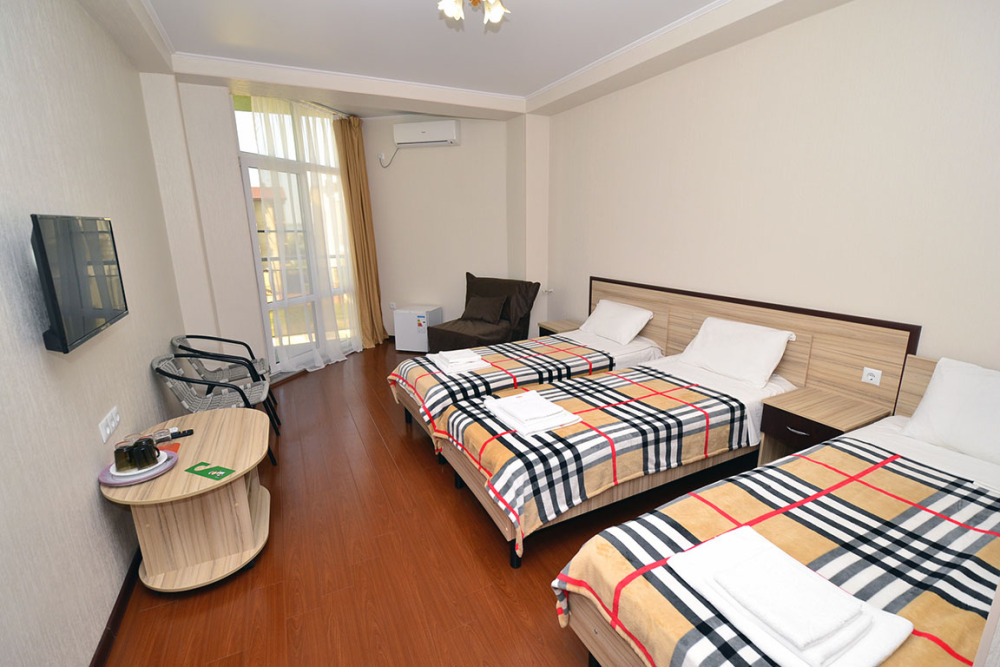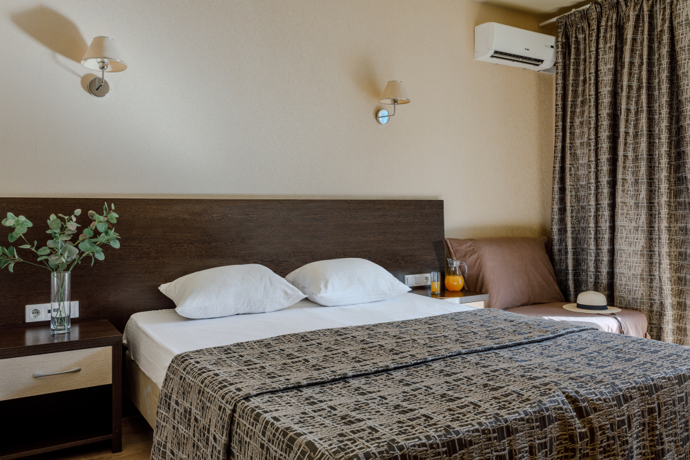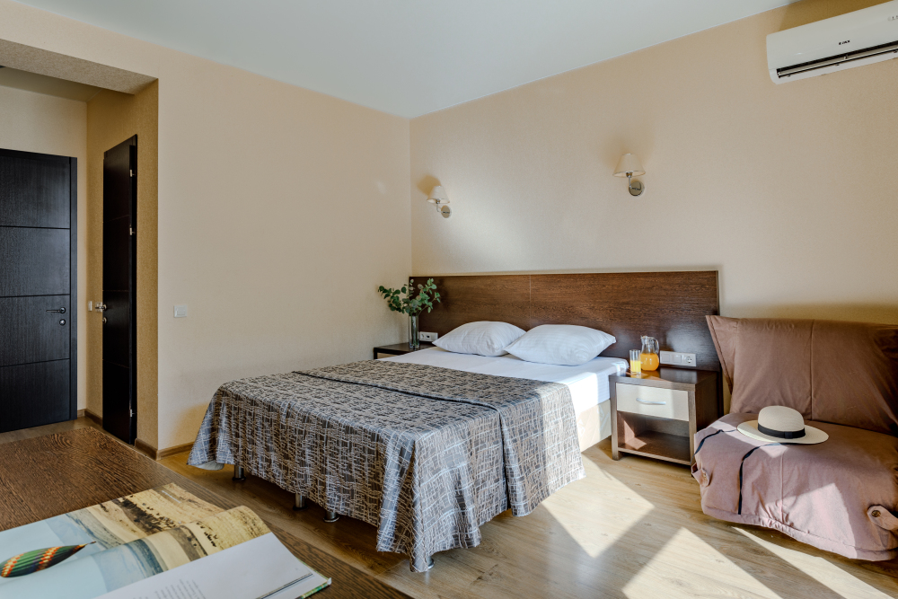 В номере: две односпальные кровати или одна двуспальная кровать, односпальная кровать, ТВ, холодильник, сплит-система, сейф.