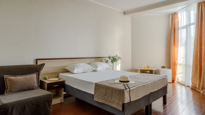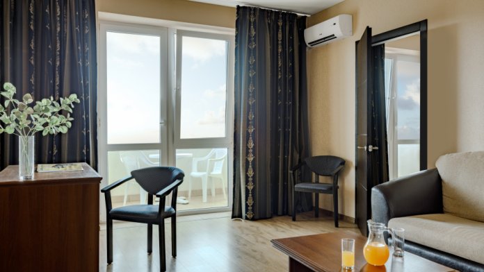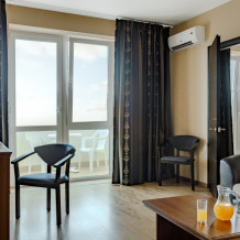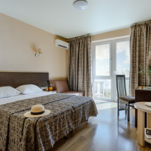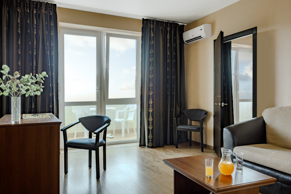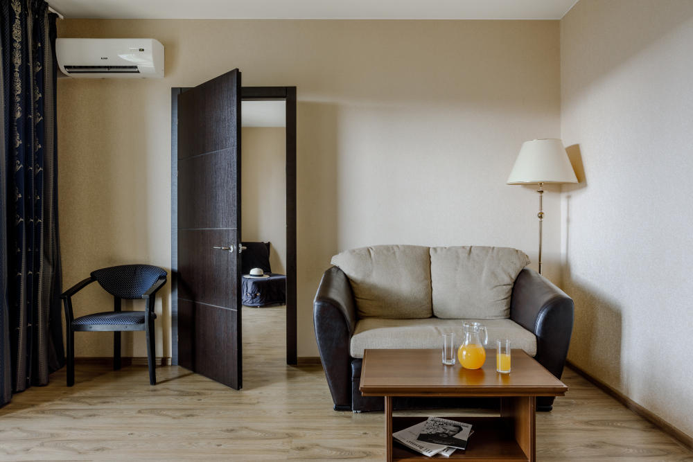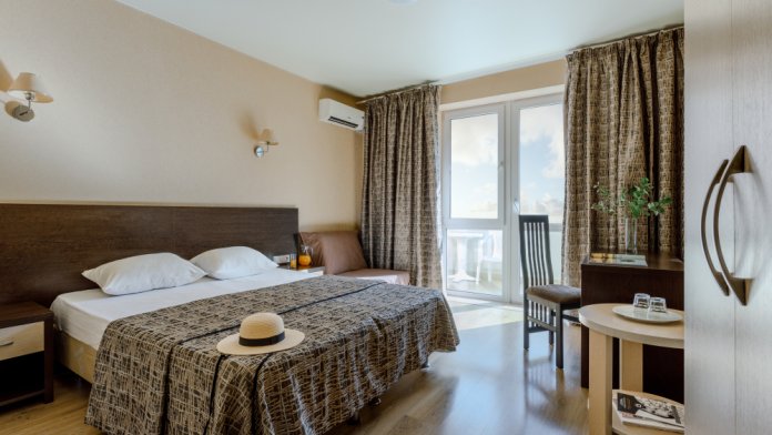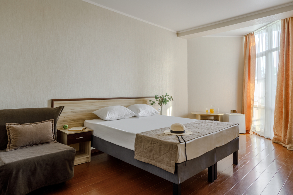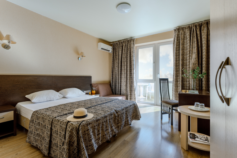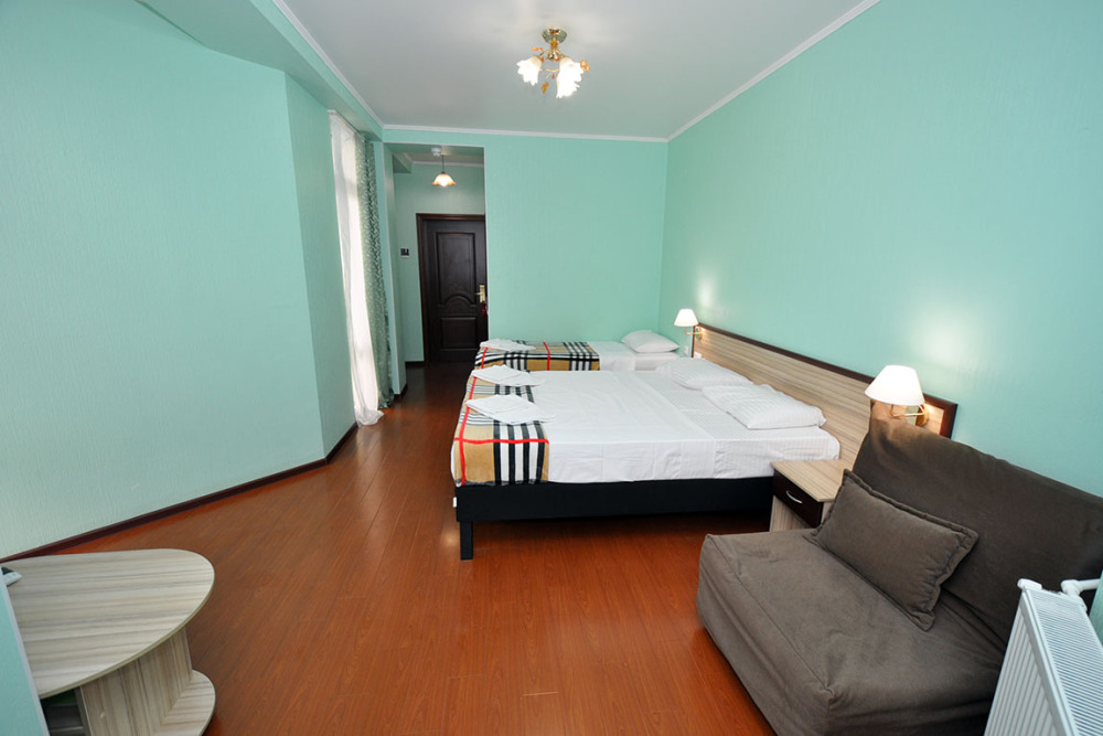 В номере: две односпальные кровати или одна двуспальная кровать, односпальная кровать, ТВ, холодильник, сплит-система, сейф.
