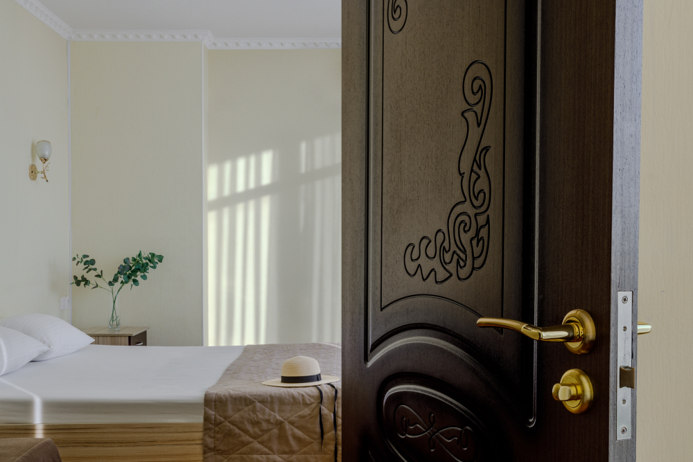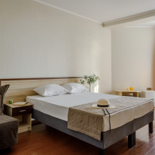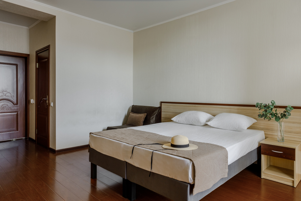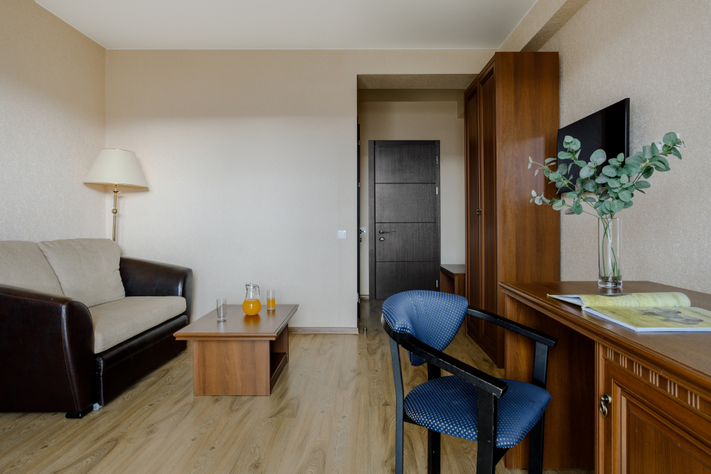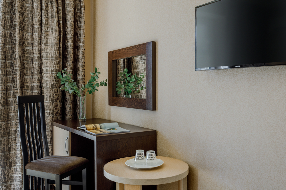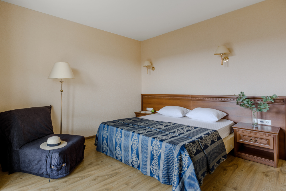 В номере одна двуспальная кровать или же две односпальные, прикроватные тумбочки. Также к услугам постояльцев предлагаются удобные стулья, вместительный шкаф для одежды, стол и обувная тумбочка с зеркалом.Для ценных вещей предусмотрен сейф.