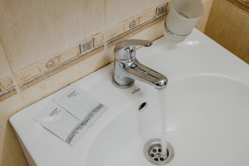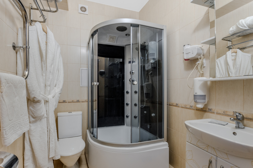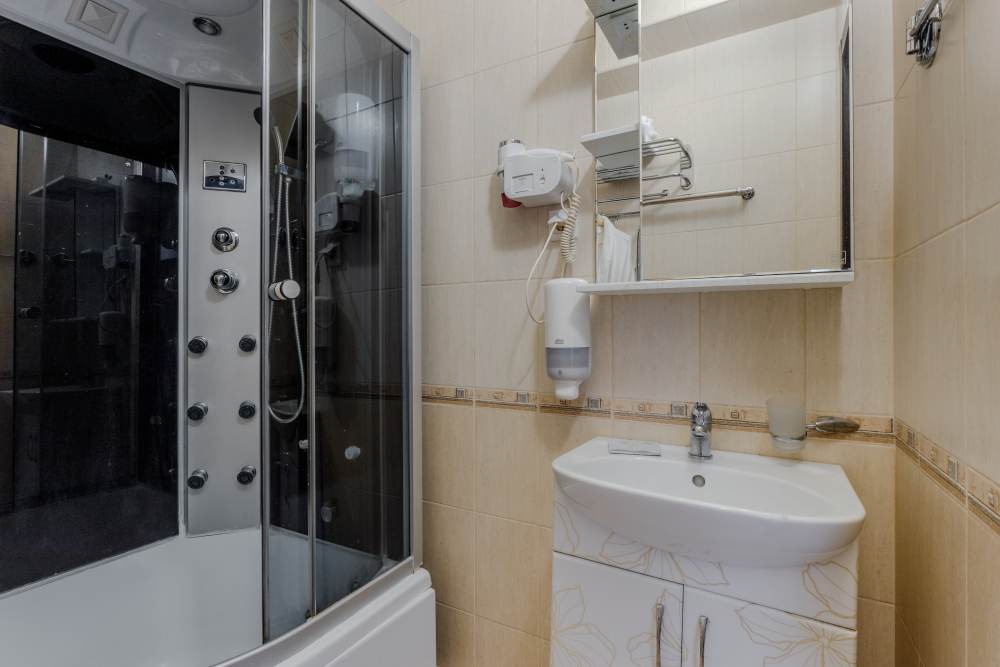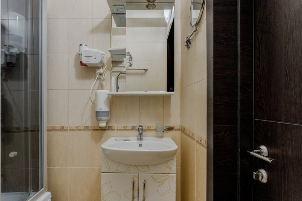 Ванная комната оснащена эргономичной сантехникой. Кроме того, в ней есть зеркало и фен.