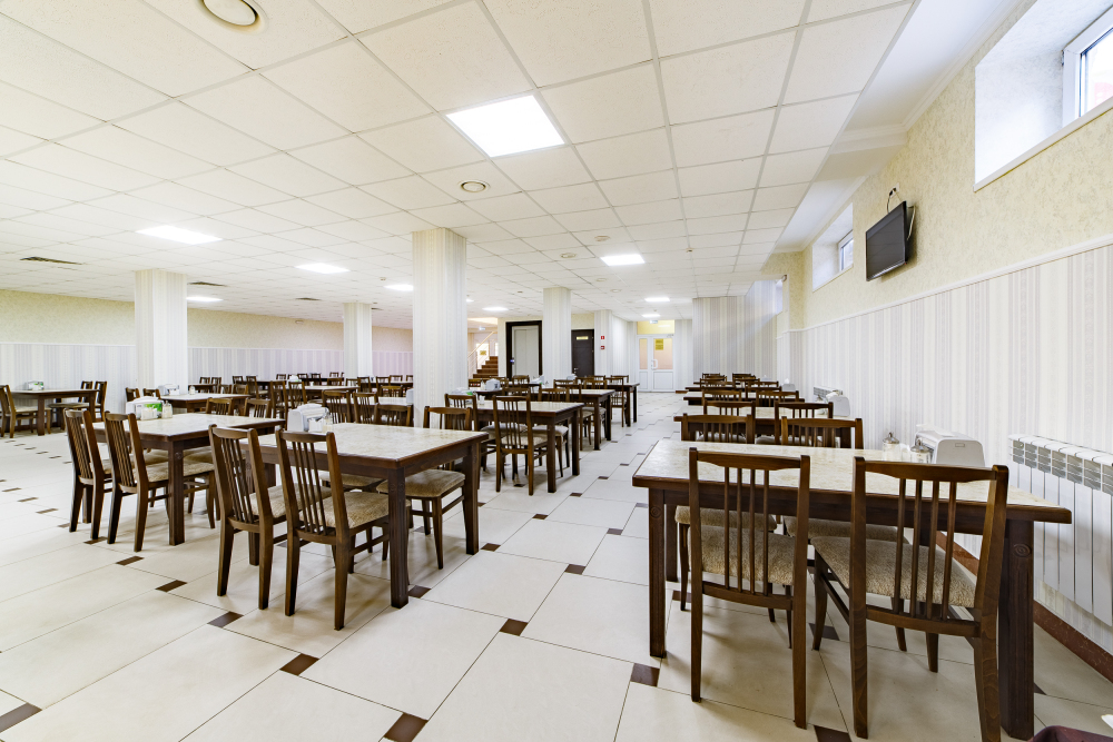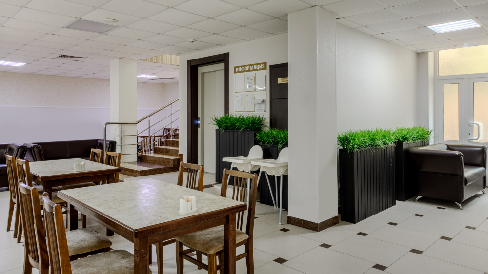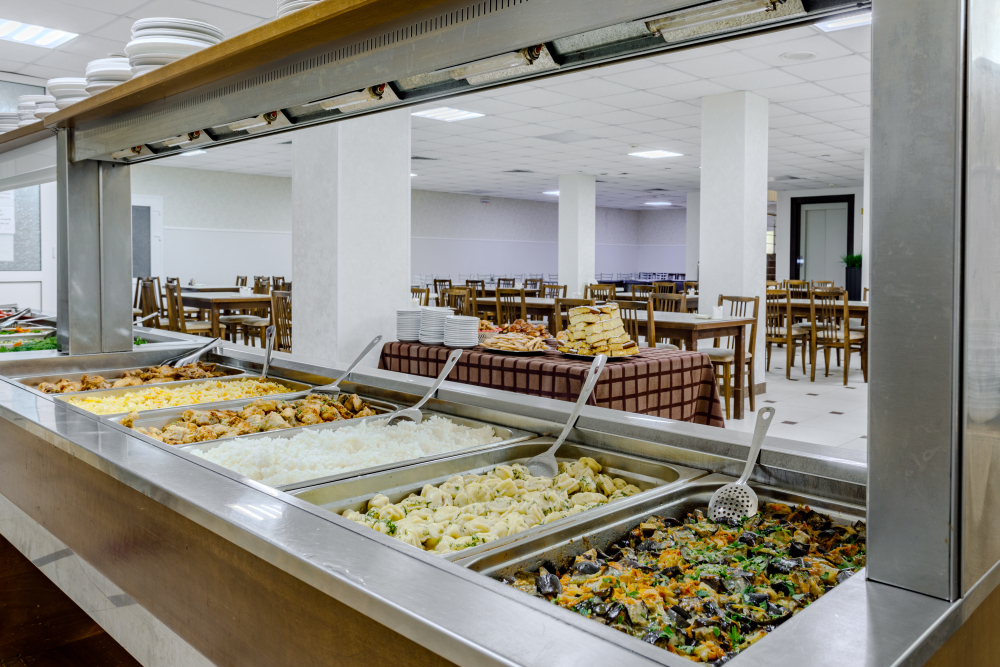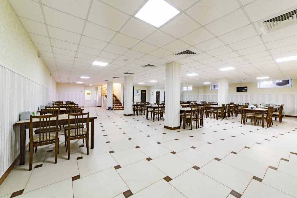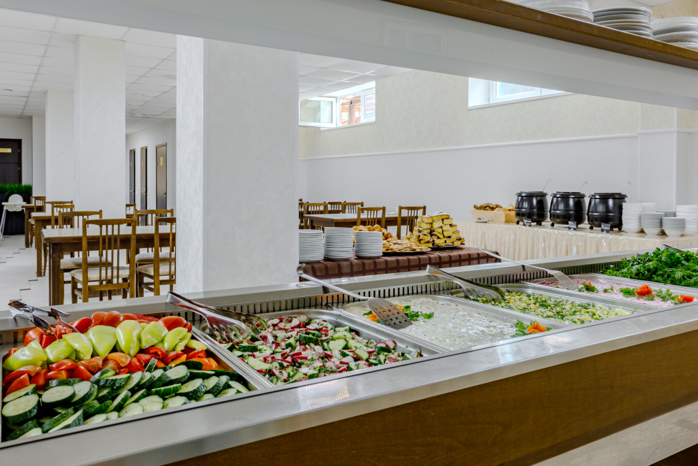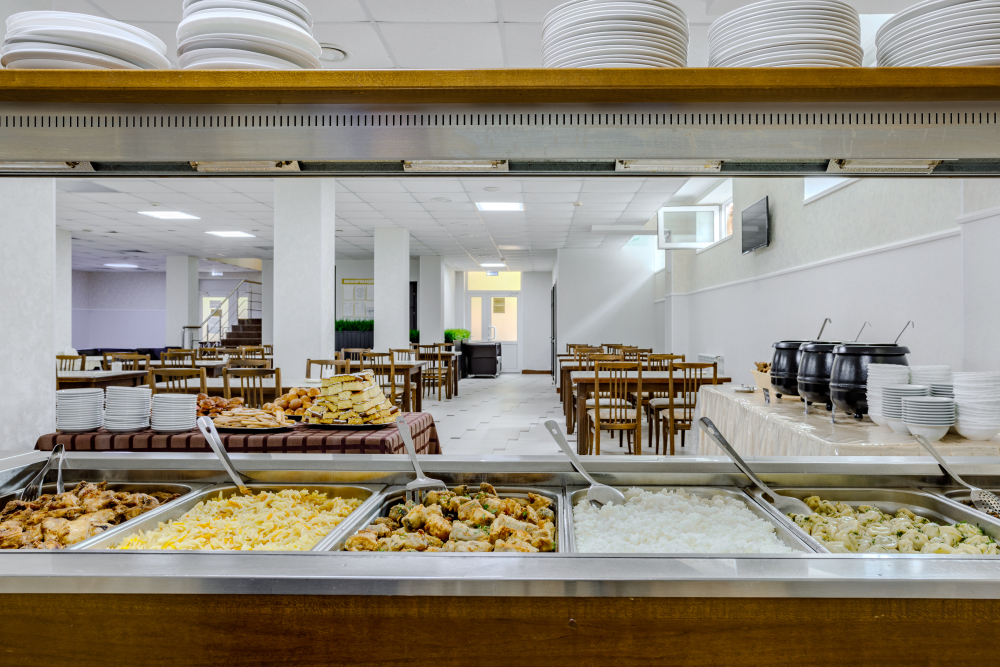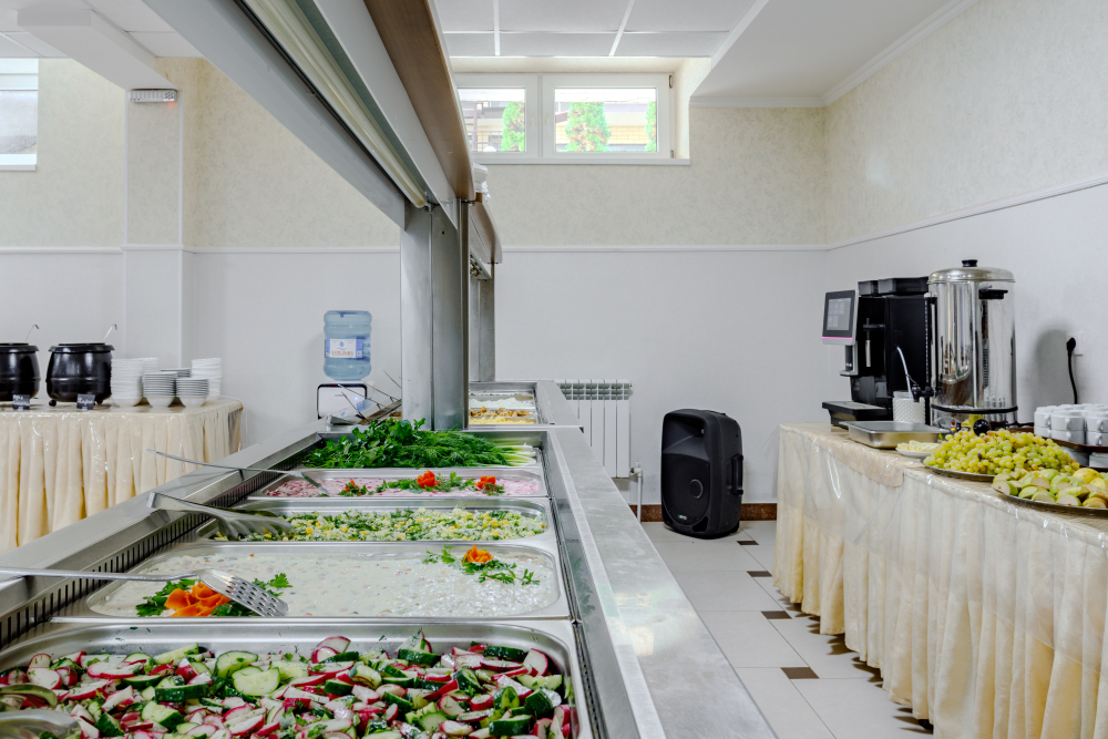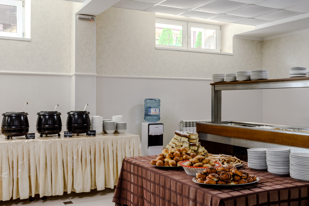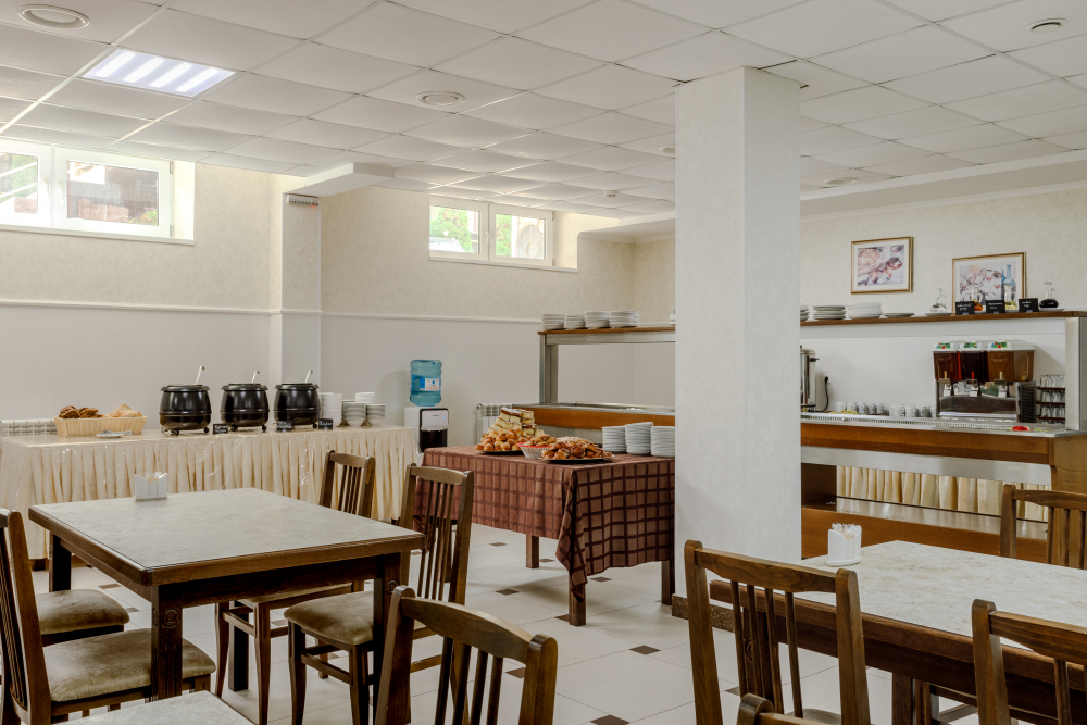 Гостям предлагается 3-х разовое питание по системе «шведский стол». В меню богатый выбор мясных, рыбных блюд, первых блюд и бульонов, гарниров. Всегда свежие овощи, фрукты, зелень. Меню адаптировано для питания детей. Для самых маленьких предусмотрены детские стульчики для кормления.