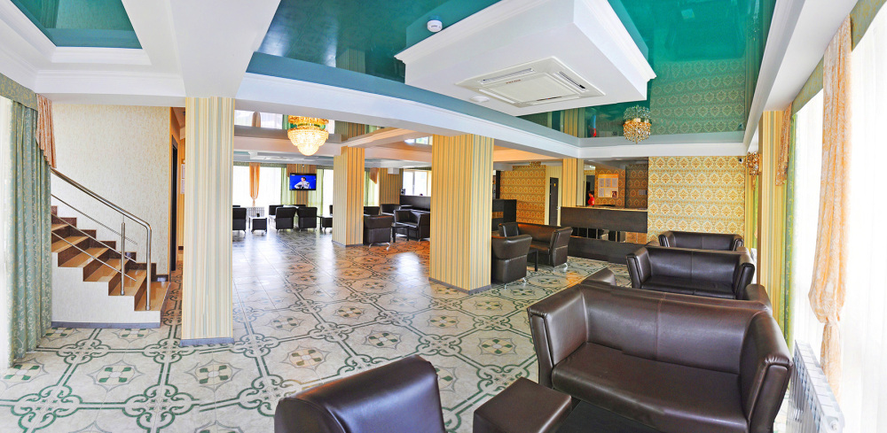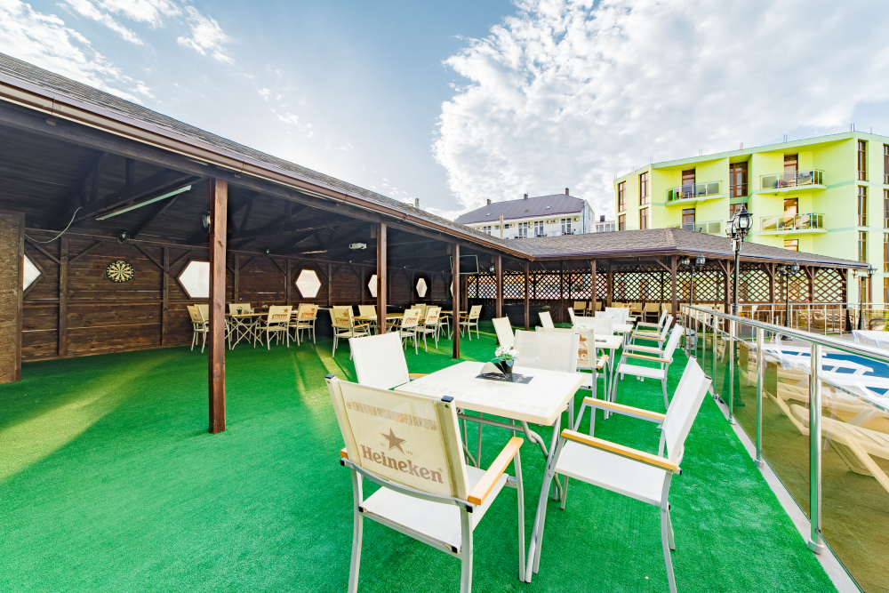 На территории отеля работает кафе-бар, где представлены в ассортименте: пицца, хот-доги, кондитерские изделия, сухие завтраки, сладкая вата, поп-корн. Безалкогольные напитки: чай, кофе, компот, прохладительные морсы. Алкогольные напитки кубанских производителей: вино 2-х видов, пиво 4-х видов и водка.