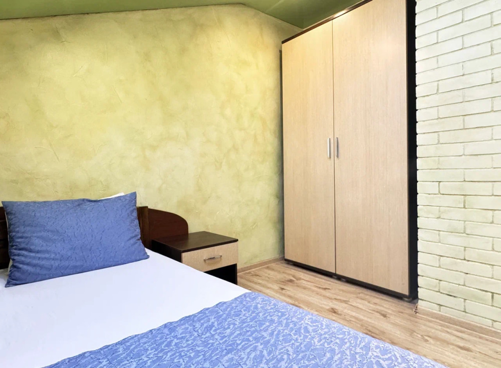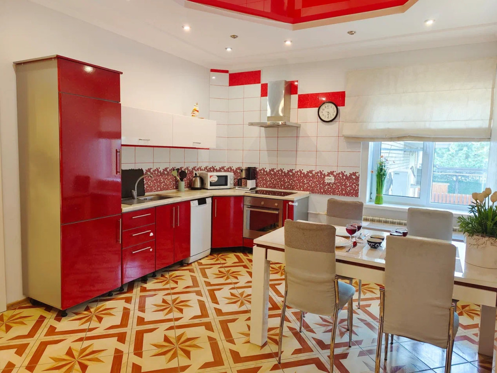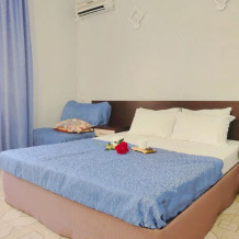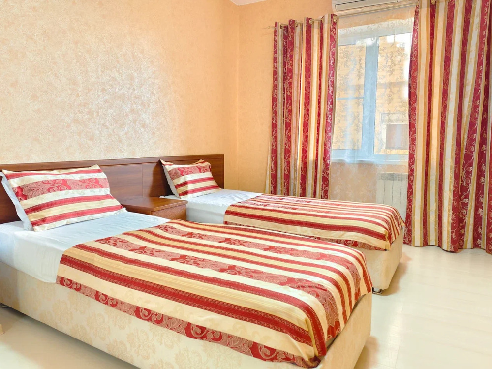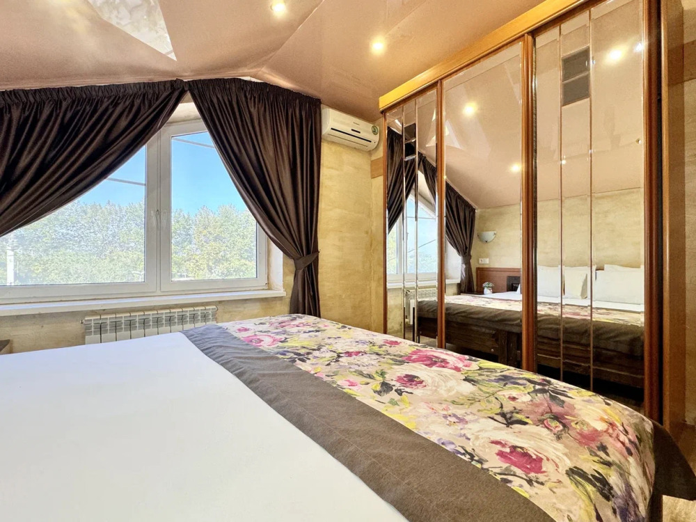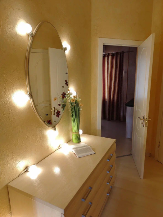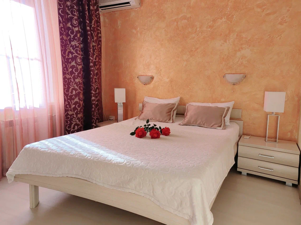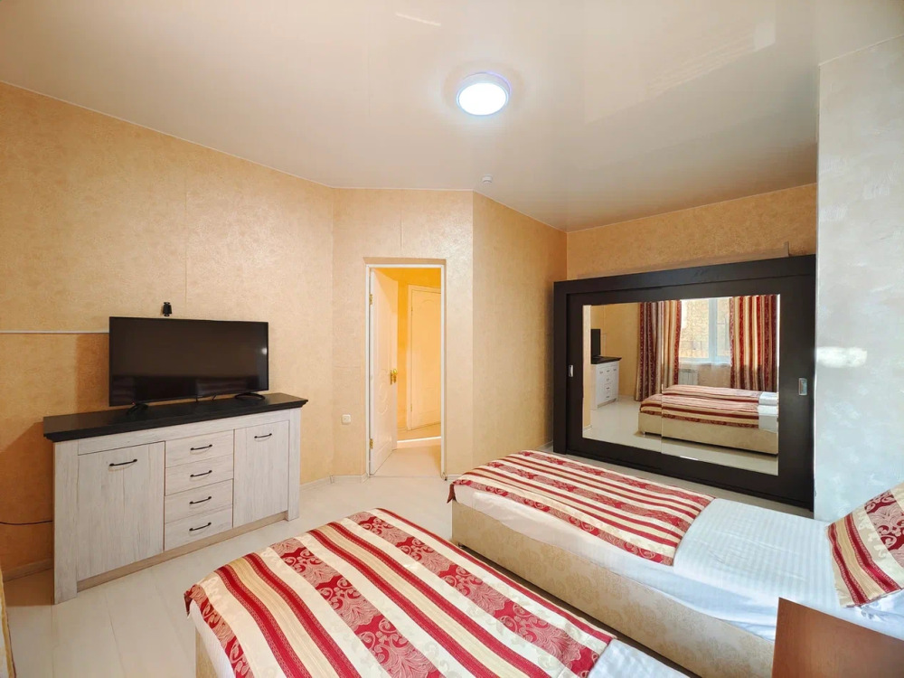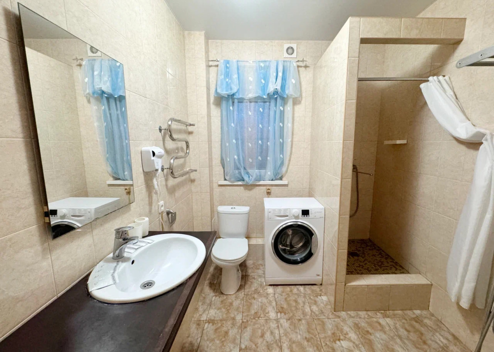 Спальня 1 оснащена: 2-мя односпальными кроватями, шкафом, тумбочками, кондиционером. Спальня 2: два двуспальных дивана, кондиционер, телевизор, мебельная стенка с полочками и шкафчиками, столик, гладильная доска и утюг. Спальня 3: двуспальная кровать, бра, тумбочка, зеркало, шкаф, кондиционер, сейф. Для наших гостей всем необходимым оборудована кухня: кухонным гарнитуром, обеденным столиком и стульями, микроволной печью, чайником, холодильном, двухконфорочной варочной панелью для приготовления еды, набором посуды и столовыми приборами. В номере имеется стиральная машина и сушилка для вещей.