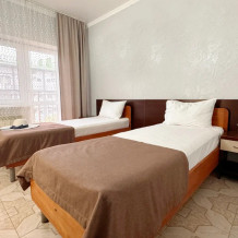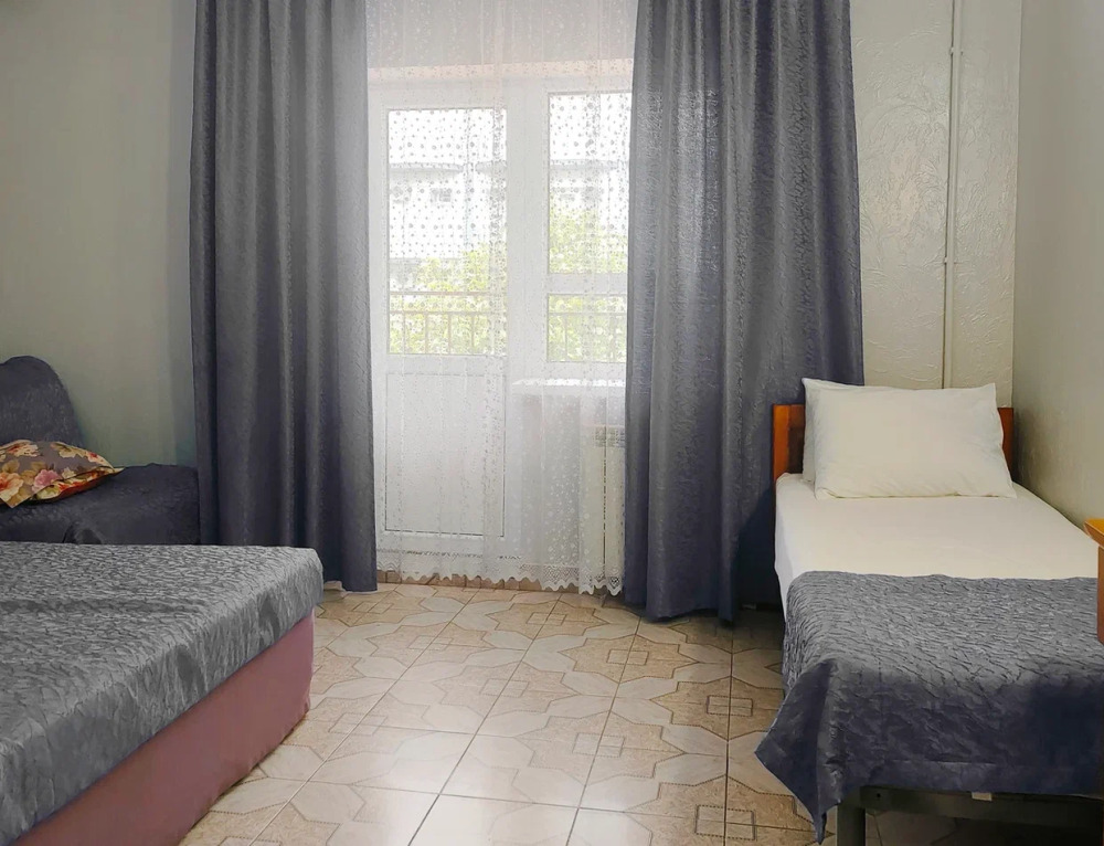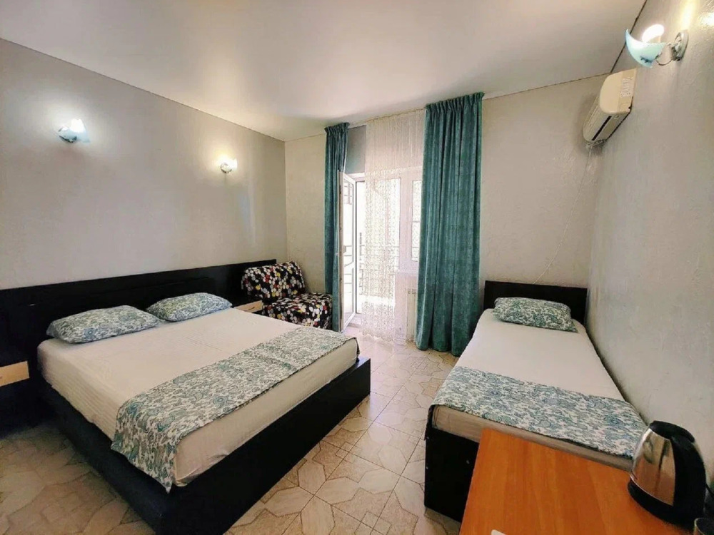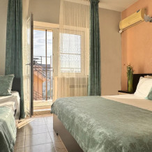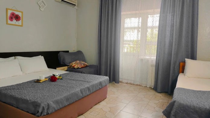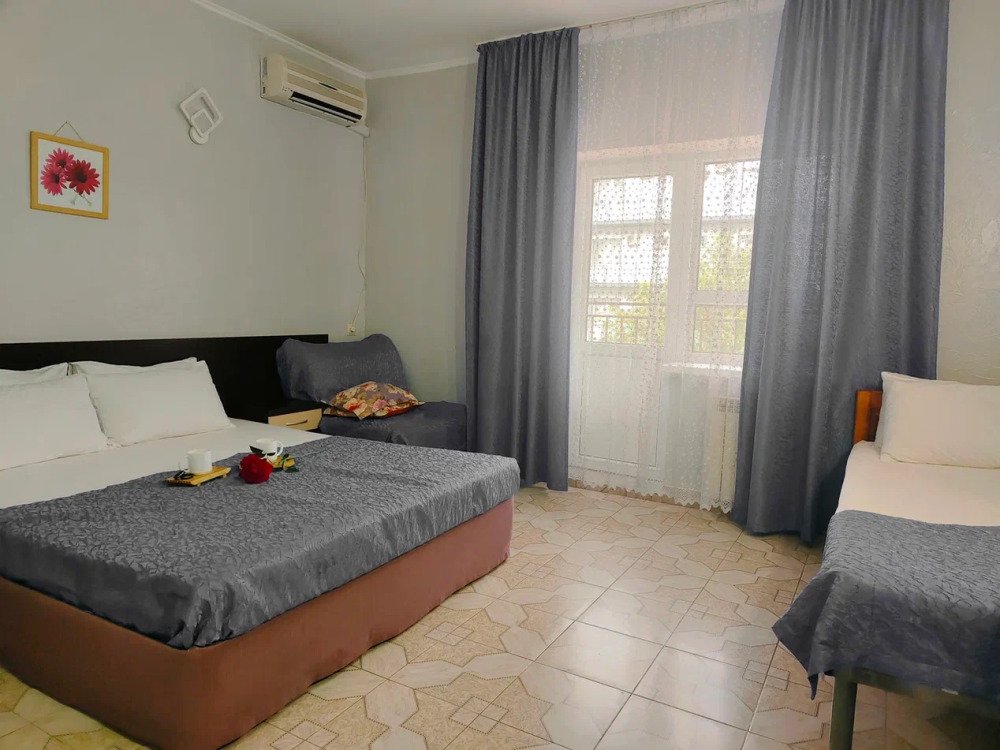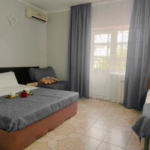 Номер оснащен: 3-мя односпальными кроватями или односпальной кроватью и двуспальной кроватью, прикроватными тумбочками, бра, телевизором, кондиционером, шкафом, вешалкой, зеркалом, чайником, мини-холодильником, феном. Балкон оборудован летней мебелью для отдыха на свежем воздухе, столом и стульями.