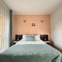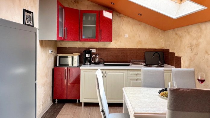 Спальня 1: двуспальной кроватью, тумбочками, телевизором, кондиционером. Спальня 2: 2-мя односпальными кроватями, тумбочками, телевизором, кондиционером, комодом, зеркалом. Во второй спальне находится ванная комната, оборудованная душем, раковиной и санузлом. Номер оснащен: кухонным гарнитуром, чайником, холодильником, микроволновой печью, набором посуды, столовыми приборами, двухконфорочной варочной панелью, обеденным столиком. Перед входом в номер расположена зона отдыха с летней мебелью, столом и стульями.