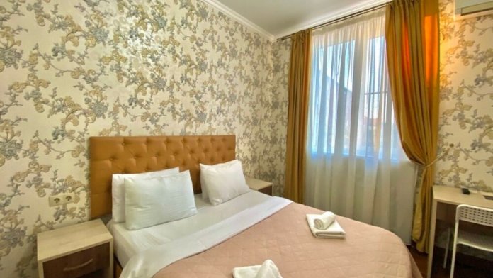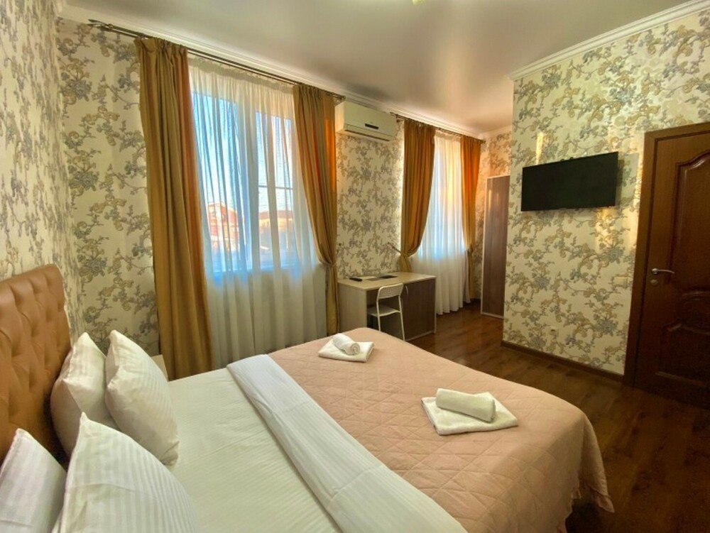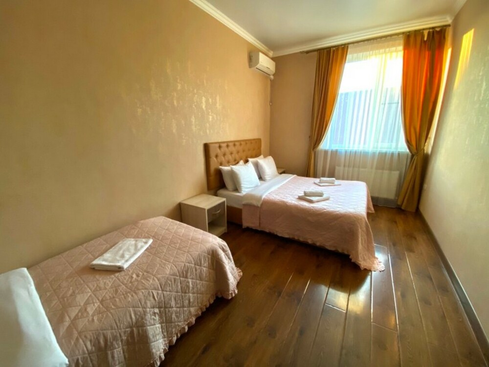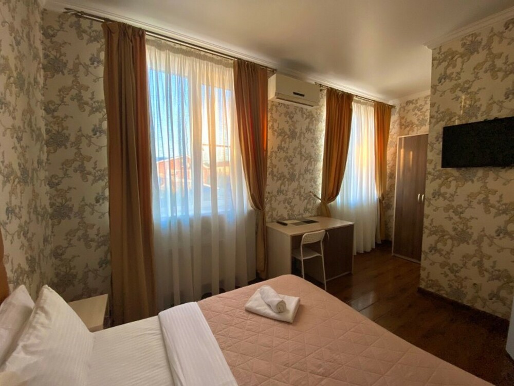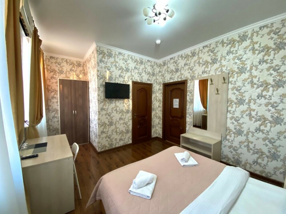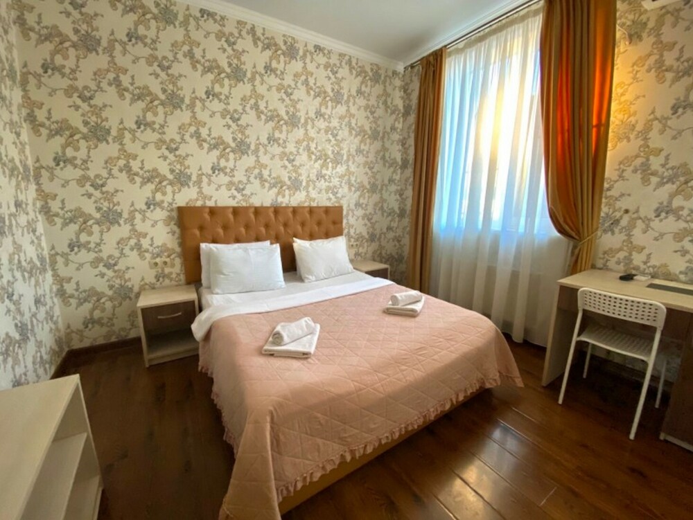 Гостей ждут современные комфортабельные номера с видом на улицу и город, которые оснащены кондиционером, телевизором. Есть отопление, холодильник, чайник, стол рабочий и туалетный, посуда, столовые приборы, Wi-Fi.