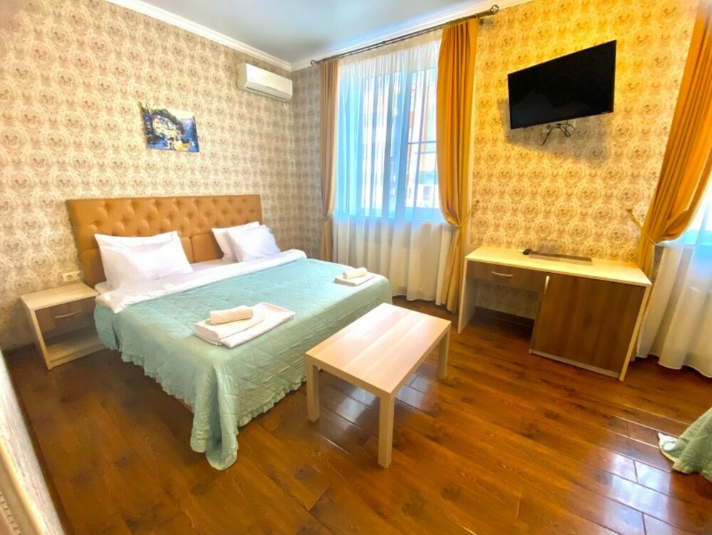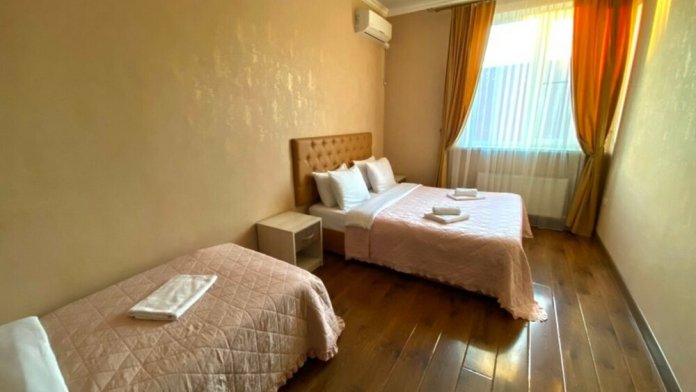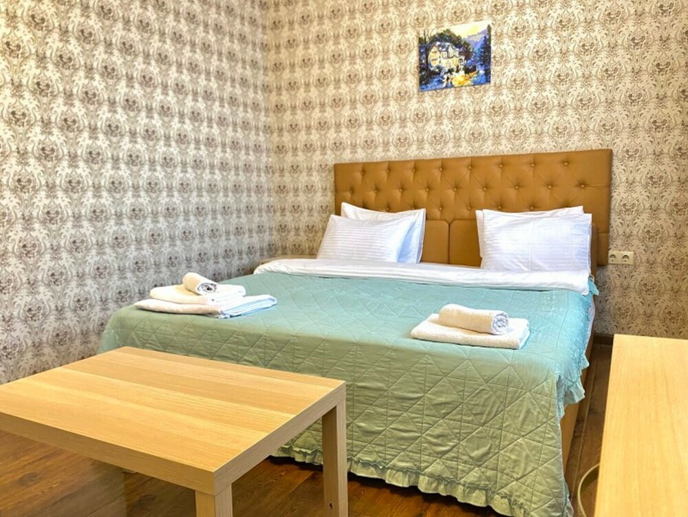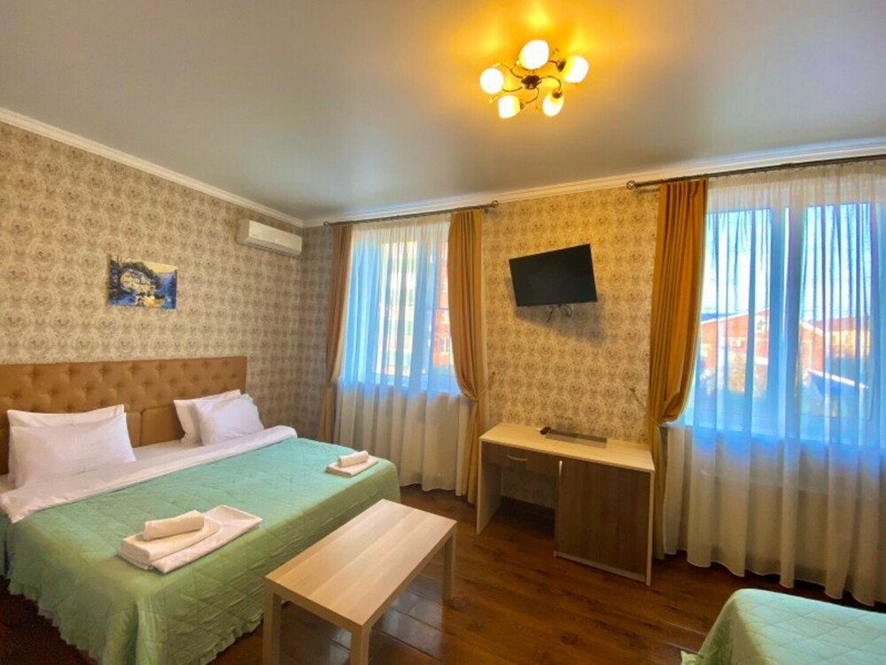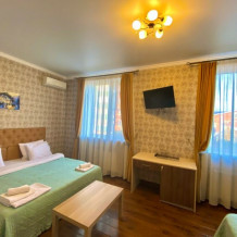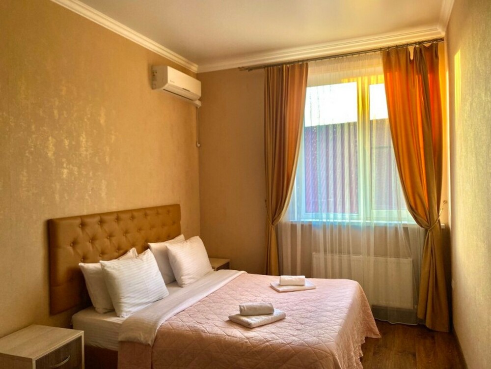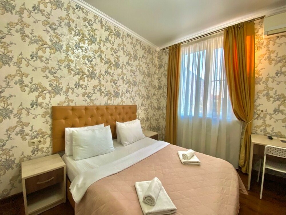 Гостей ждут современные комфортабельные номера с видом на улицу и город, которые оснащены кондиционером, телевизором. Есть отопление, холодильник, чайник, стол рабочий и туалетный, посуда, столовые приборы, Wi-Fi.