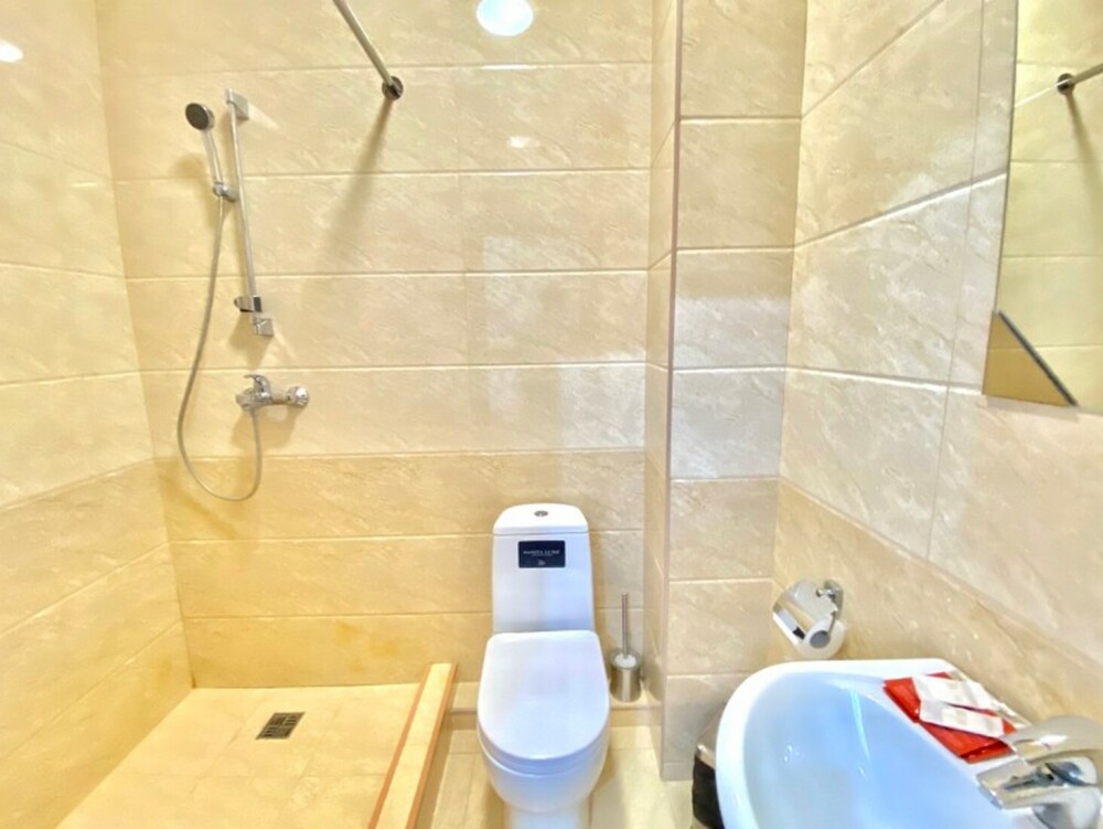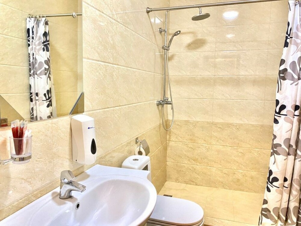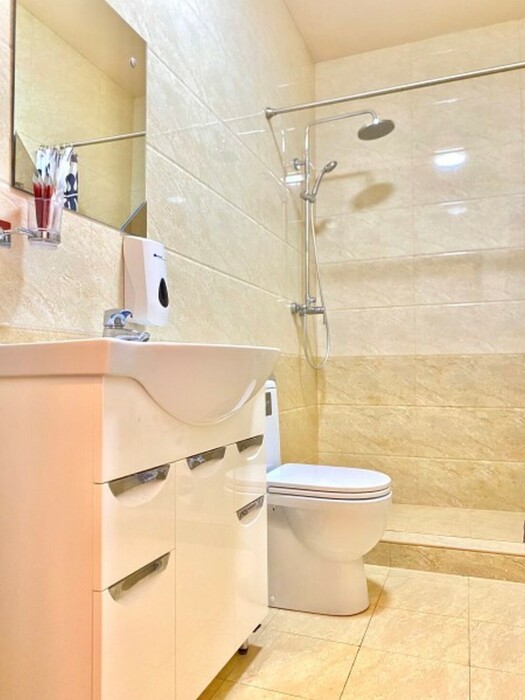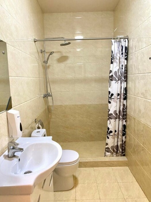 Индивидуальная ванная комната: душ, раковина, туалет.