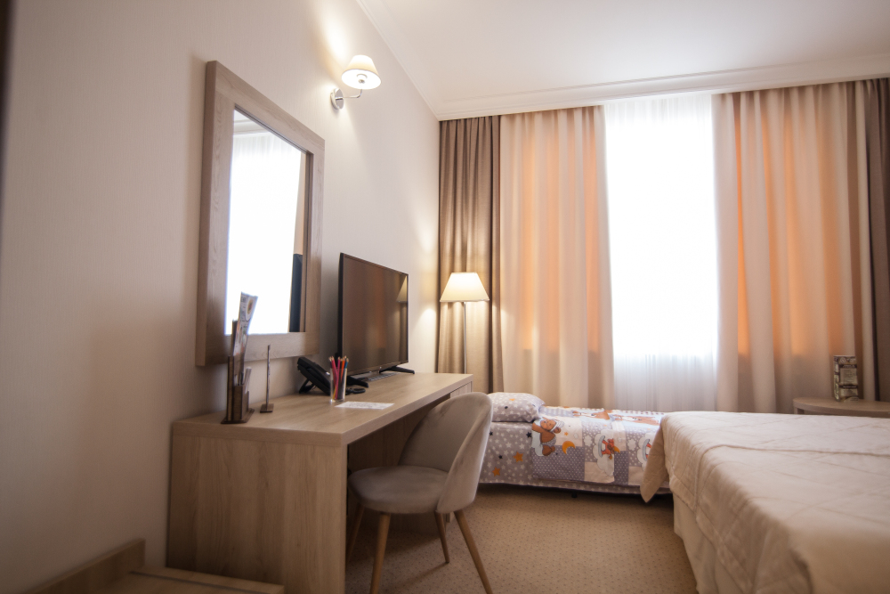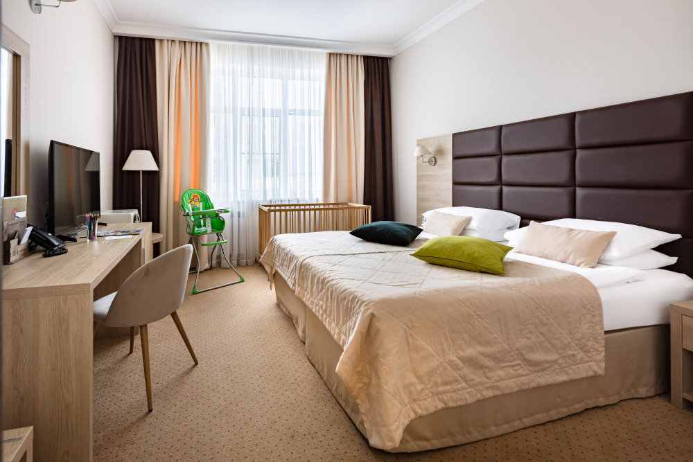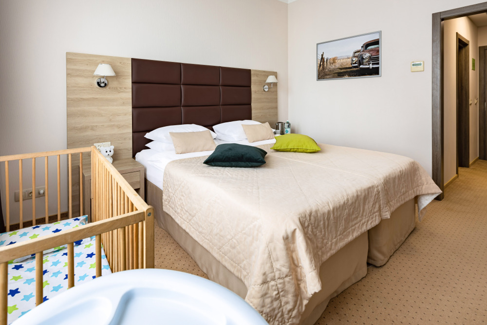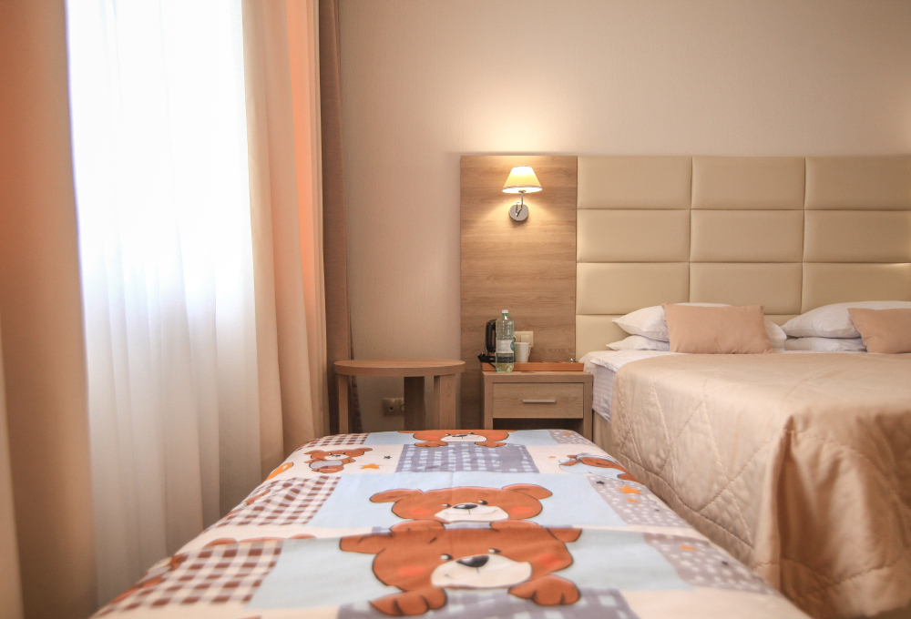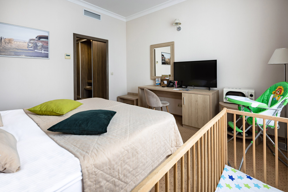 Родителей, путешествующих с маленькими детьми, порадует номер Комфорт «Family». Это просторная комната с хорошим освещением, с мягкими уголками на мебели для безопасности ваших деток.