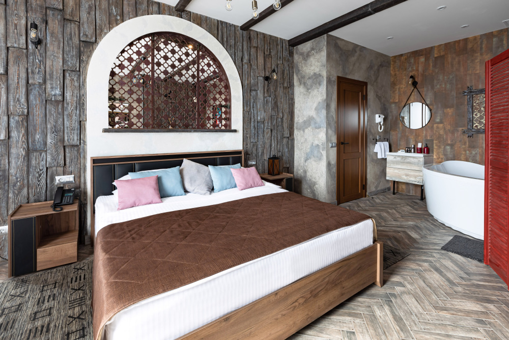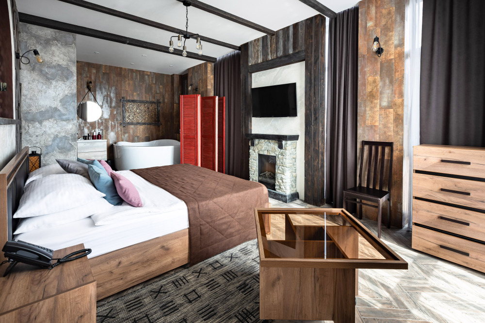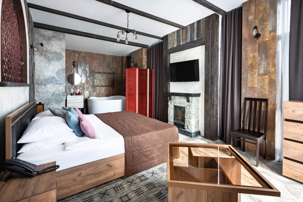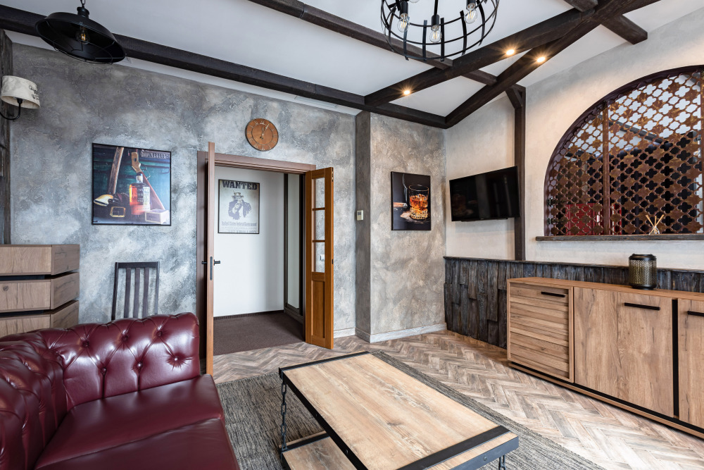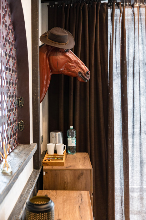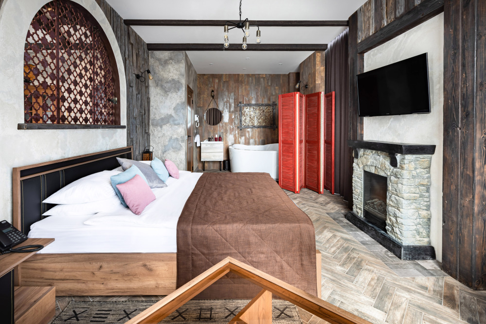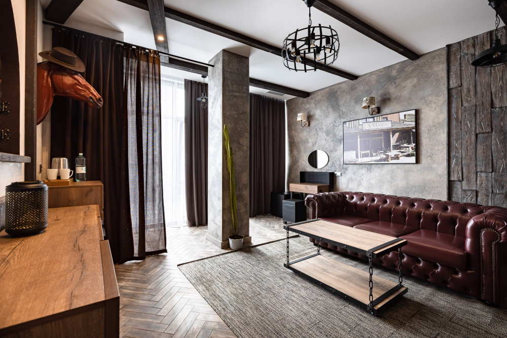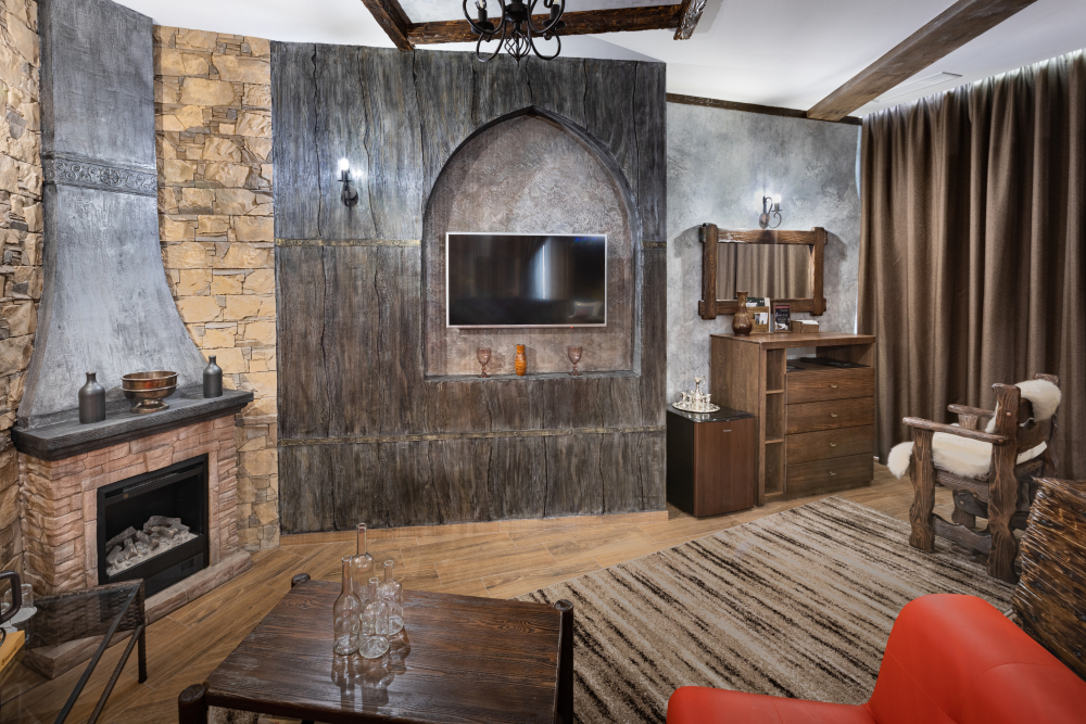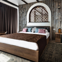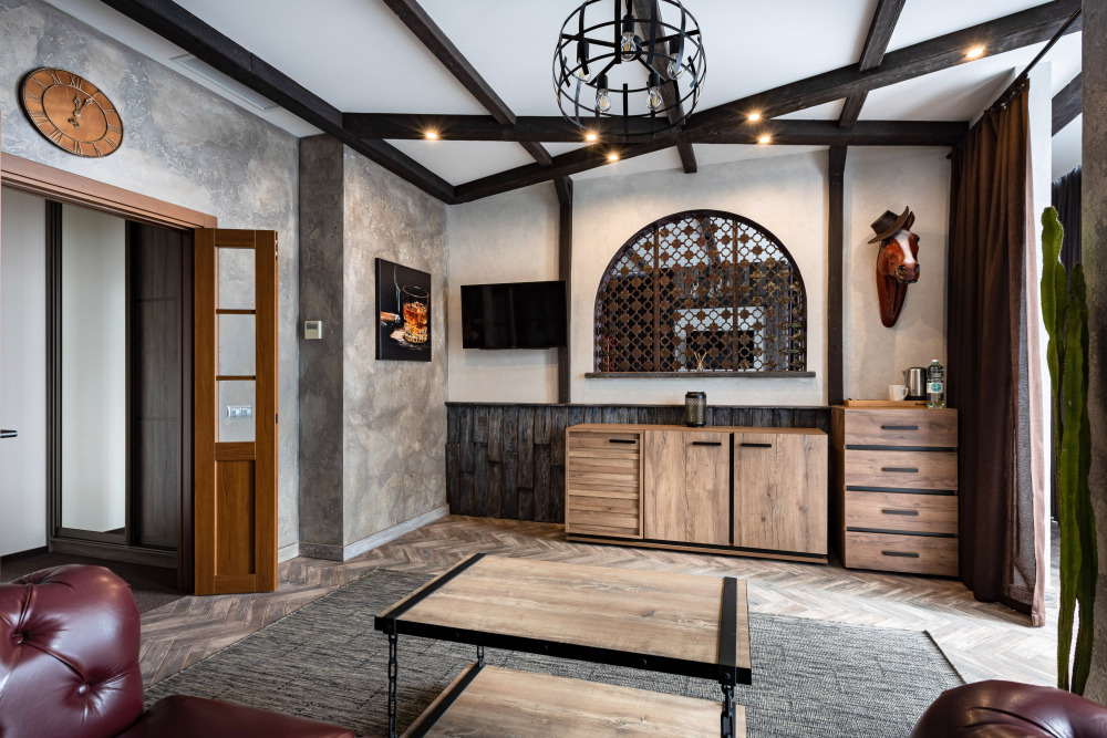 Номер в Юго-западном стиле «Вестерн» включает в себя романтику захватывающих приключений и непредсказуемость развития событий, присущее Дикому-Западу XIX века. Особенностью в оформлении номера является сочетание необработанного камня и дерева. Отделка стен гармонично сливается воедино с массивными предметами интерьера: широкими балками раскинутыми по потолку, каменным камином, твердостоящей колонной.