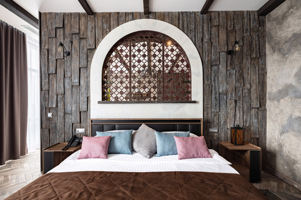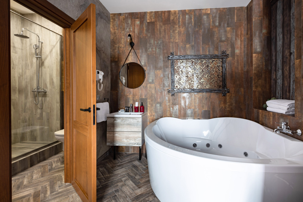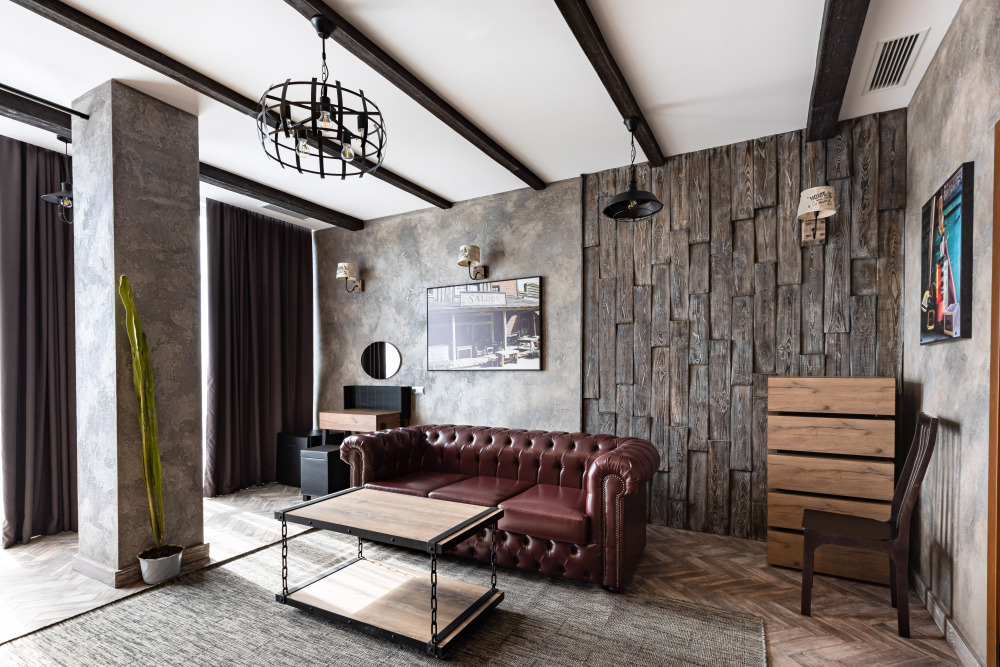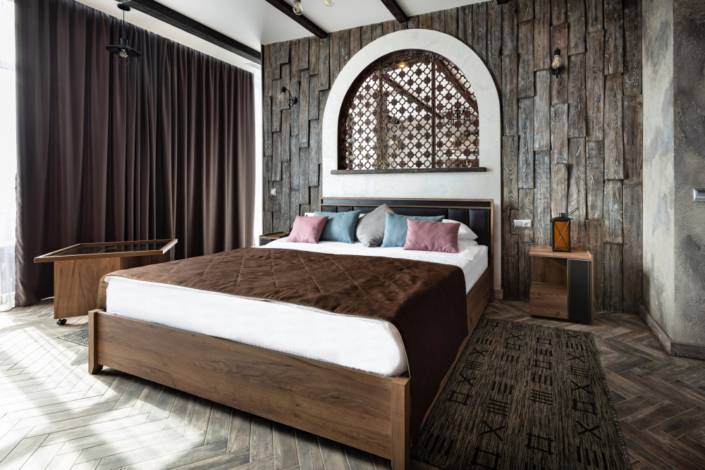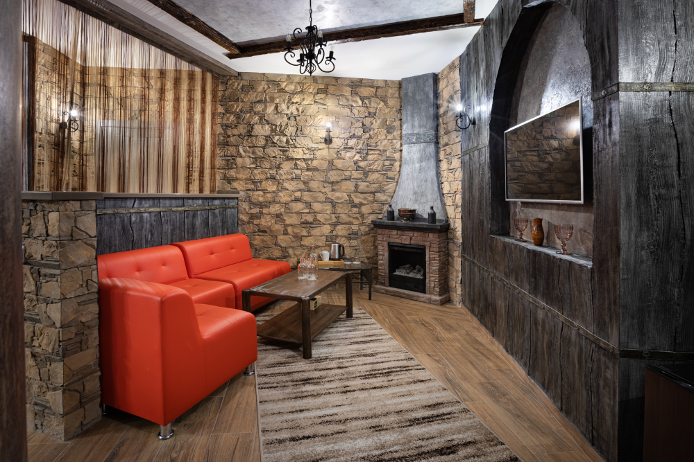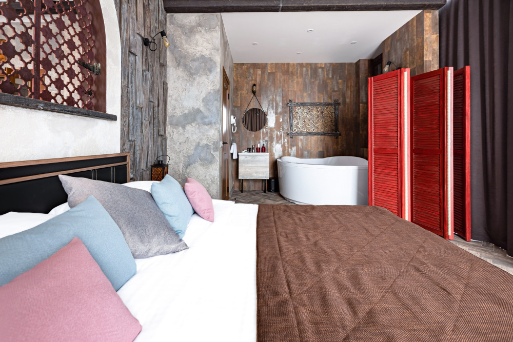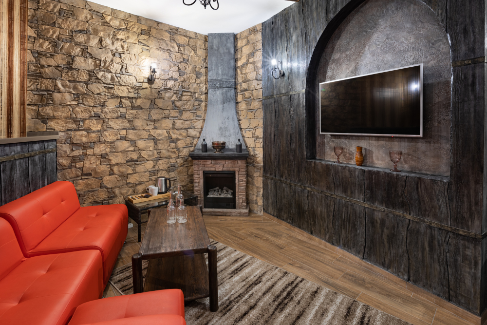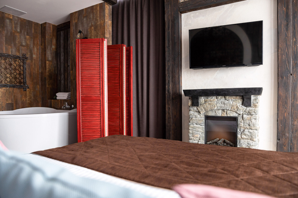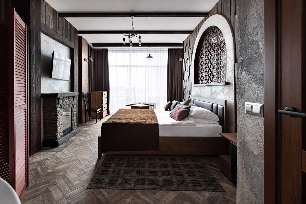 Номер в Юго-западном стиле «Вестерн» включает в себя романтику захватывающих приключений и непредсказуемость развития событий, присущее Дикому-Западу XIX века. Особенностью в оформлении номера является сочетание необработанного камня и дерева. Отделка стен гармонично сливается воедино с массивными предметами интерьера: широкими балками раскинутыми по потолку, каменным камином, твердостоящей колонной.