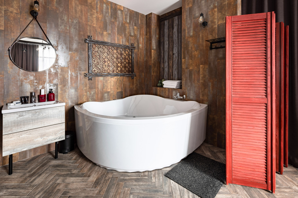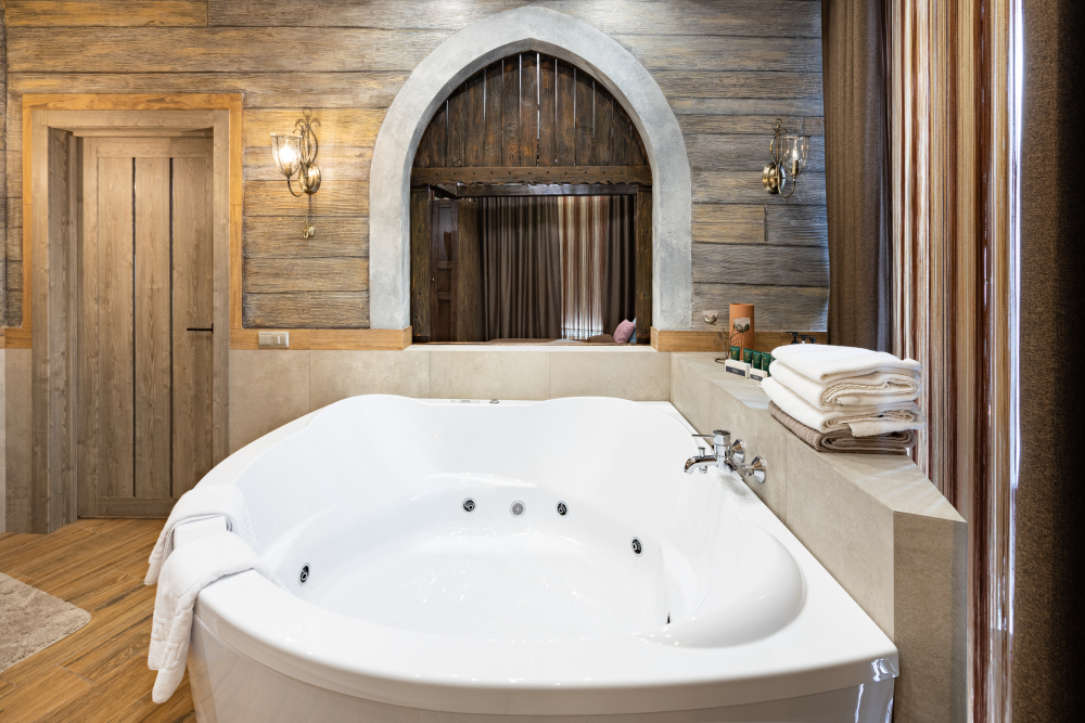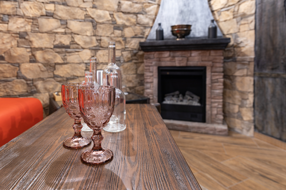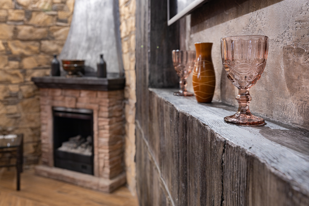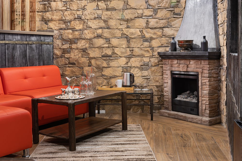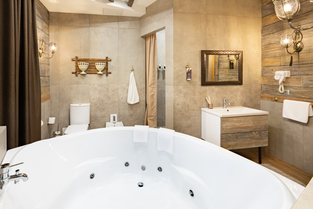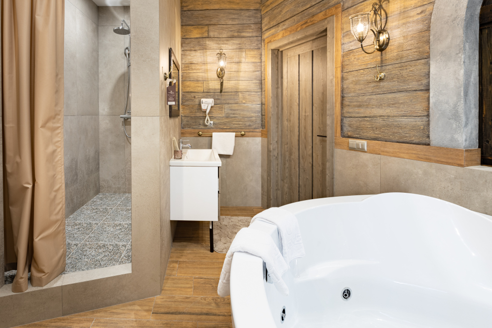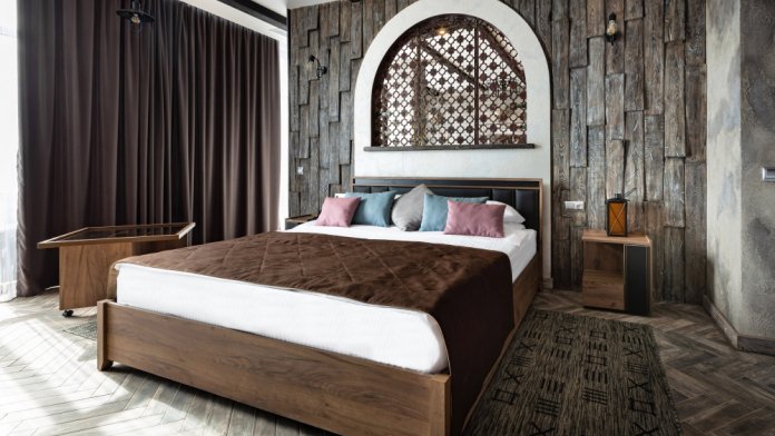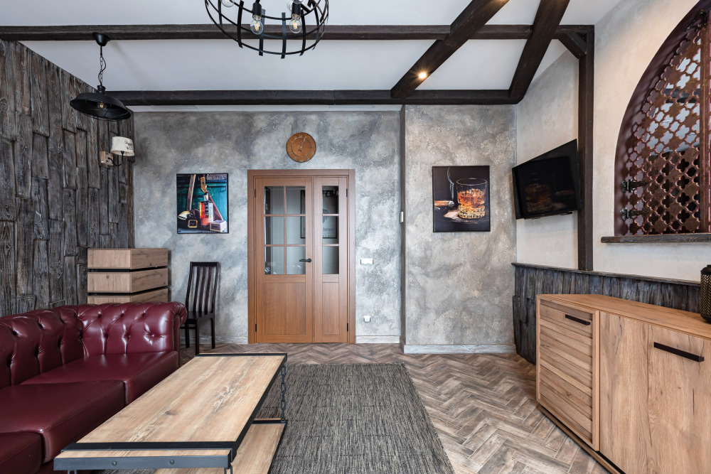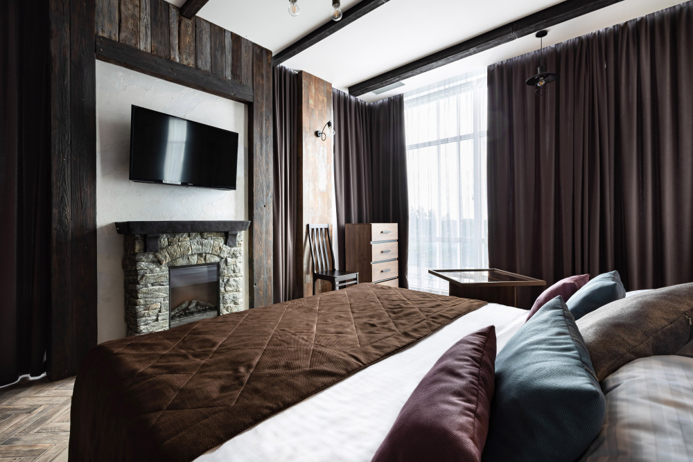 Номер в Юго-западном стиле «Вестерн» включает в себя романтику захватывающих приключений и непредсказуемость развития событий, присущее Дикому-Западу XIX века. Особенностью в оформлении номера является сочетание необработанного камня и дерева. Отделка стен гармонично сливается воедино с массивными предметами интерьера: широкими балками раскинутыми по потолку, каменным камином, твердостоящей колонной.