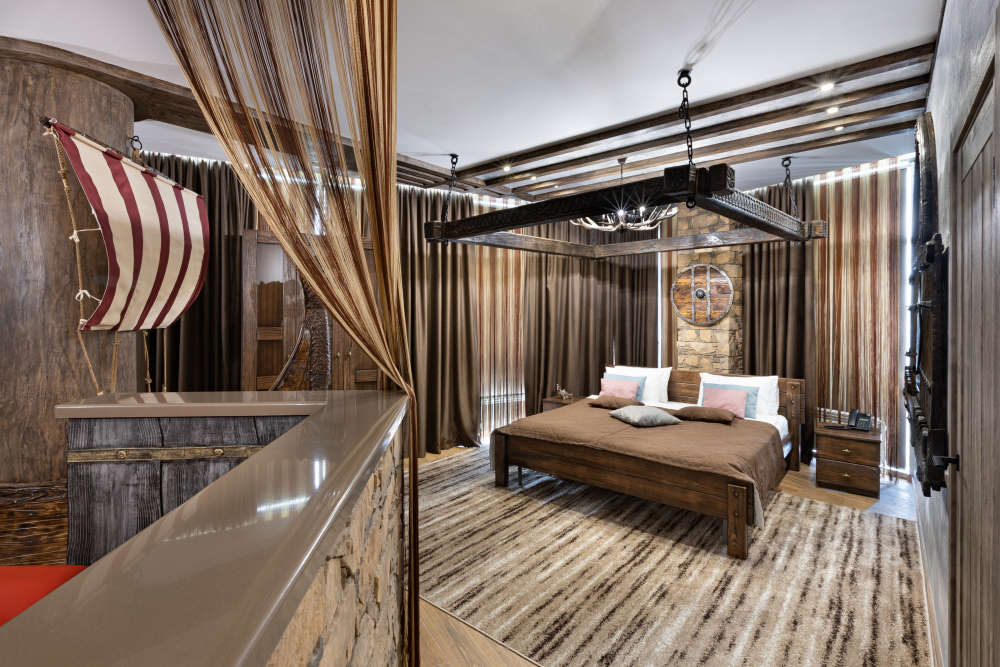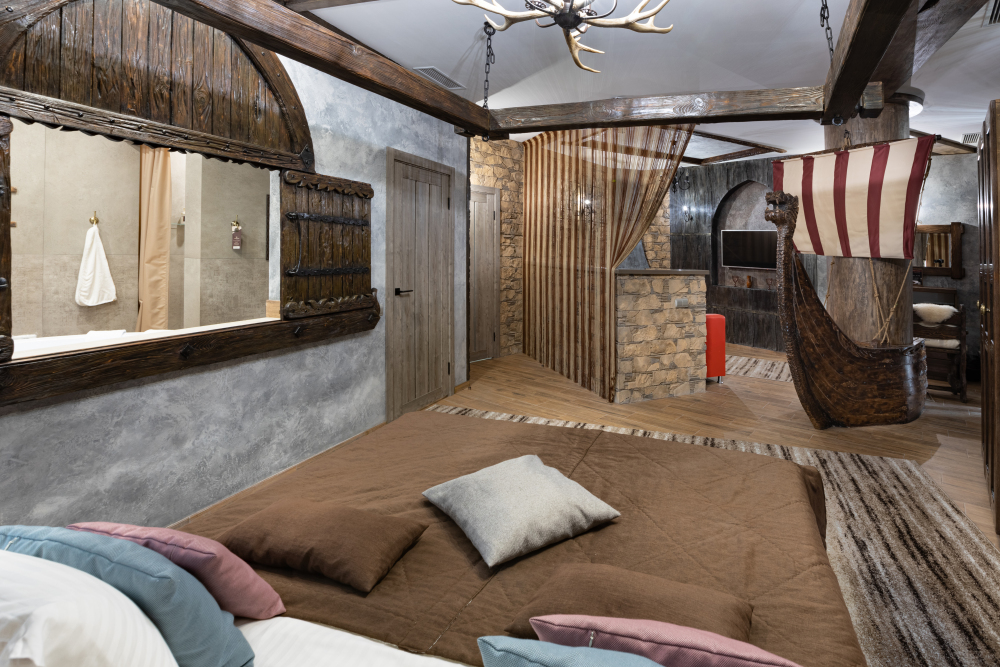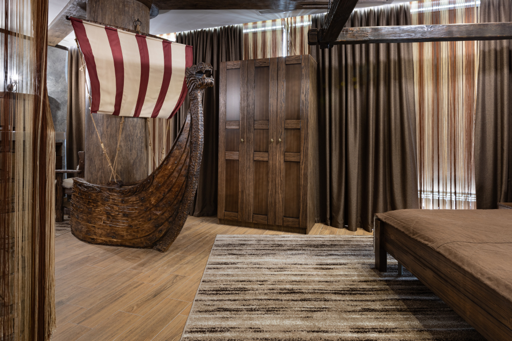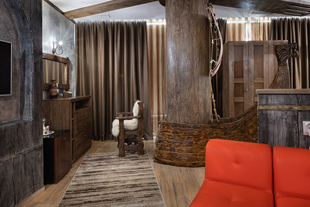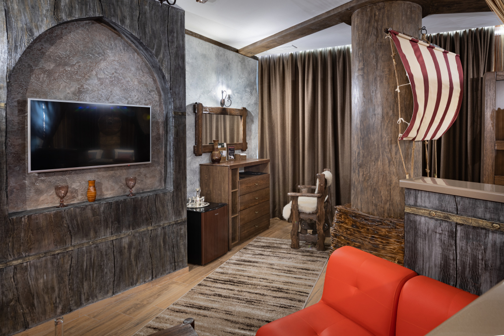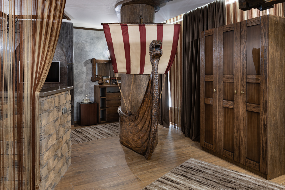 Номер погружает гостя в непередаваемую атмосферу VIII-XI веков нашей эры . Этот стиль интерьера с чистыми красками, натуральными материалами, руническими элементами переносит Вас в древнюю скандинавскую сагу. Массив сосны и ольхи, однотонная льняная ткань, мех, замша, камень, метал и прозрачное стекло, напоминающие об эпохе суровых викингов-все это выглядит впечатляюще и реально только в нашем дизайнерском номере «Викинг».