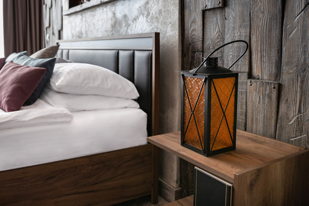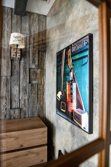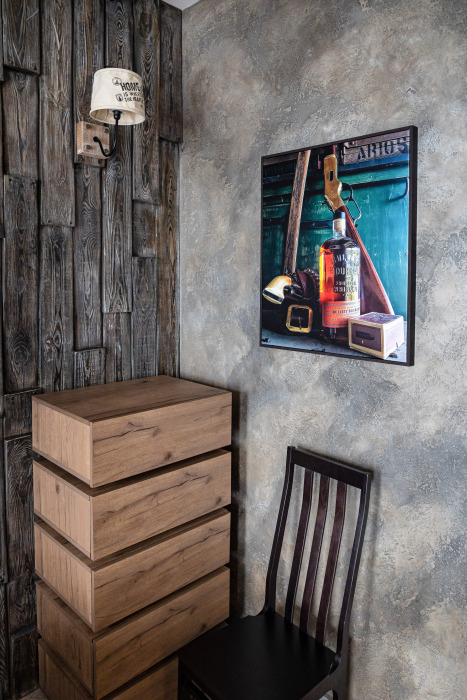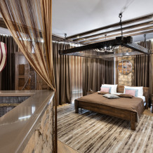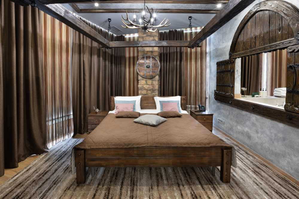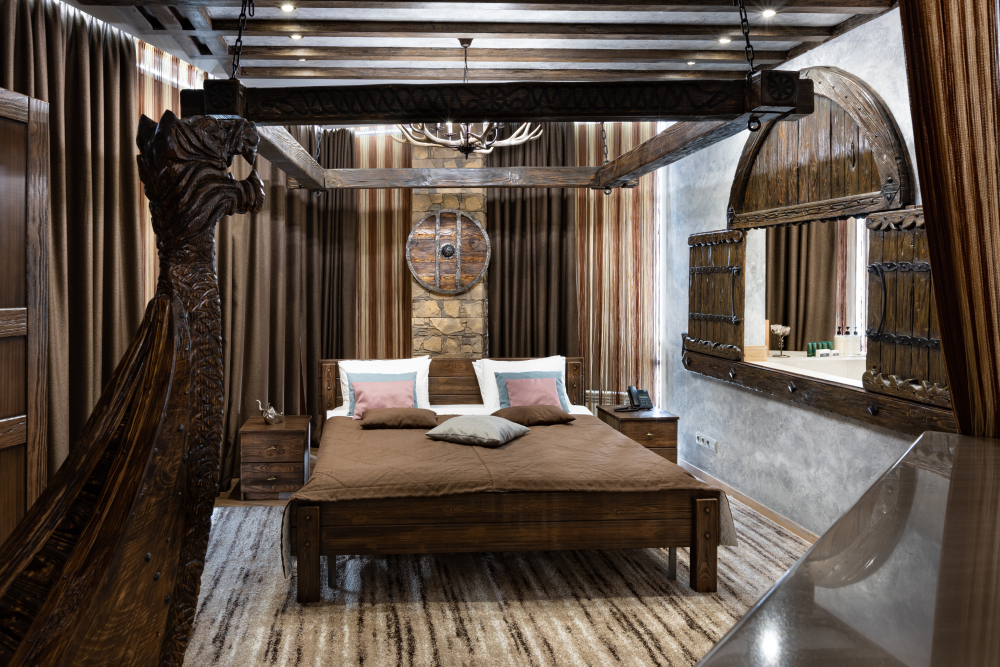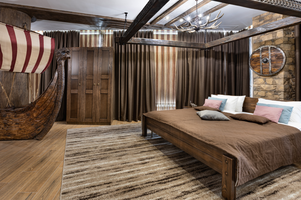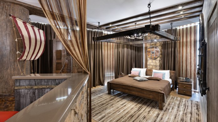 Номер погружает гостя в непередаваемую атмосферу VIII-XI веков нашей эры . Этот стиль интерьера с чистыми красками, натуральными материалами, руническими элементами переносит Вас в древнюю скандинавскую сагу. Массив сосны и ольхи, однотонная льняная ткань, мех, замша, камень, метал и прозрачное стекло, напоминающие об эпохе суровых викингов-все это выглядит впечатляюще и реально только в нашем дизайнерском номере «Викинг».