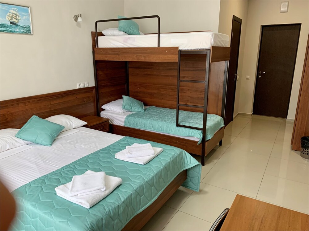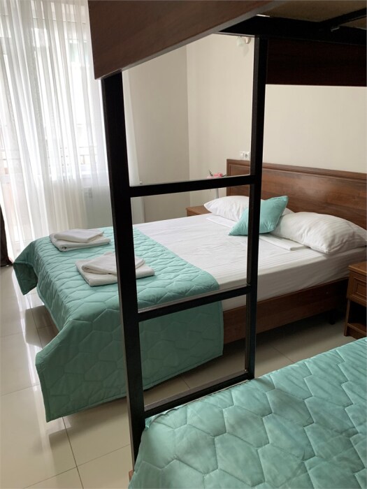 Номере категории «Четырехместный стандарт с балконом» гостям предлагается размещение с двуспальной кроватью и одной двухъярусной кроватью.