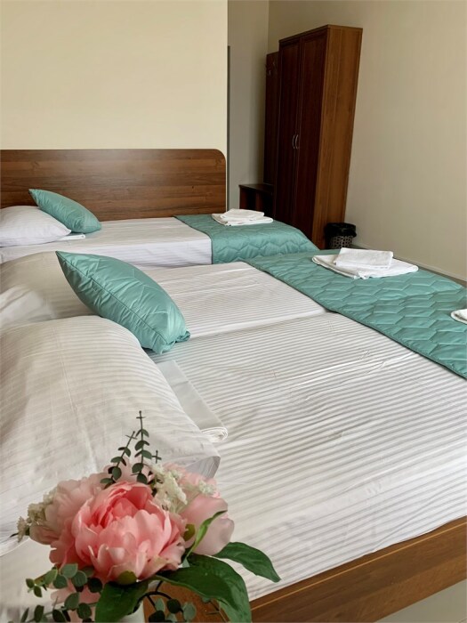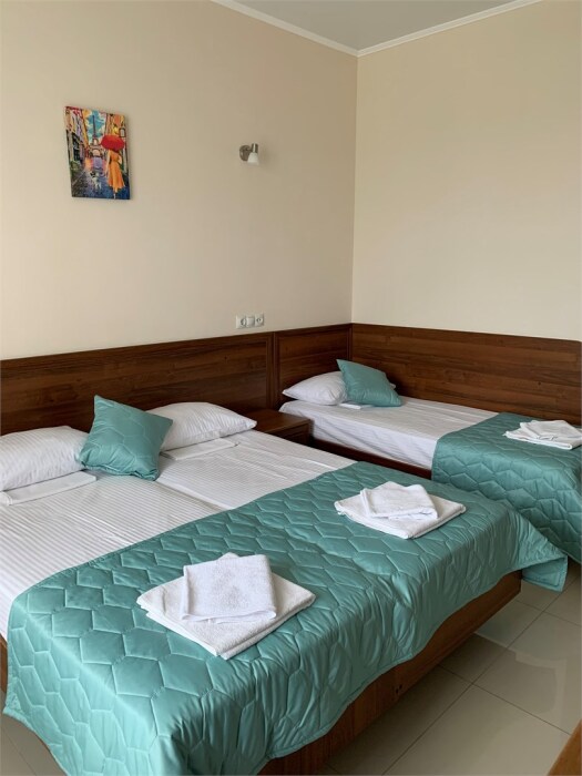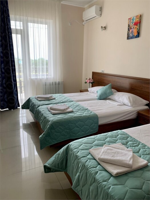 В номере категории «Трехместный стандарт с балконом» гостям предлагается размещение с одной двуспальной и одной односпальной кроватью или тремя односпальными (на выбор).
