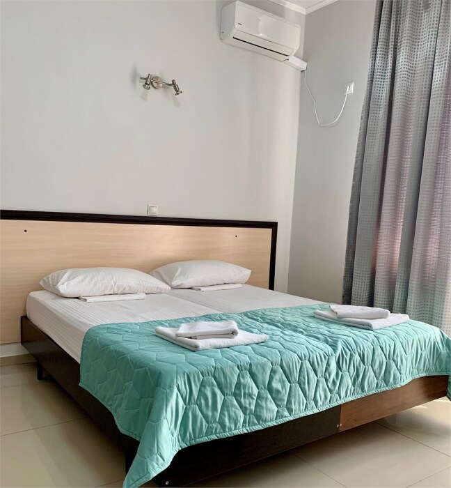 В номере категории «Двухместный стандарт без балкона» гостям предлагается размещение с одной двуспальной или двумя односпальными (на выбор) кроватями.