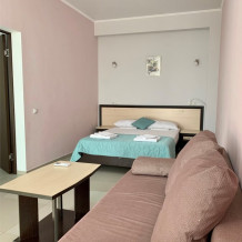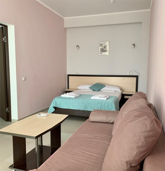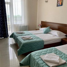 Комфортабельный двухкомнатный уютный номер. В номере категории «Пятиместный стандарт с балконом» гостям предлагается размещение с одной двуспальной и двумя односпальными кроватями, диван.