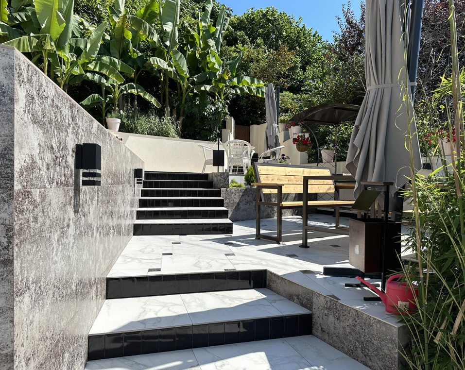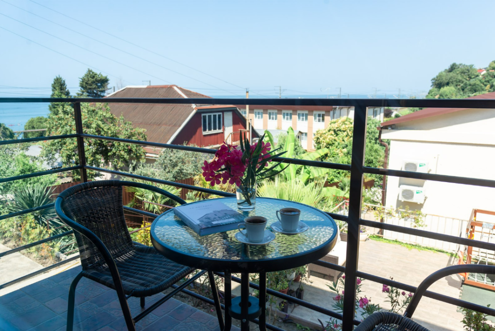 Панорамные окна с видом на море и видовой балкон со столиком и стульями.