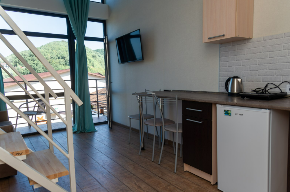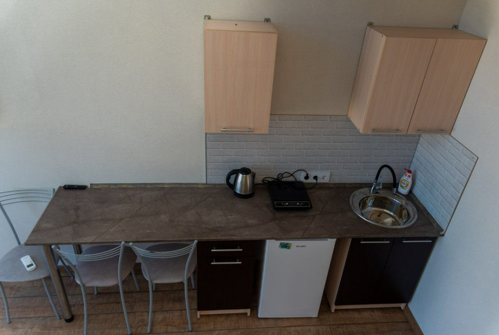 В номере телевизор с плоским экраном, небольшой холодильник, кондиционер, столик, стулья и прикроватные тумбочки. Полноценная кухня с плитой, раковиной, чайником и набором посуды.
