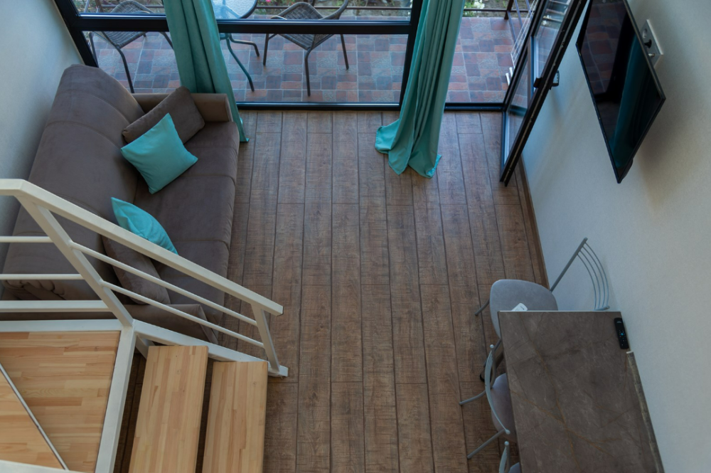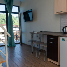 Апартаменты расположены в отдельном здании и состоят из двух уровней - на антресоли расположена большая двуспальная кровать или две односпальные кровати (по желанию). На нижнем уровне расположен диван и мини-кухня.