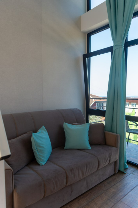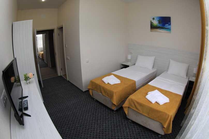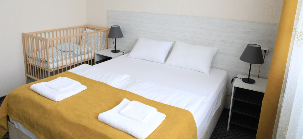 Номер состоит из двух комнат: большая двуспальная кровать или две односпальные кровати (по желанию) и небольшой диванчик, есть мини-кухня с СВЧ-печью. Данный номер отлично подойдет для семьи с двумя детьми. В комплектацию номера входит также 2 телевизора с плоским экраном, небольшой холодильник, сейф, 2 кондиционера, столик, стулья и прикроватные тумбочки. Санузел с душевой кабиной, раковиной, унитазом и феном в каждом номере. В каждом номере есть небольшой «французский» балкончик для сушки белья и пляжных принадлежностей. Расположен на втором этаже.