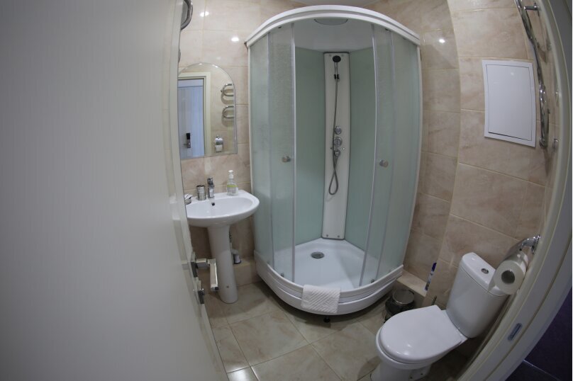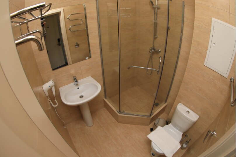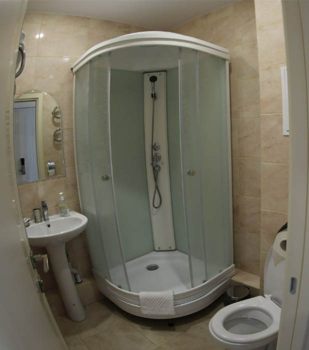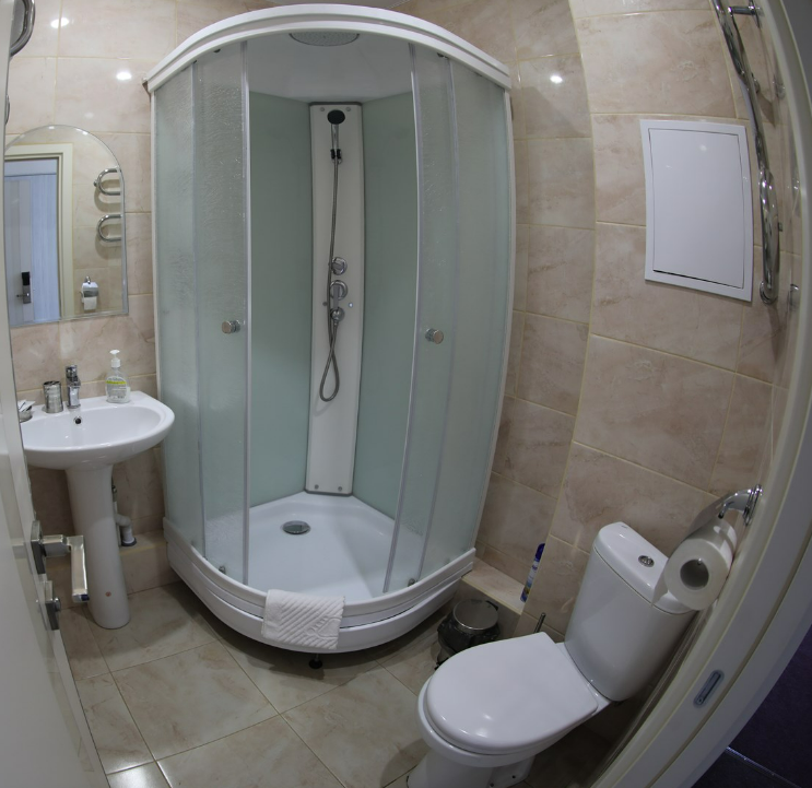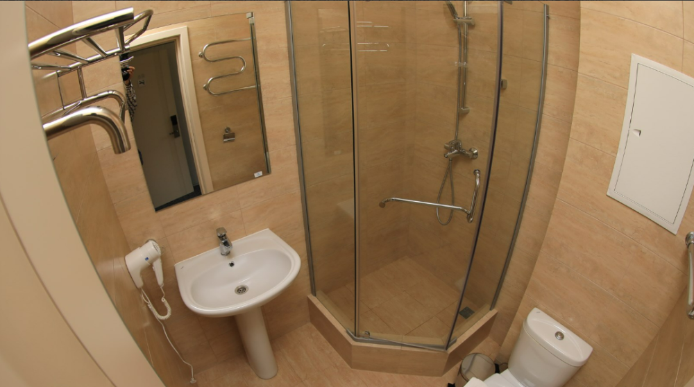 Санузел с душевой кабиной, раковиной, унитазом и феном в каждом апартаменте.