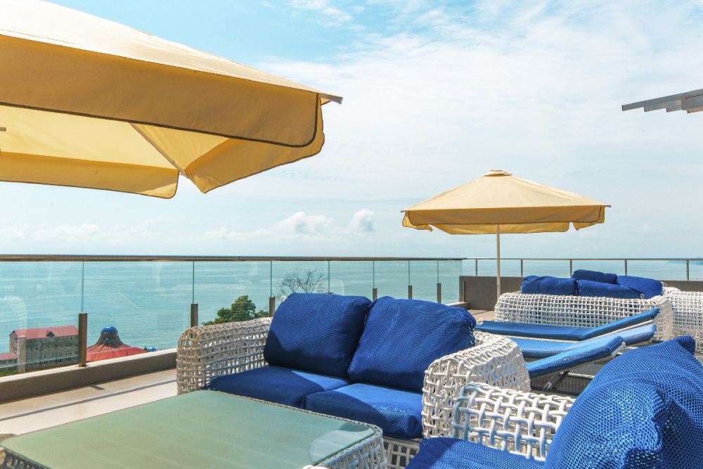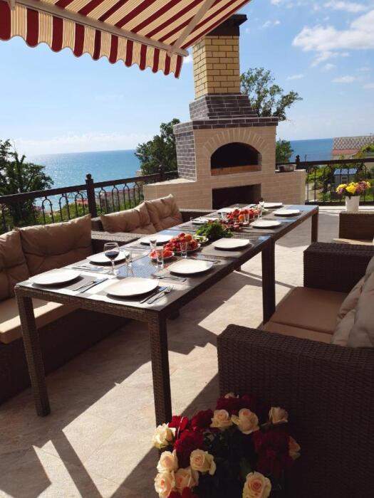 Комфортная мягкая мебель на открытой террасе с морским пейзажем добавит Вам особых впечатлений к вечернему ужину.