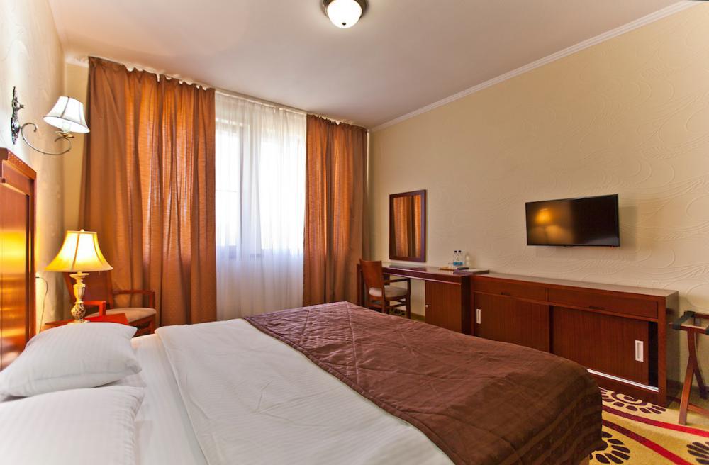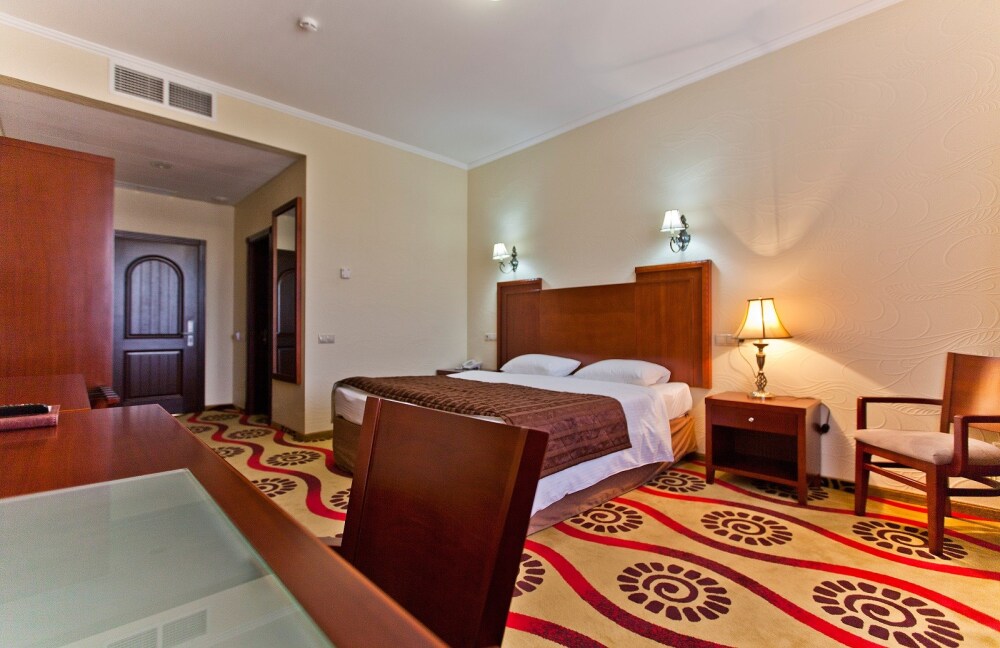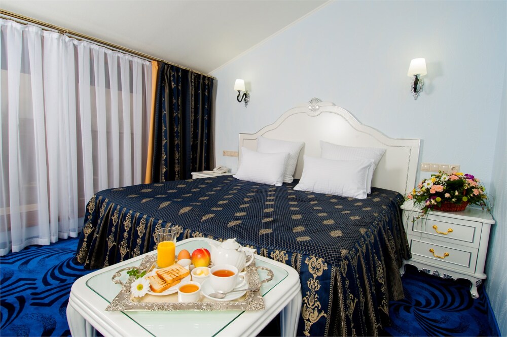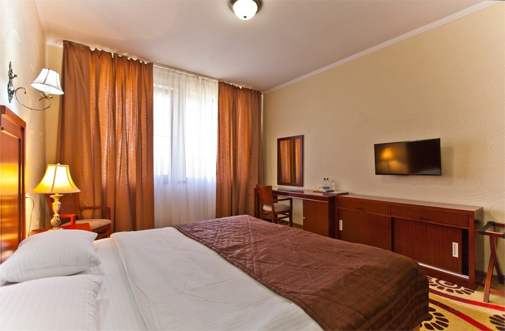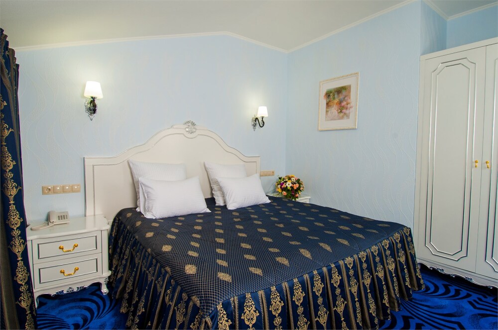 Двуспальная кровать, прикроватные тумбочки, ЖК-телевизор, телефон, письменный стол, мини-бар, сейф. Один ребёнок до 8 лет — можно без отдельного спального места.