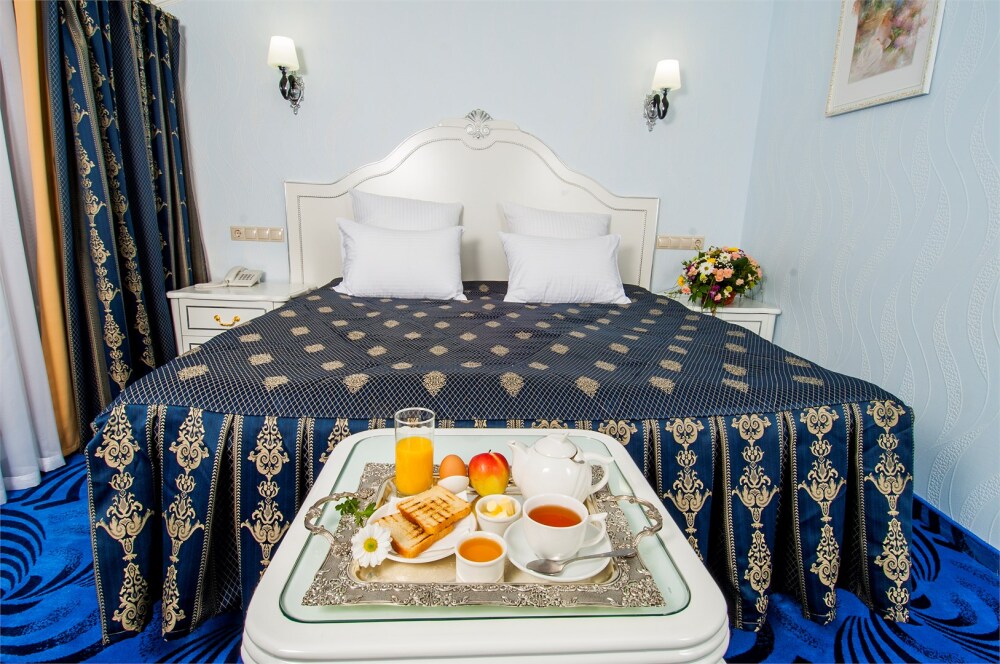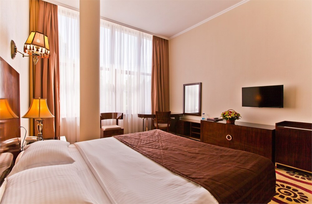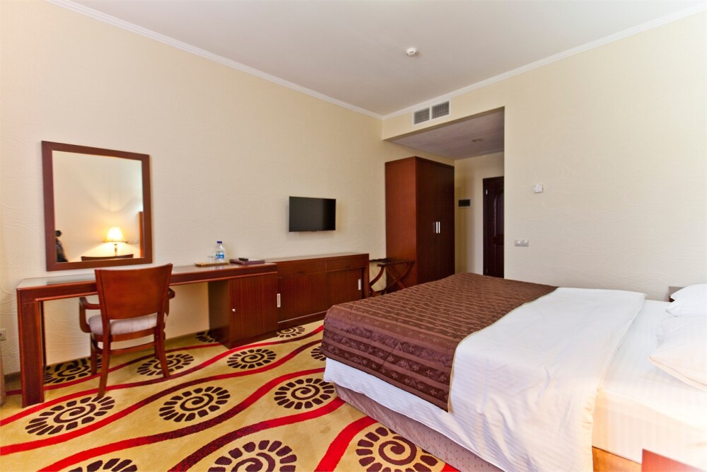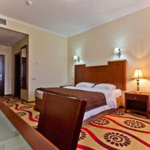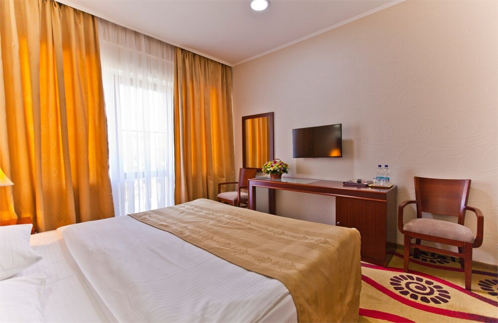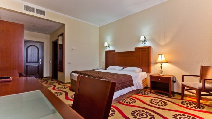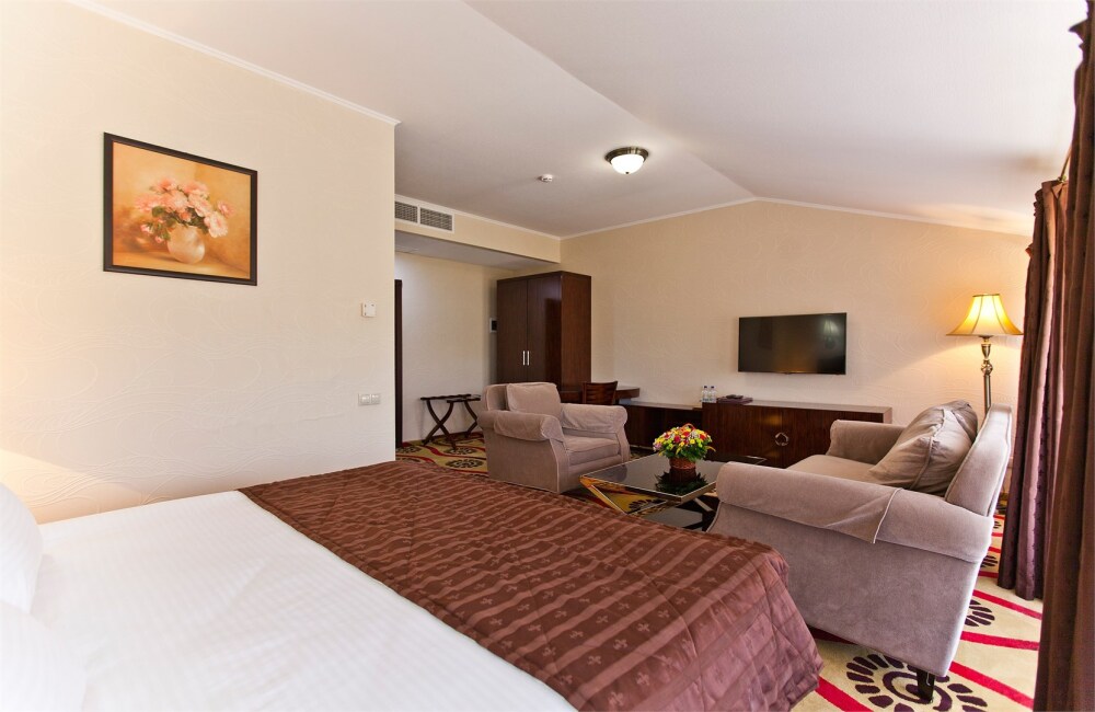 Двуспальная кровать, прикроватные тумбочки, ЖК-телевизор, телефон, письменный стол, мини-бар, сейф. Один ребёнок до 8 лет — можно без отдельного спального места.