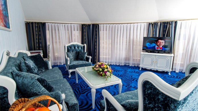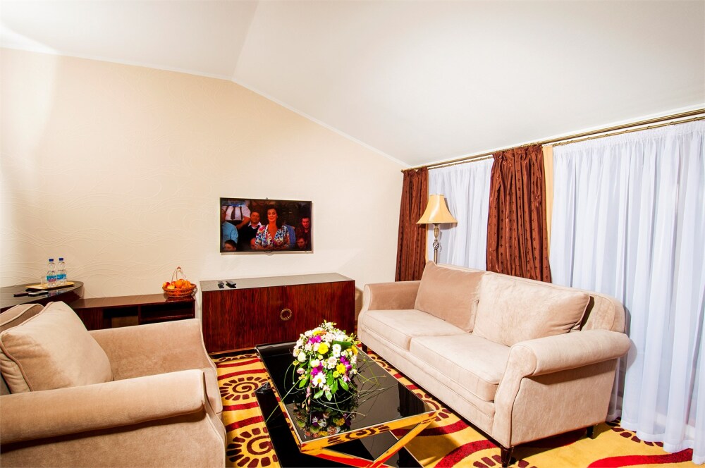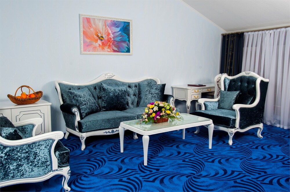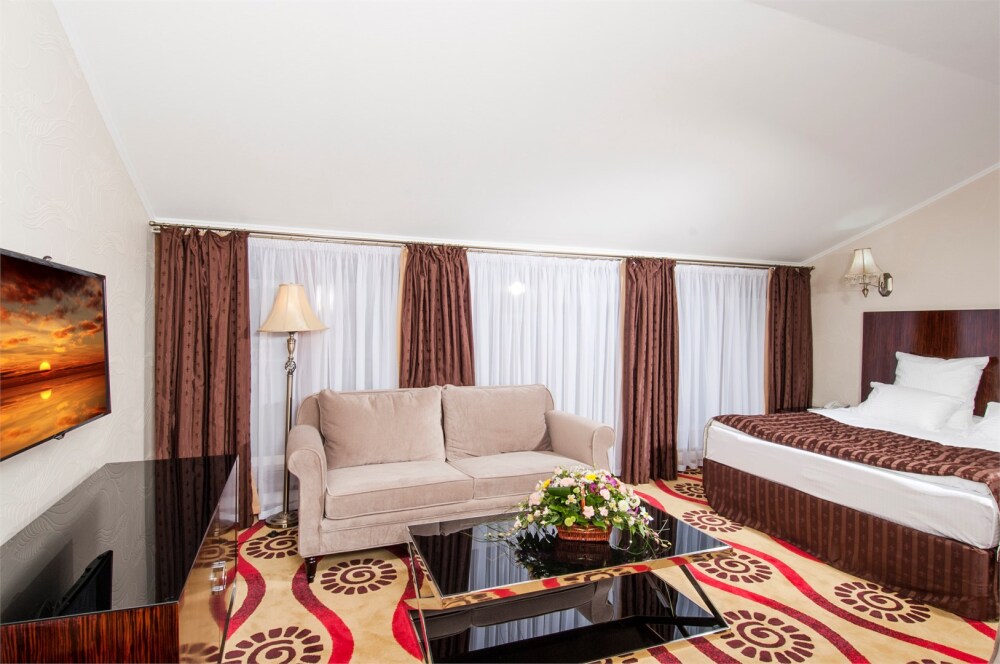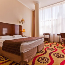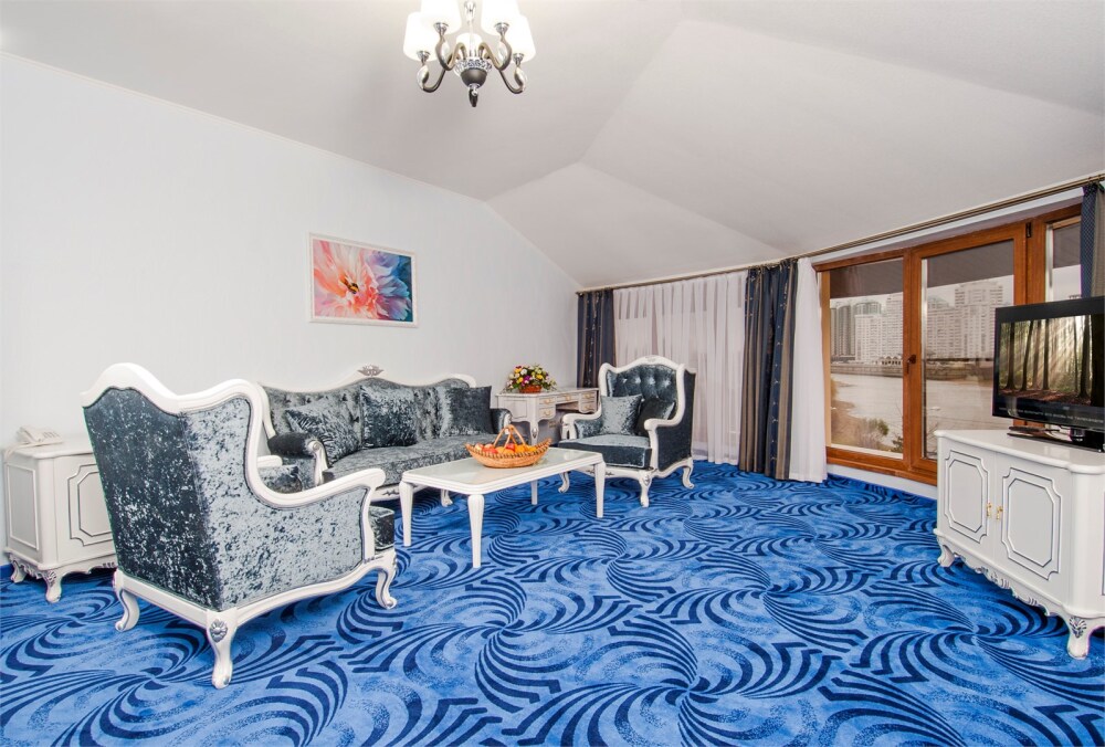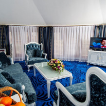 Люкс состоит из двух комнат (спальни и гостиной), очень компактной прихожей и прекрасно оборудованного санузла. Один ребёнок до 8 лет — можно без отдельного спального места.