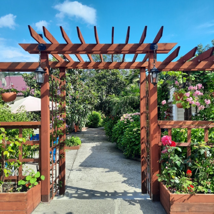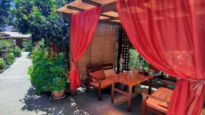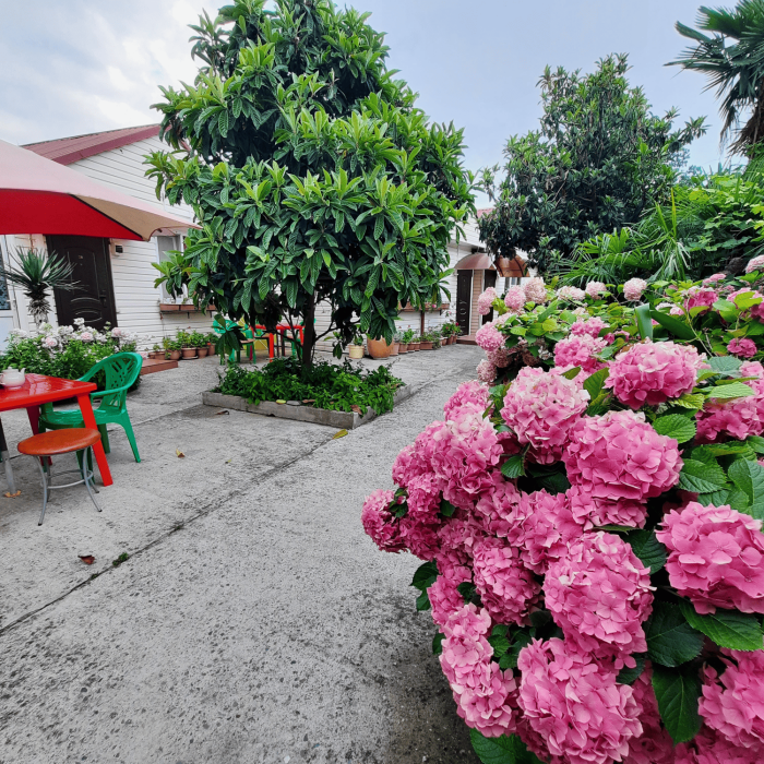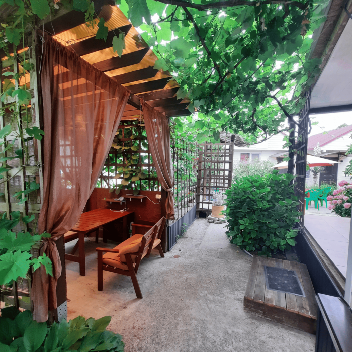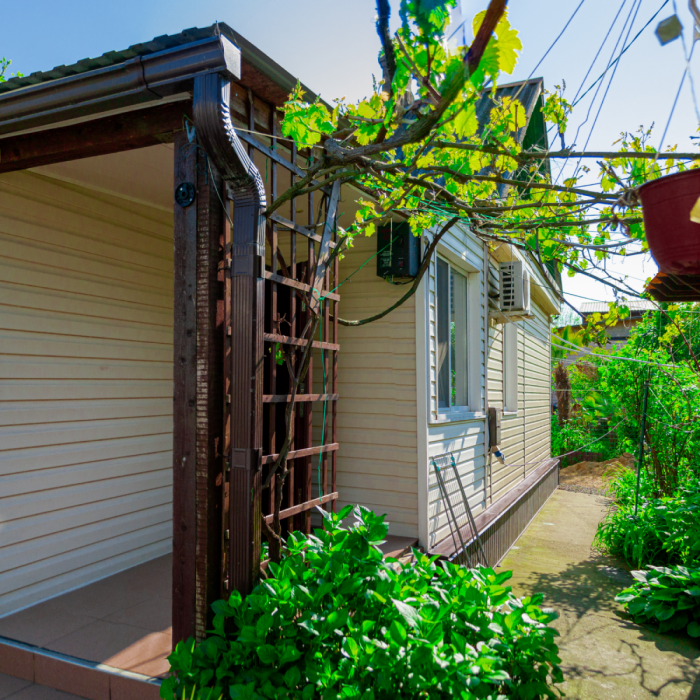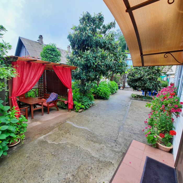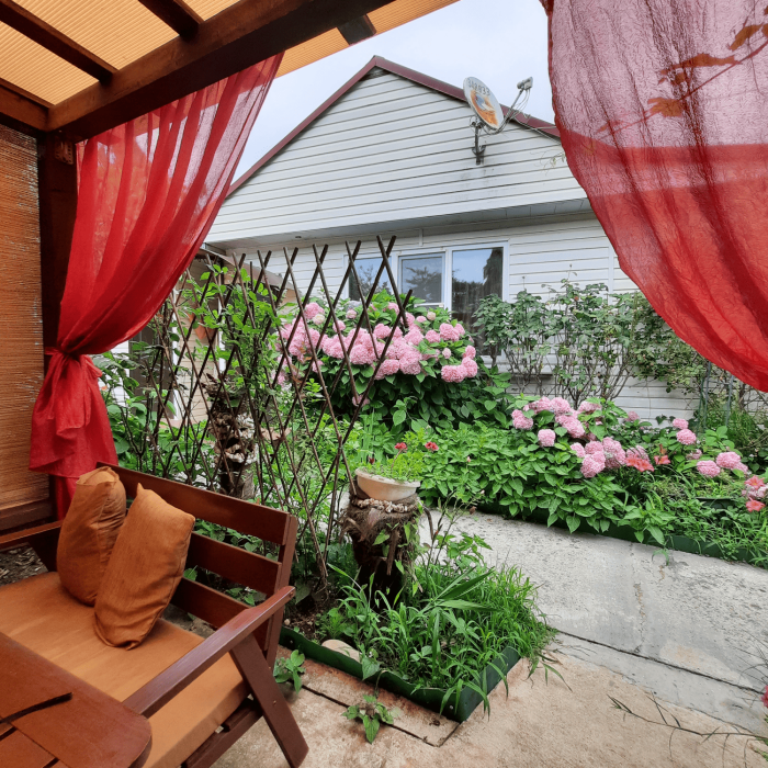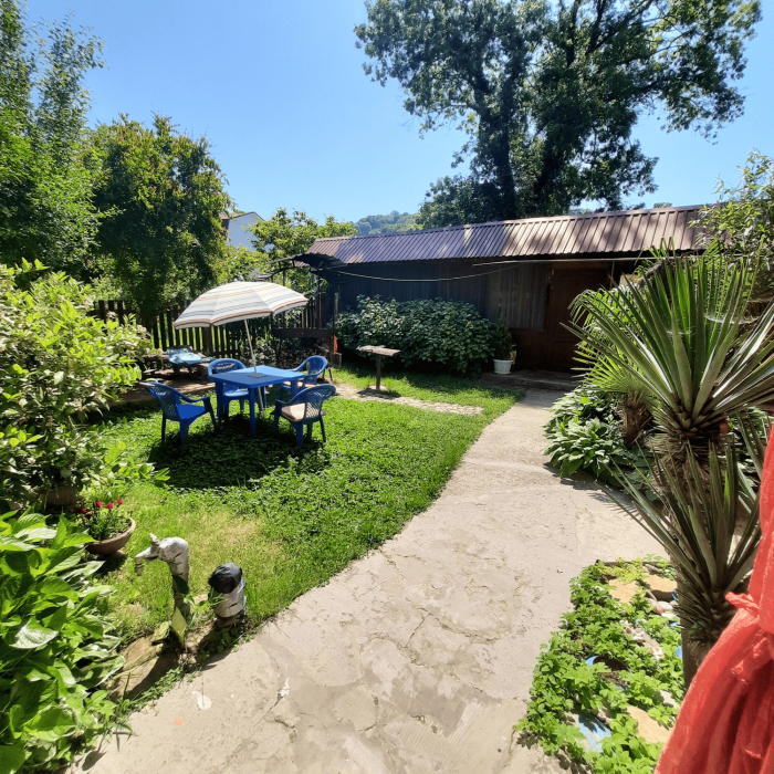 У нас есть восемь отдельно стоящих одноэтажных домиков, в каждом из которых есть всё необходимое для комфортного отдыха. Общая летняя кухня и мангал, беседки и шезлонги, детская комната с игрушками, библиотека, бильярдный и теннисный столы, цитрусовые деревья и цветочный сад — всё это доступно каждому нашему гостю.