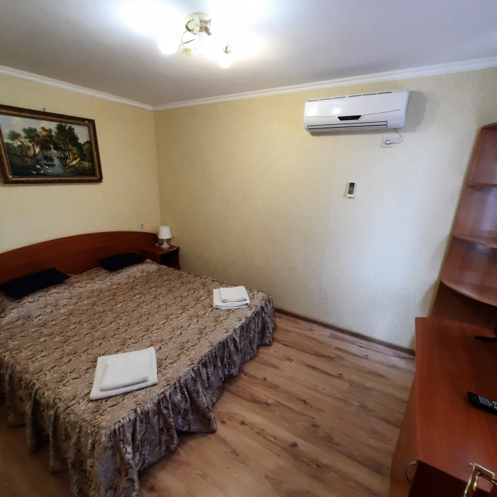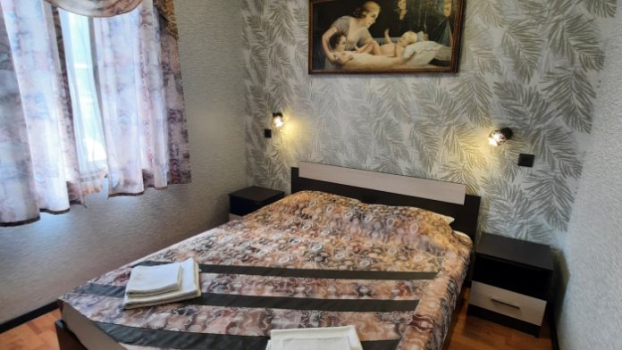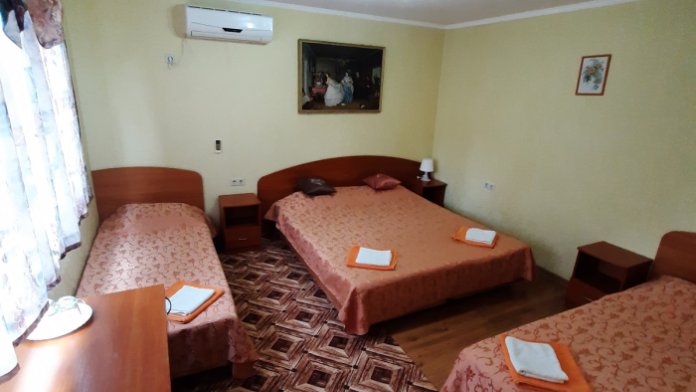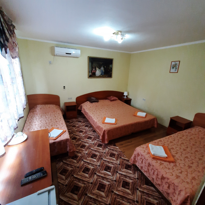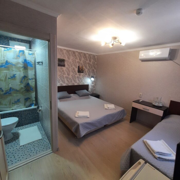 В номере две комнаты, одну из которых можно использовать как детскую. В вашем распоряжении душ, раковина, туалет, а также все необходимые гигиенические принадлежности. Для вашего комфорта в номере есть телевизор и холодильник. Общая летняя кухня позволяет самостоятельно готовить любимые блюда.