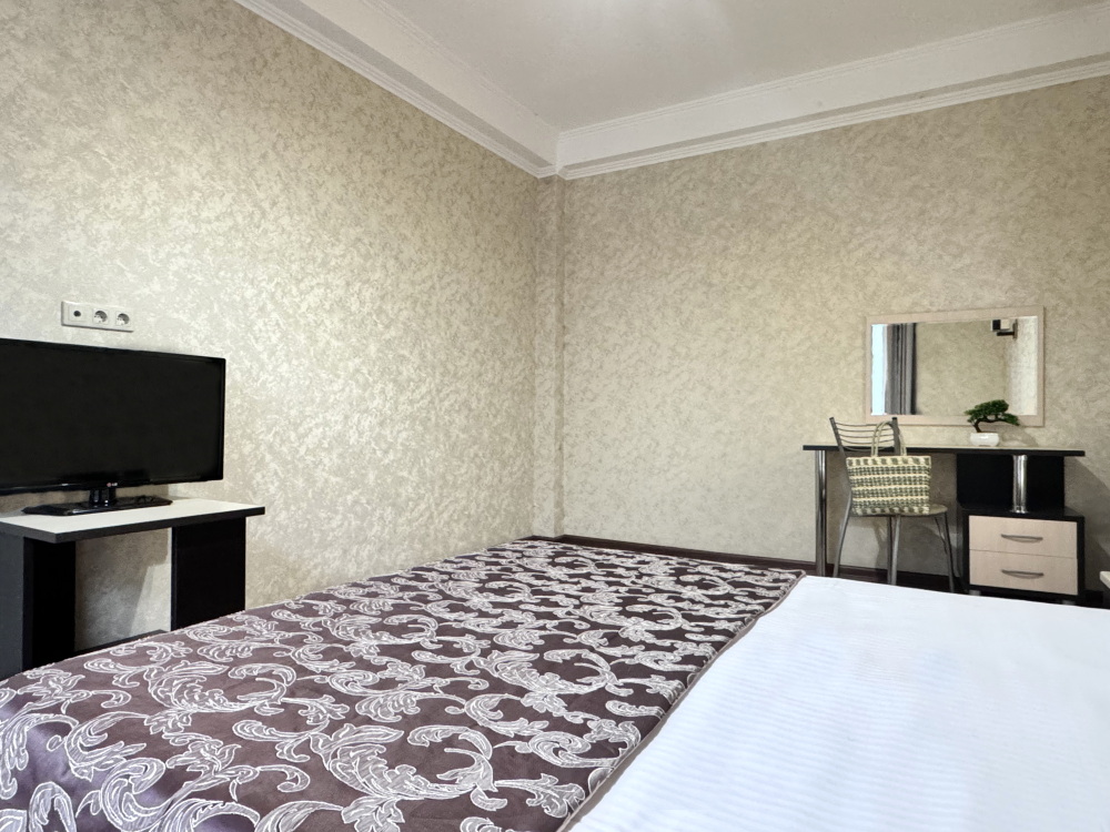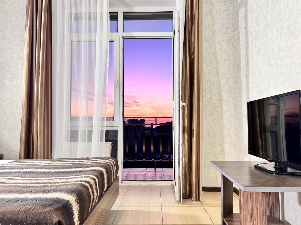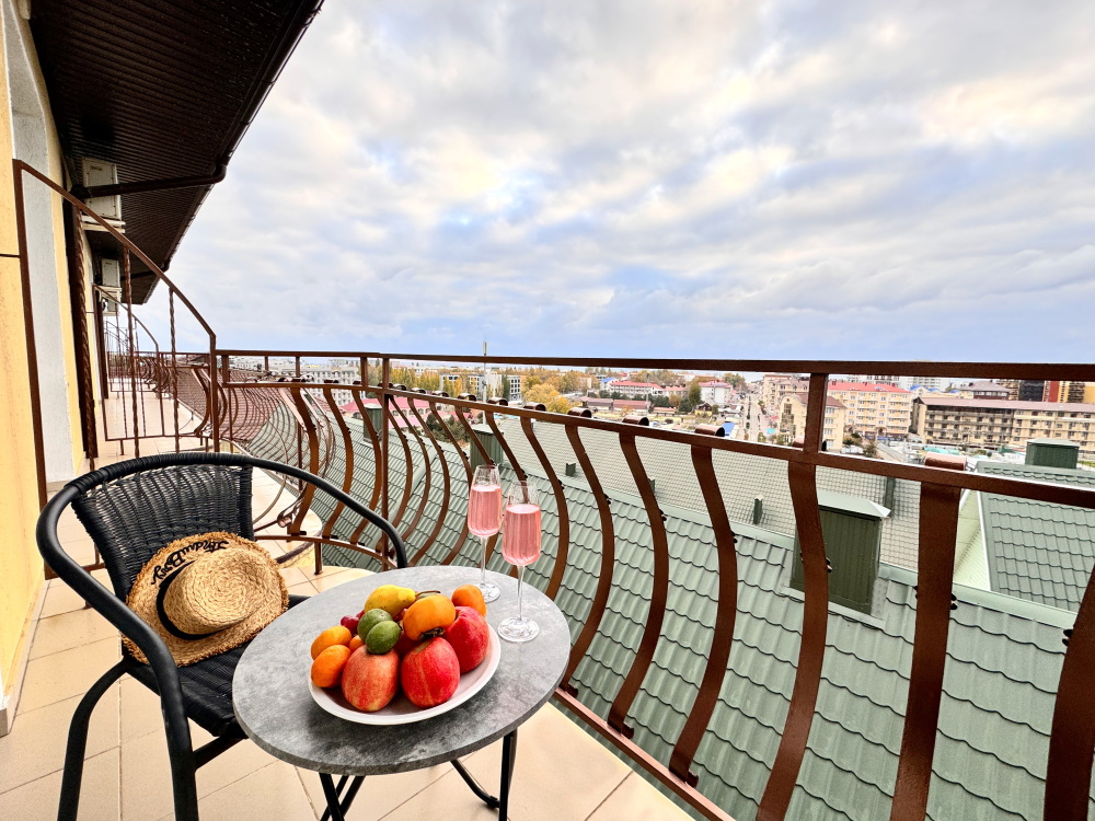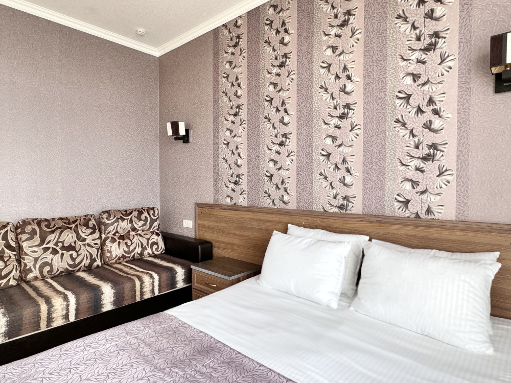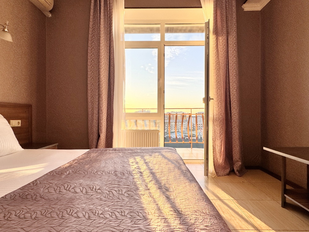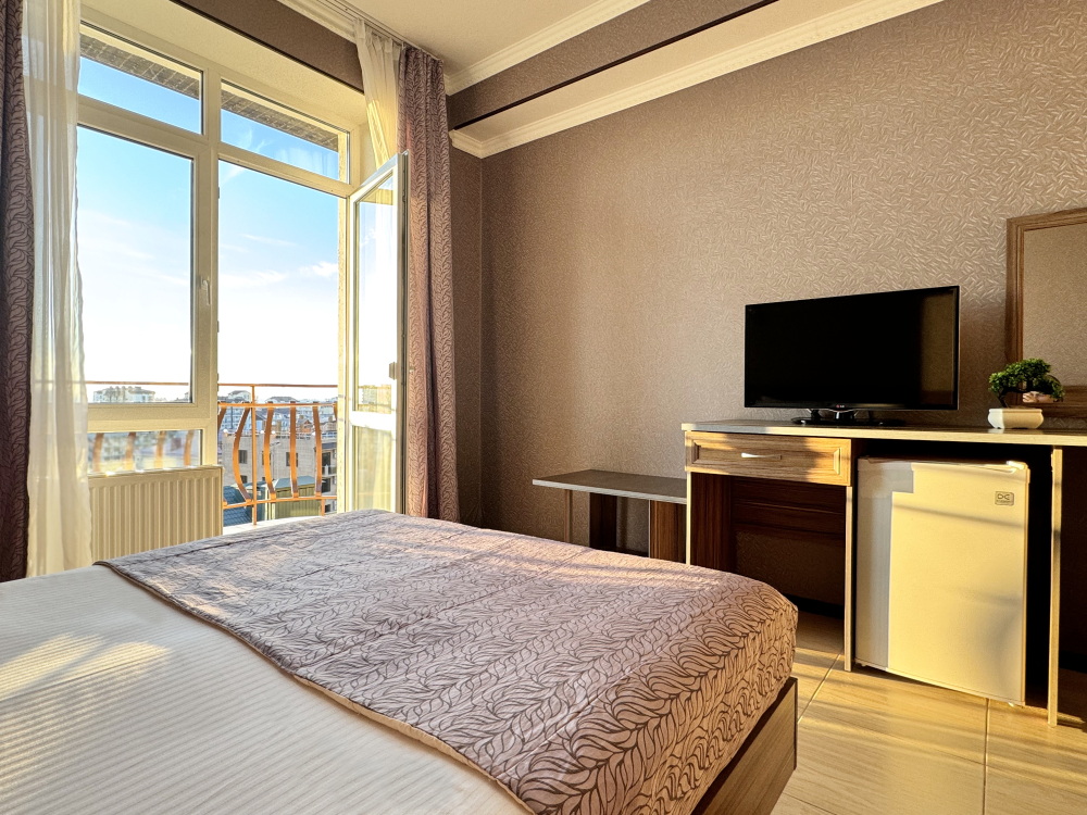Номер с видом на город. Двуспальная кровать (140*200), двуспальный диван-кровать, прикроватные тумбочки, бра, кондиционер, журнальный столик, телевизор, туалетный столик, зеркало, мини-холодильник, сейф. В прихожей находится вешалка для одежды, шкаф для хранения вещей. Балкон оборудован летней мебелью для отдыха, стол и стулья. Ванная комната: душ или ванная, фен, раковина и санузел.