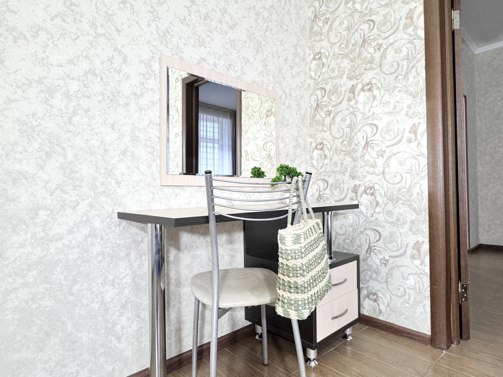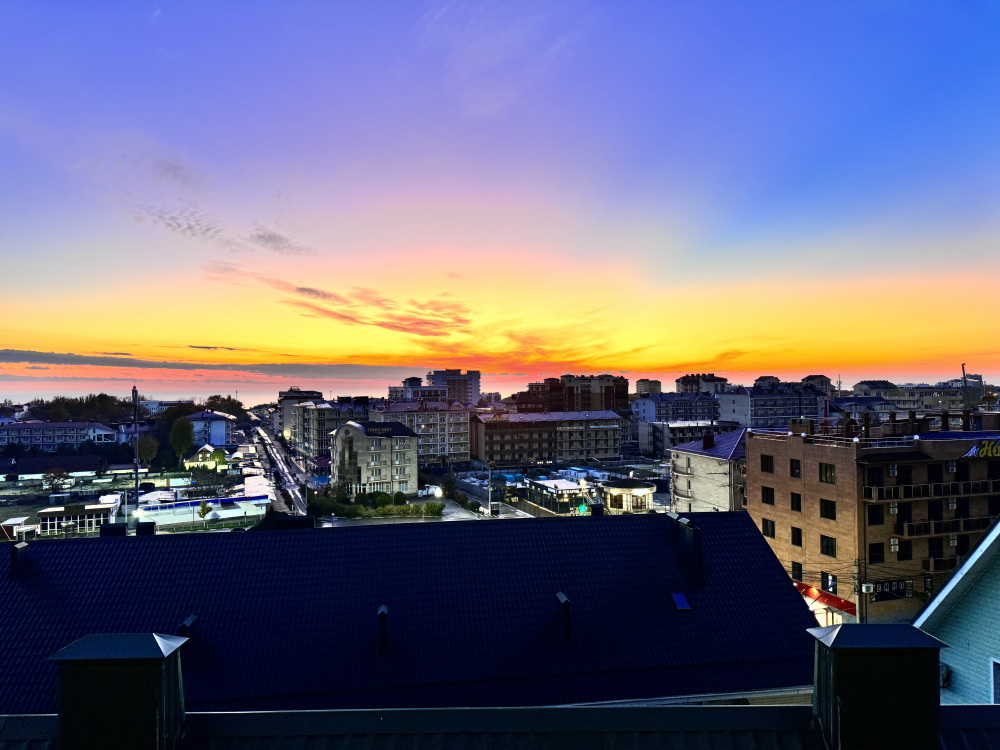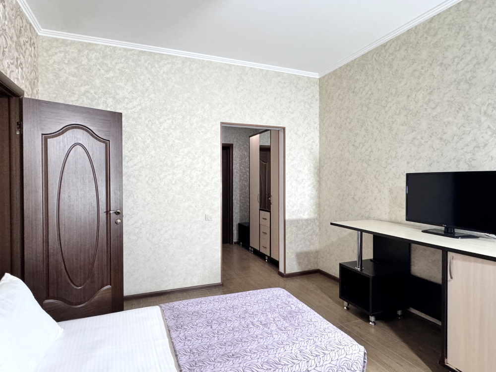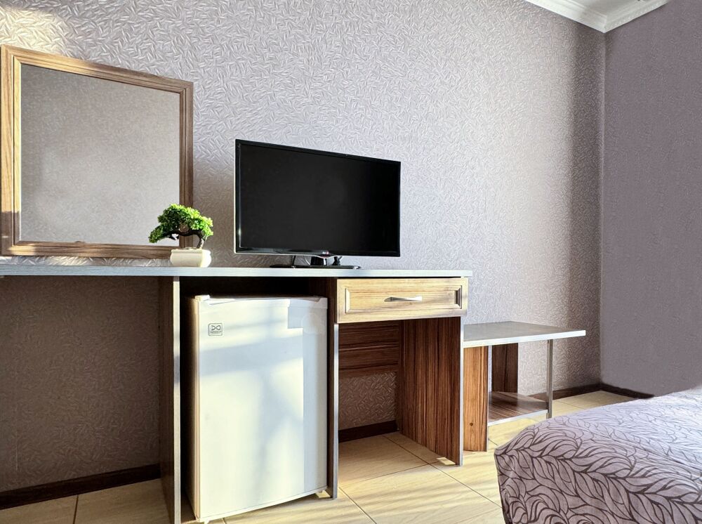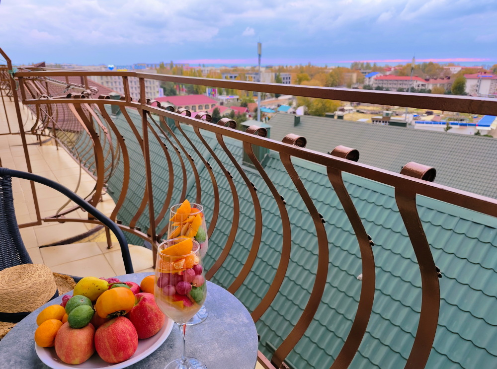 Номер с видом на город. Двуспальная кровать (140*200), двуспальный диван-кровать, прикроватные тумбочки, бра, кондиционер, журнальный столик, телевизор, туалетный столик, зеркало, мини-холодильник, сейф. В прихожей находится вешалка для одежды, шкаф для хранения вещей. Балкон оборудован летней мебелью для отдыха, стол и стулья. Ванная комната: душ или ванная, фен, раковина и санузел.