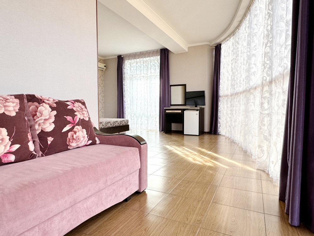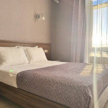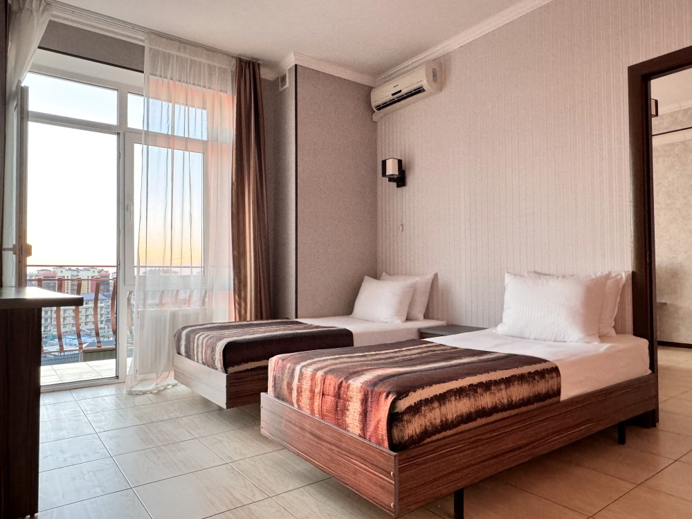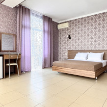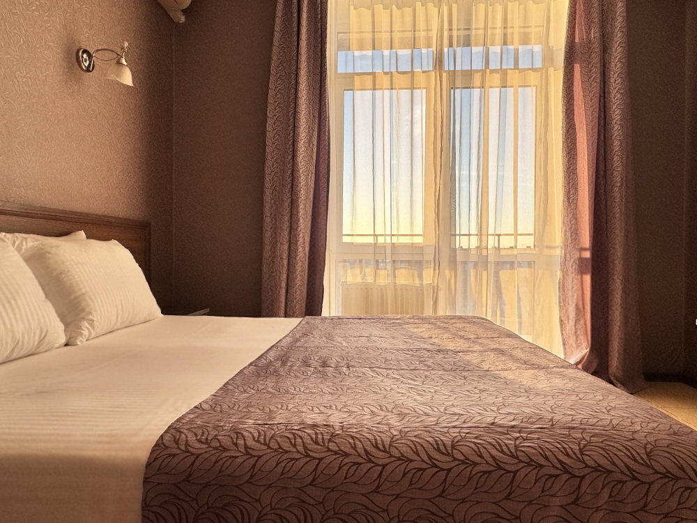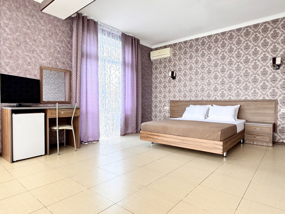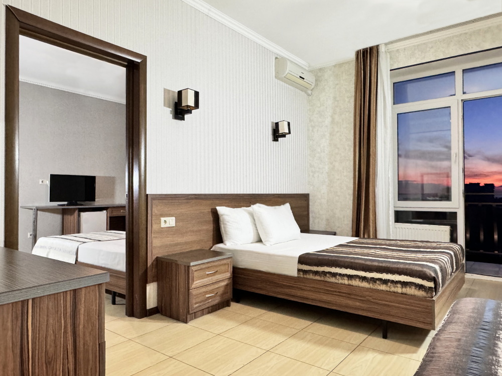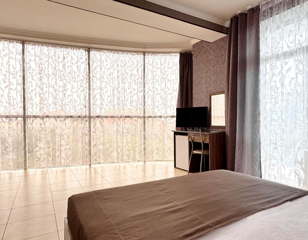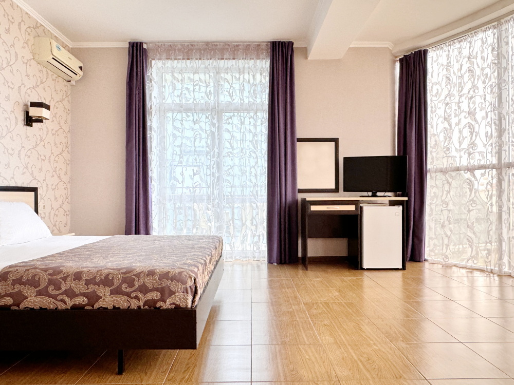 Однокомнатный просторный номер с панорамным окном. Двуспальная кровать (160*200), двуспальный диван-кровать или двуспальная кровать (140*200), прикроватные тумбочки, бра, кондиционер, журнальный столик, телевизор, туалетный столик, зеркало, мини-холодильник, сейф. В прихожей находится вешалка для одежды, шкаф для хранения вещей. Балкон оборудован летней мебелью для отдыха, стол и стулья. Ванная комната: душ или ванная, фен, раковина и санузел.