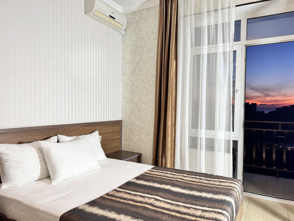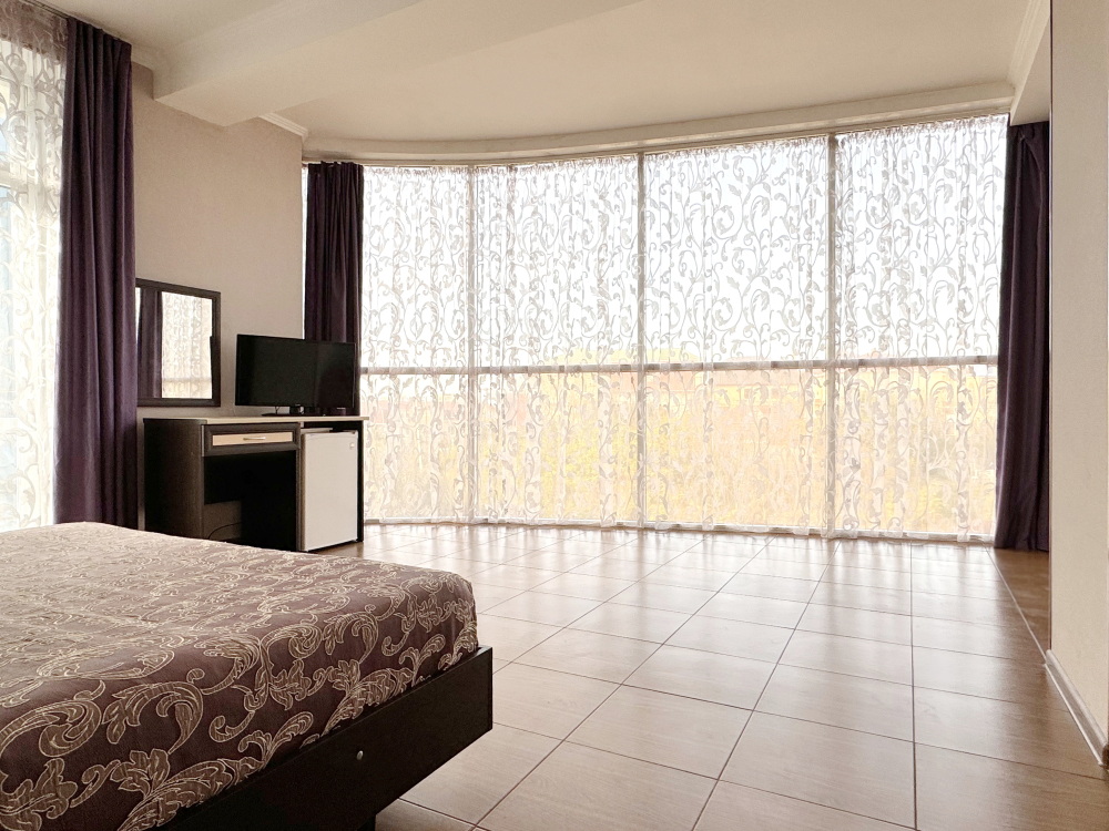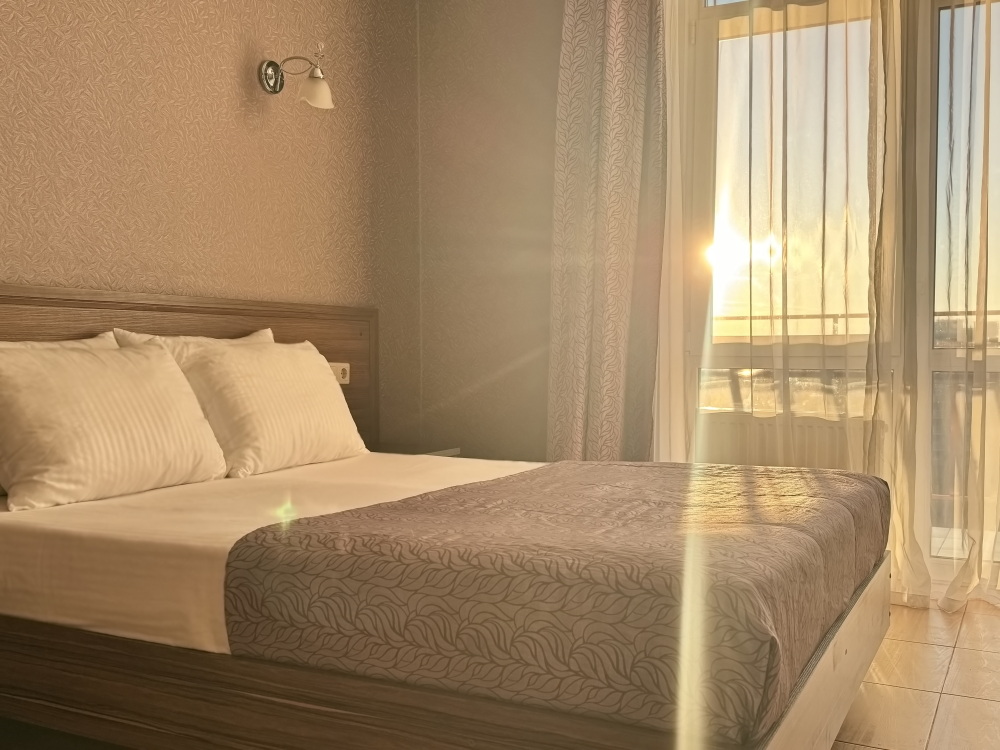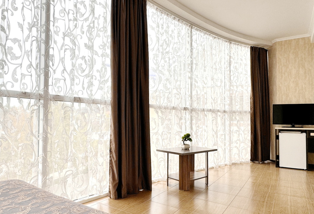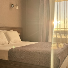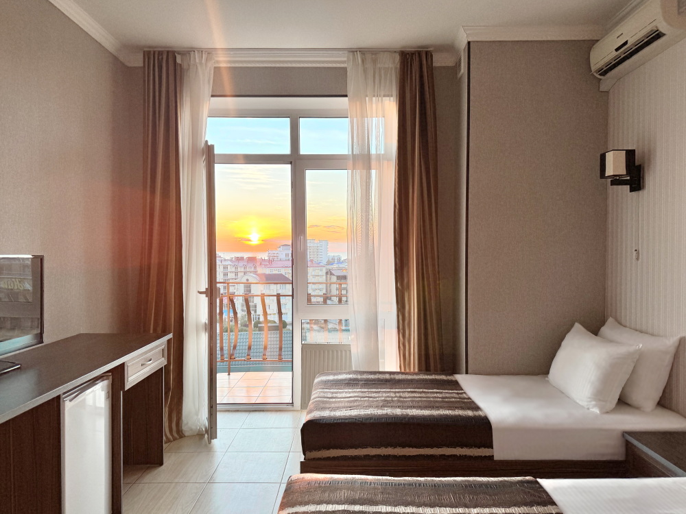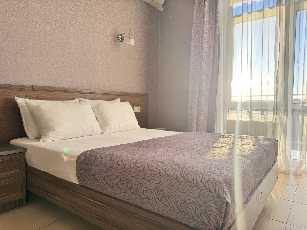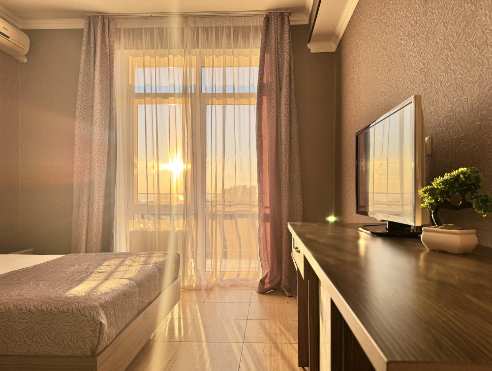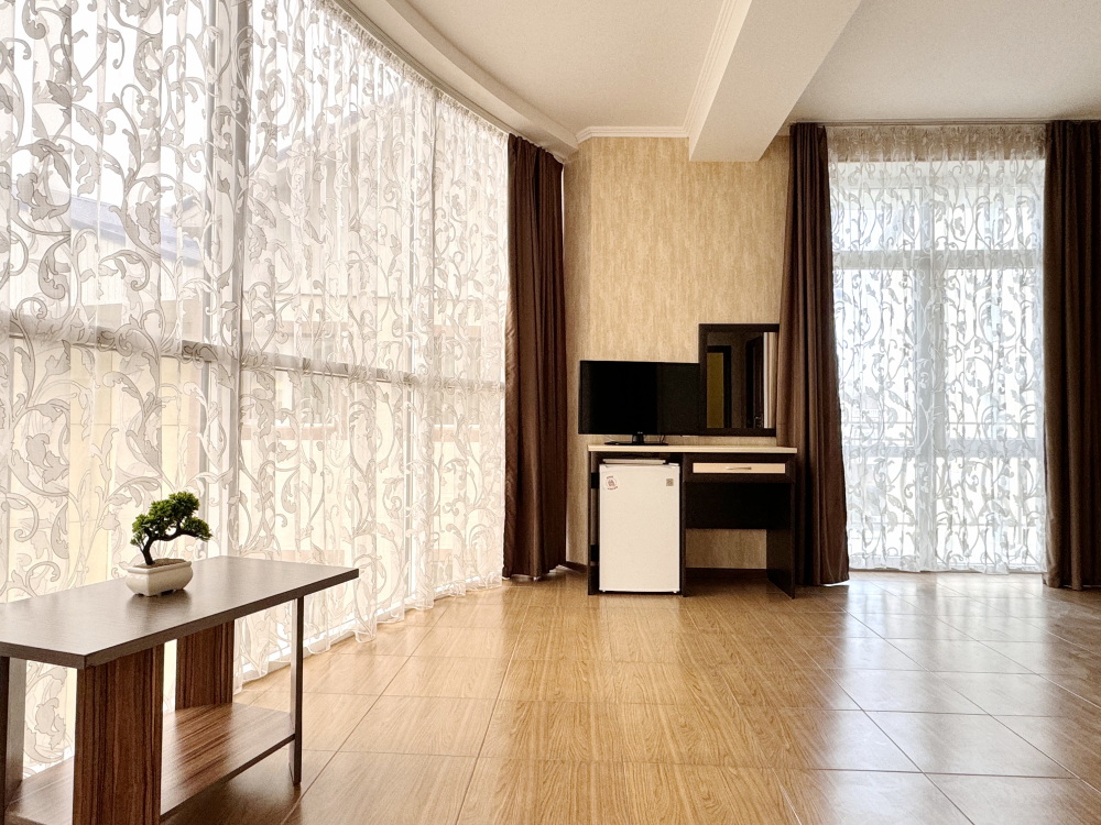 Однокомнатный просторный номер с панорамным окном. Двуспальная кровать (160*200), двуспальный диван-кровать или двуспальная кровать (140*200), прикроватные тумбочки, бра, кондиционер, журнальный столик, телевизор, туалетный столик, зеркало, мини-холодильник, сейф. В прихожей находится вешалка для одежды, шкаф для хранения вещей. Балкон оборудован летней мебелью для отдыха, стол и стулья. Ванная комната: душ или ванная, фен, раковина и санузел.