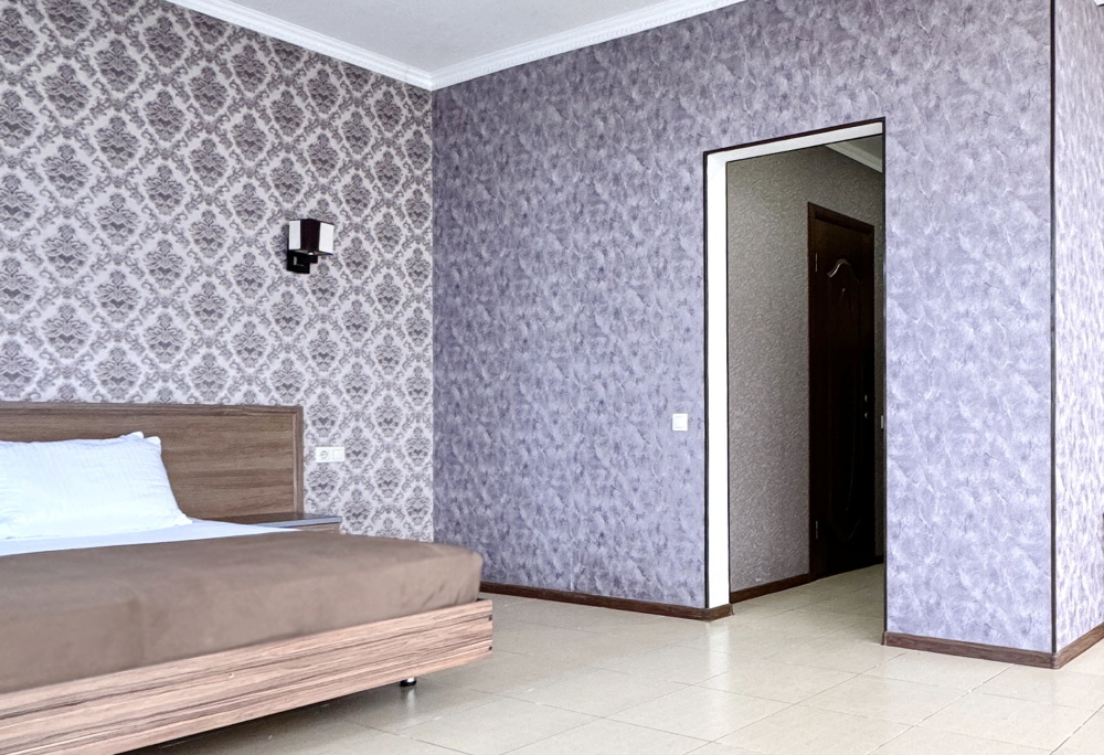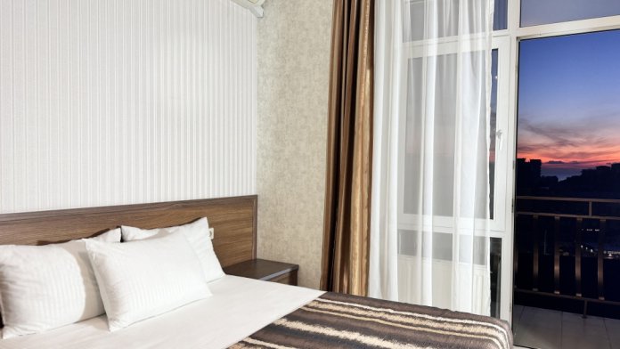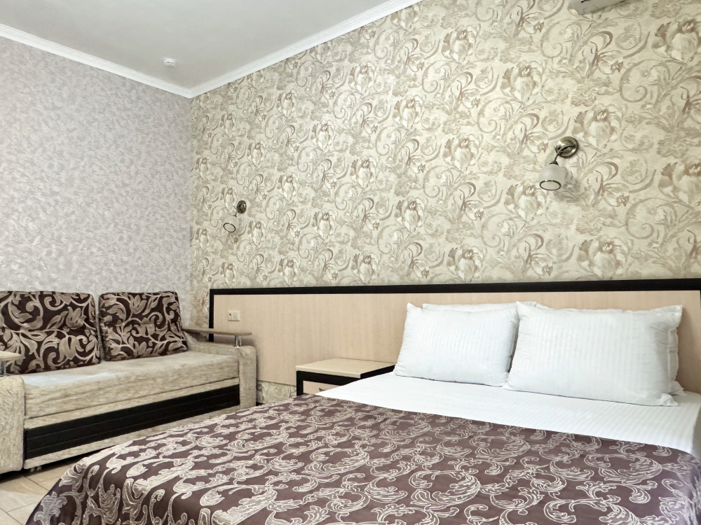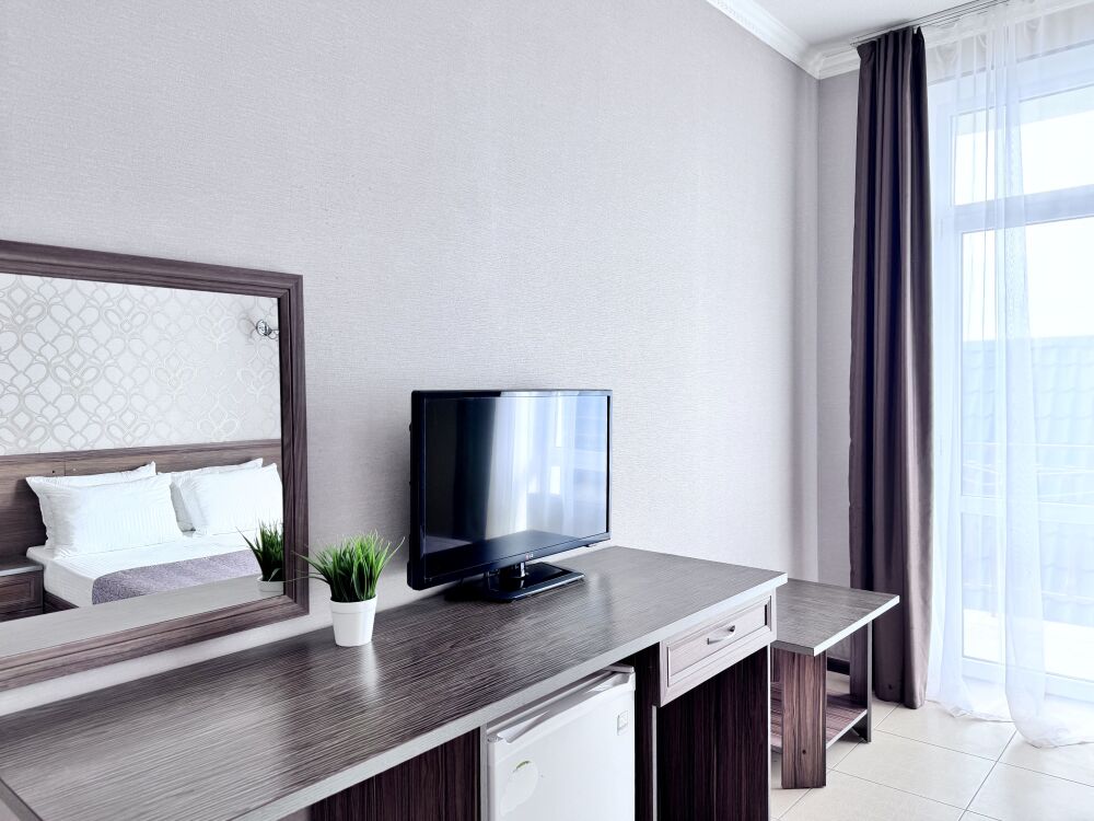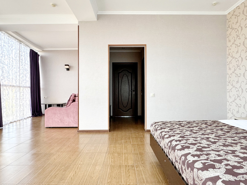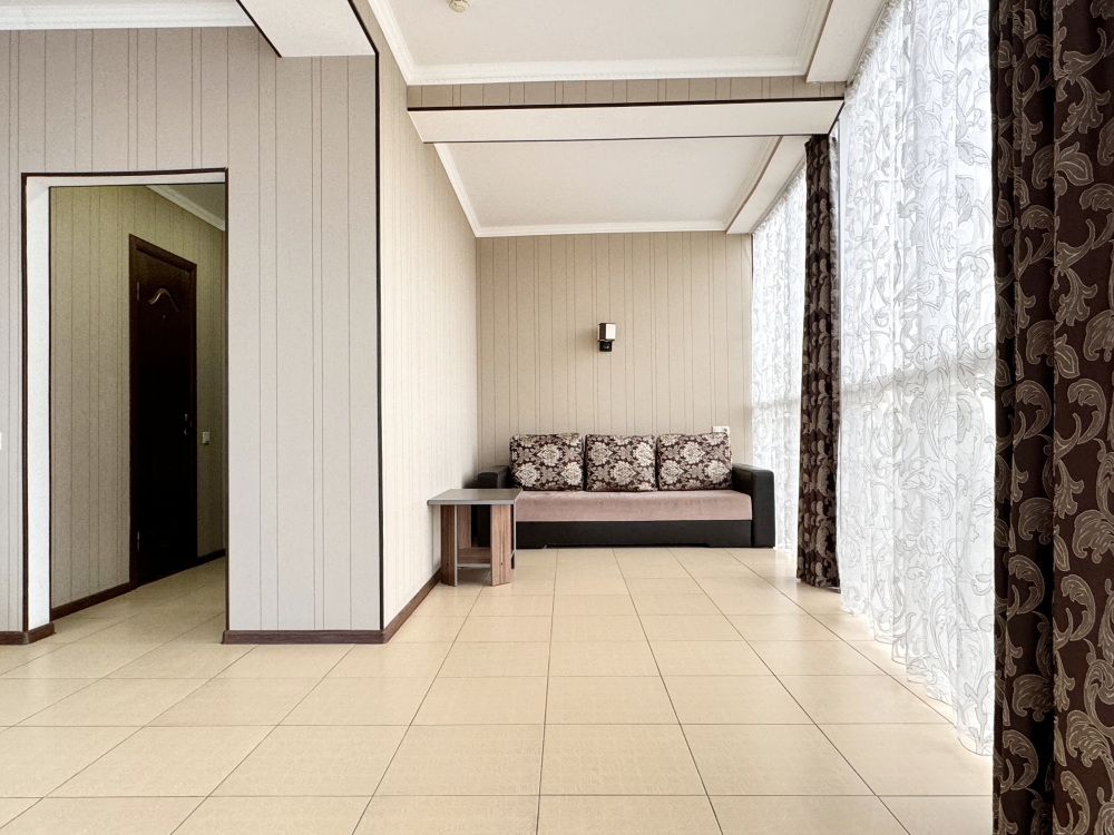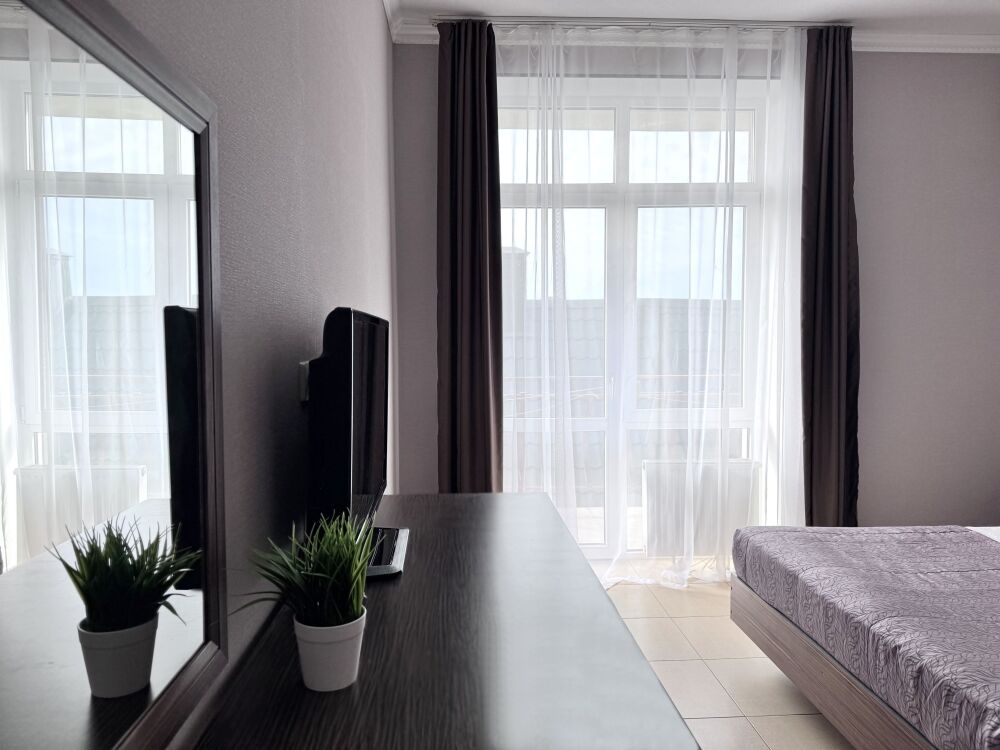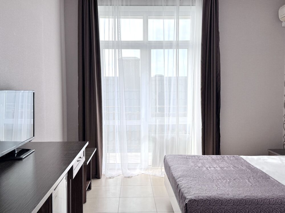 Однокомнатный просторный номер с панорамным окном. Двуспальная кровать (160*200), двуспальный диван-кровать или двуспальная кровать (140*200), прикроватные тумбочки, бра, кондиционер, журнальный столик, телевизор, туалетный столик, зеркало, мини-холодильник, сейф. В прихожей находится вешалка для одежды, шкаф для хранения вещей. Балкон оборудован летней мебелью для отдыха, стол и стулья. Ванная комната: душ или ванная, фен, раковина и санузел.