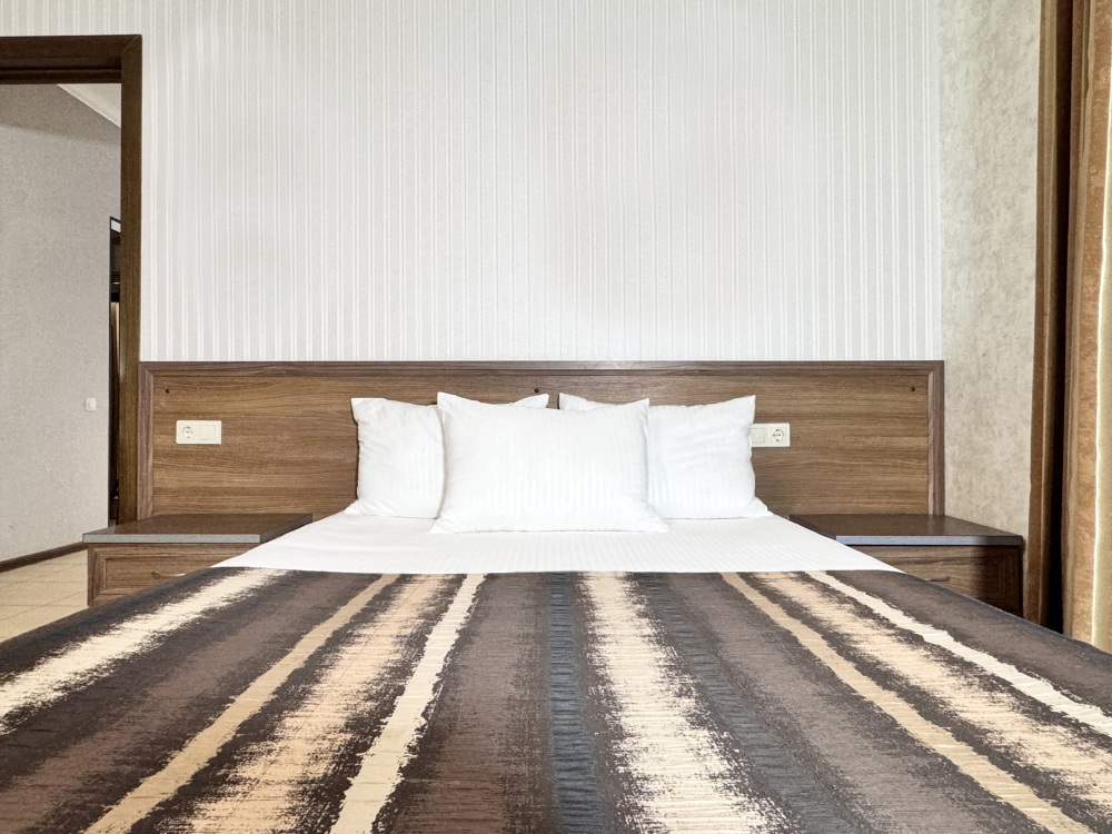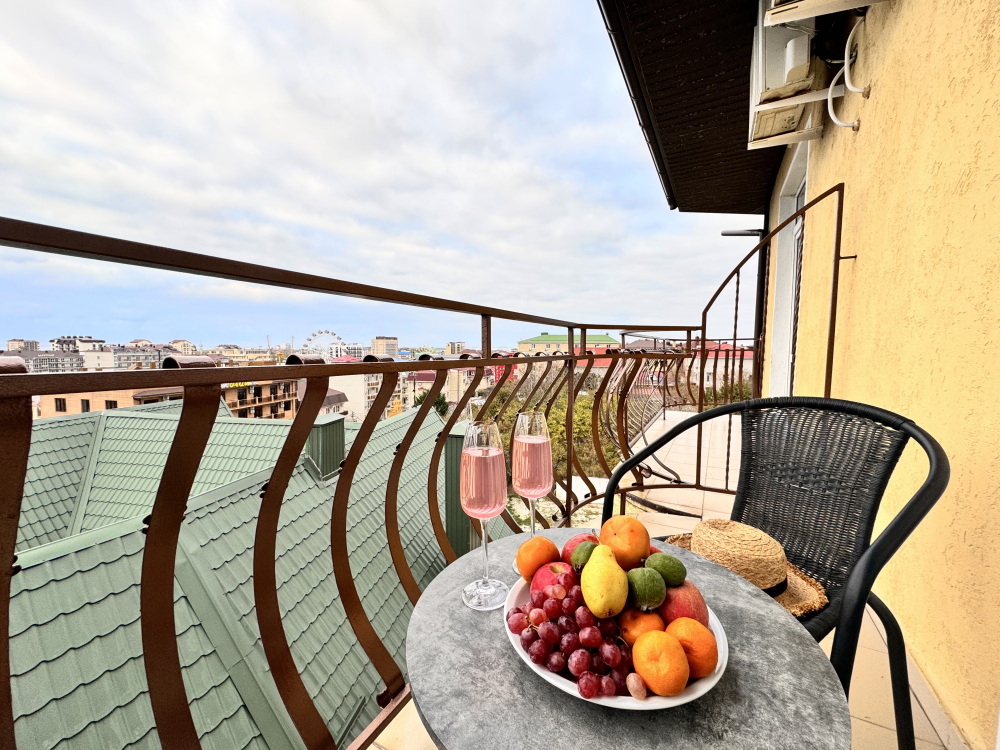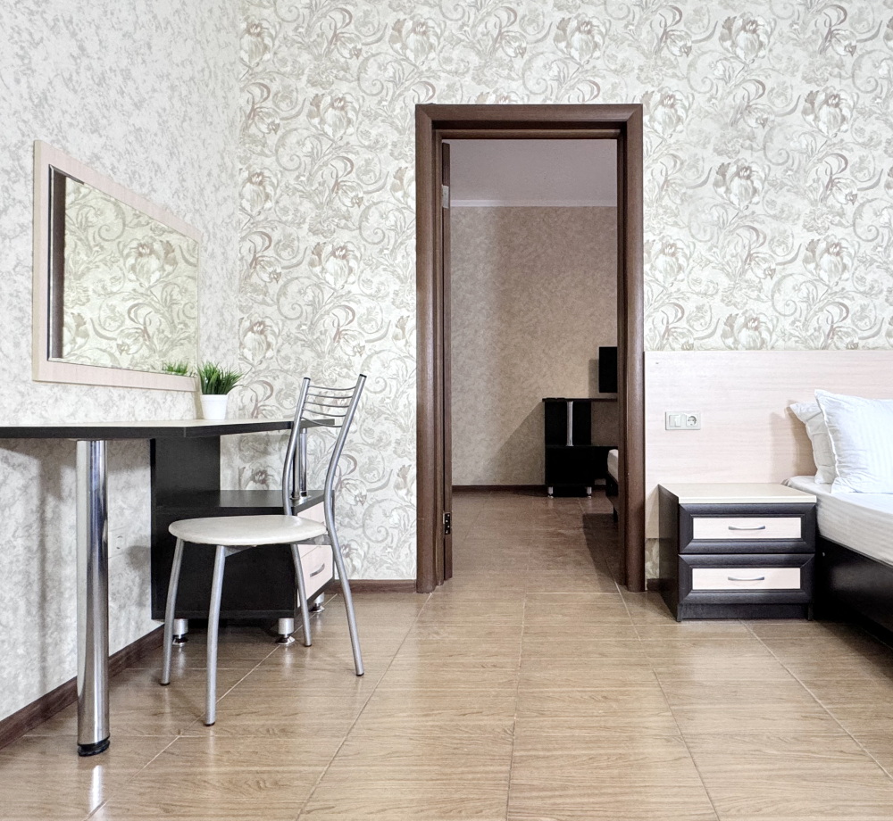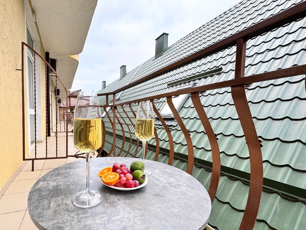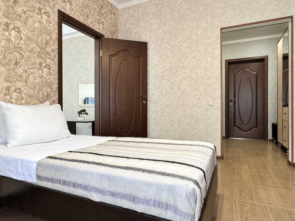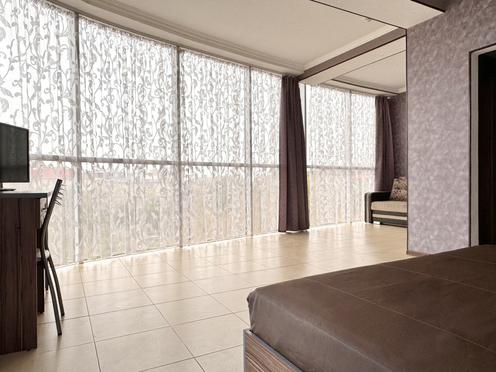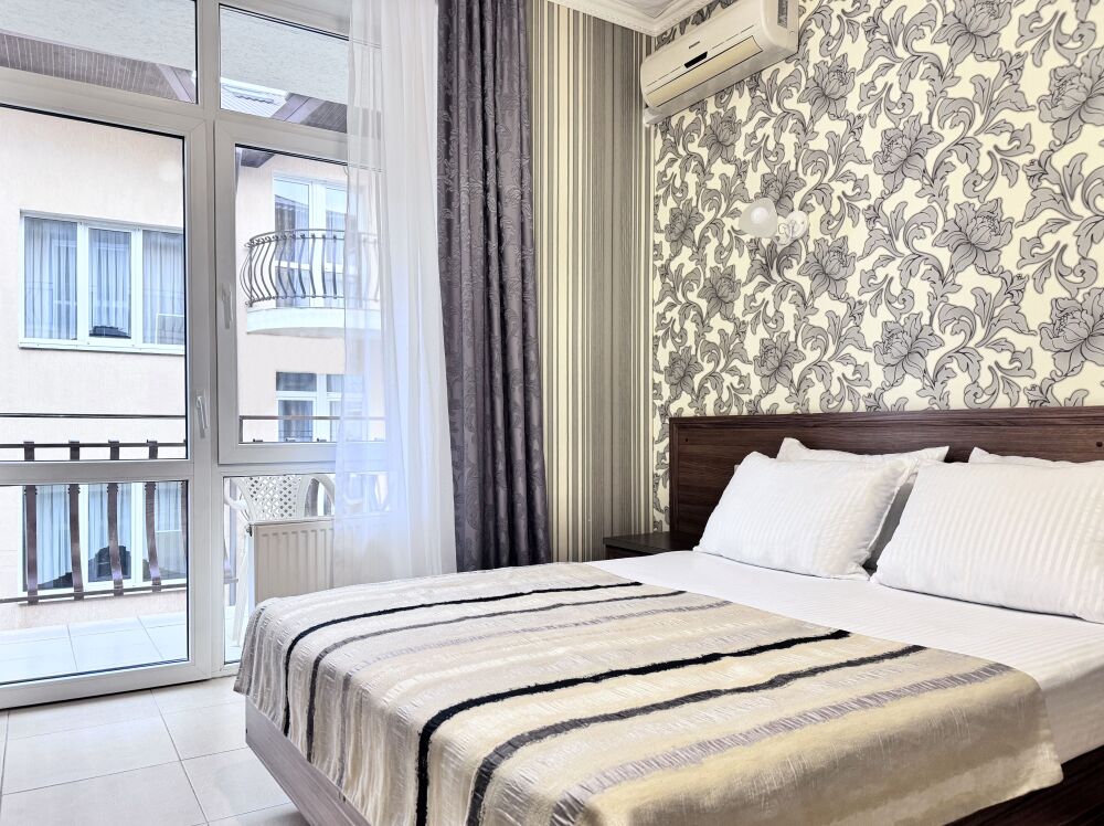 Однокомнатный просторный номер с панорамным окном. Двуспальная кровать (160*200), двуспальный диван-кровать или двуспальная кровать (140*200), прикроватные тумбочки, бра, кондиционер, журнальный столик, телевизор, туалетный столик, зеркало, мини-холодильник, сейф. В прихожей находится вешалка для одежды, шкаф для хранения вещей. Балкон оборудован летней мебелью для отдыха, стол и стулья. Ванная комната: душ или ванная, фен, раковина и санузел.