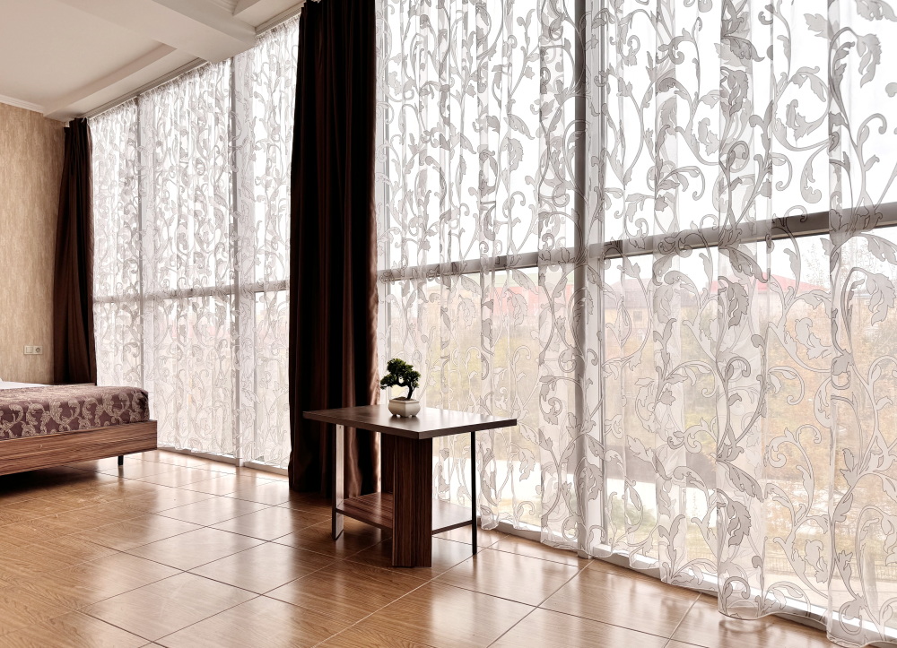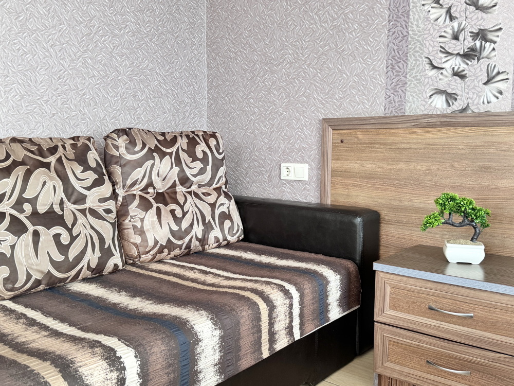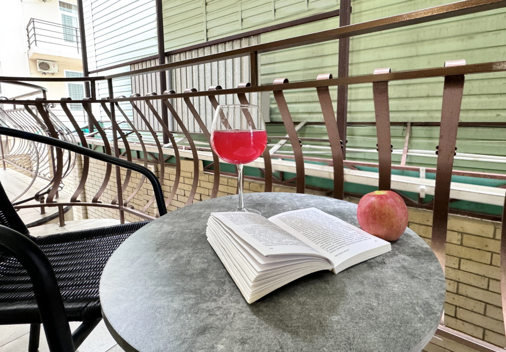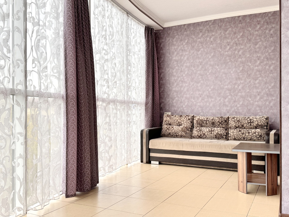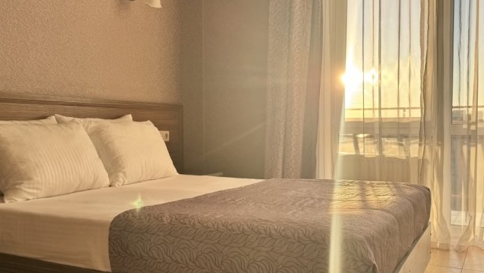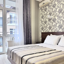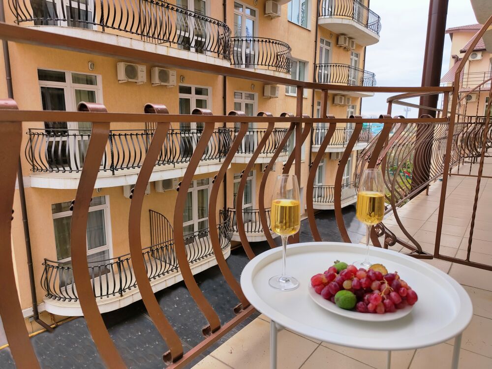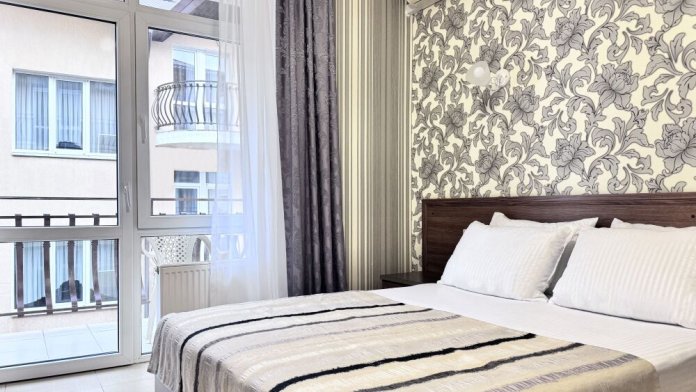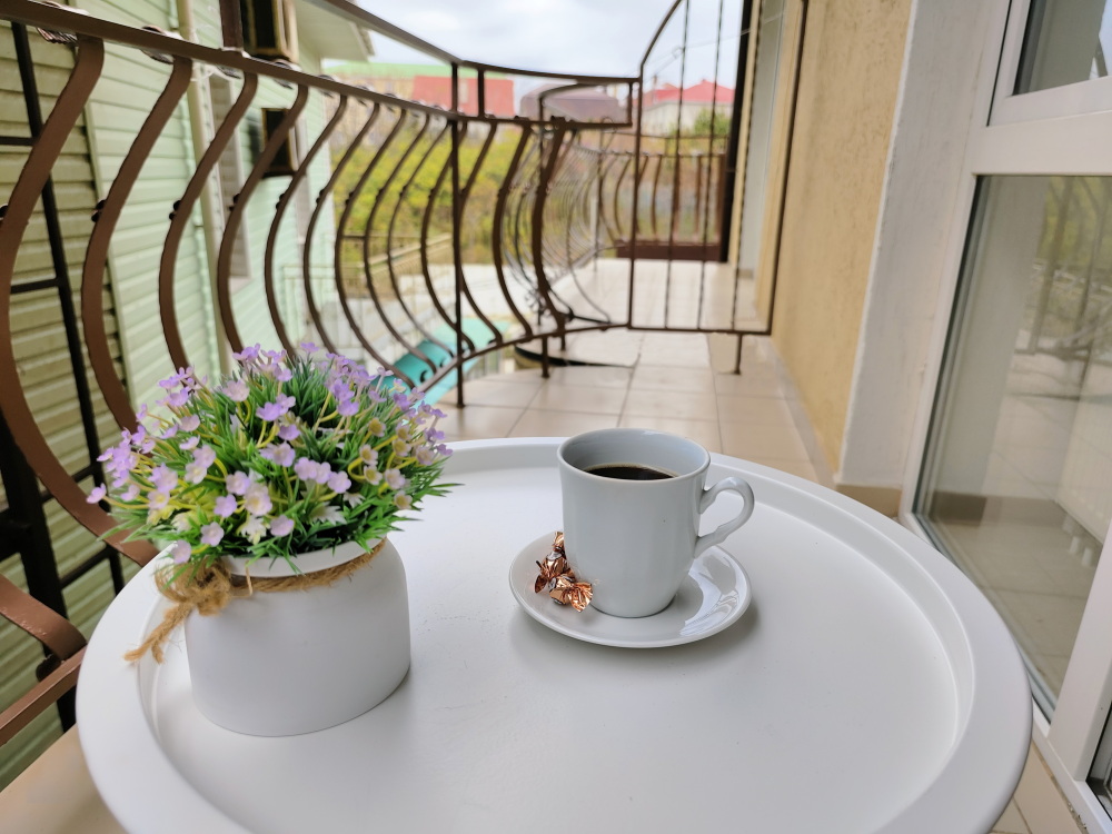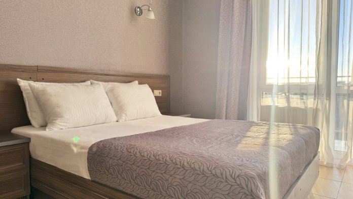 Однокомнатный просторный номер с панорамным окном. Двуспальная кровать (160*200), двуспальный диван-кровать или двуспальная кровать (140*200), прикроватные тумбочки, бра, кондиционер, журнальный столик, телевизор, туалетный столик, зеркало, мини-холодильник, сейф. В прихожей находится вешалка для одежды, шкаф для хранения вещей. Балкон оборудован летней мебелью для отдыха, стол и стулья. Ванная комната: душ или ванная, фен, раковина и санузел.