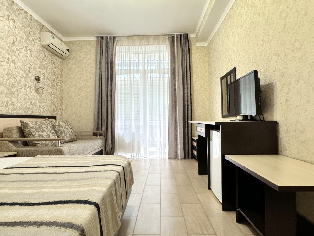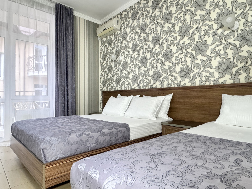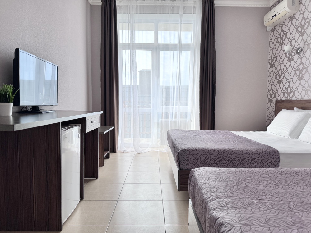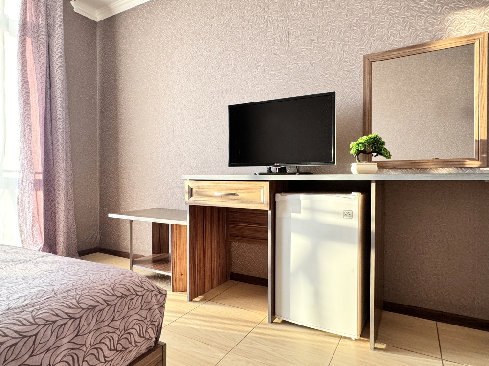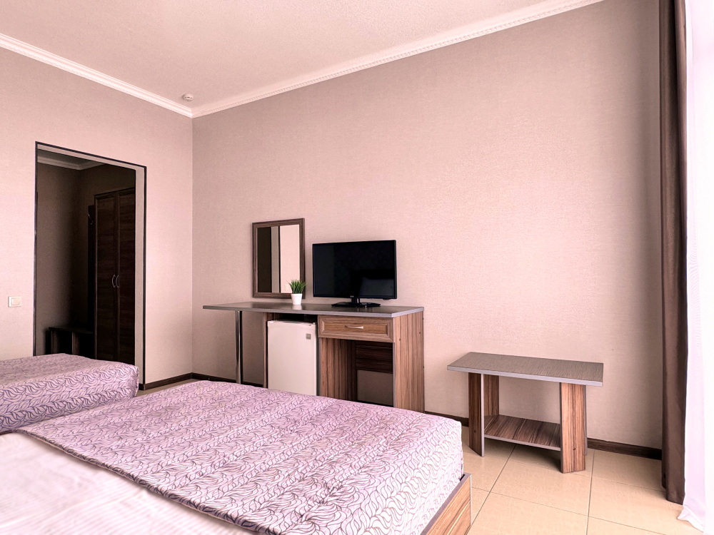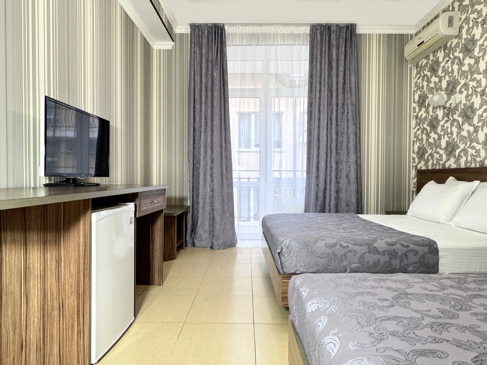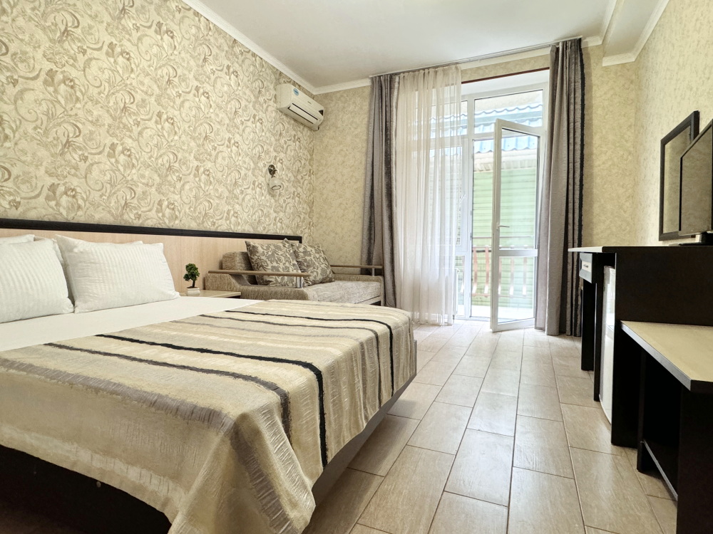 Однокомнатный номер. Двуспальная кровать (140*200) односпальная кровать, прикроватные тумбочки, бра, кондиционер, телевизор, журнальный столик, туалетный столик, зеркало, мини-холодильник, сейф. В прихожей находится вешалка для одежды, шкаф для хранения вещей. Балкон с видом на соседнее здание оборудован летней мебелью для отдыха, стол и стулья. Ванная комната: душ или ванная, фен, раковина и санузел.