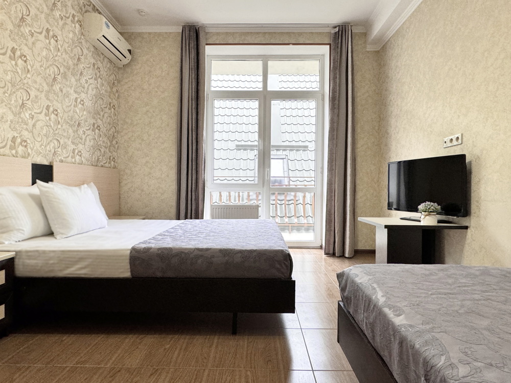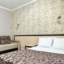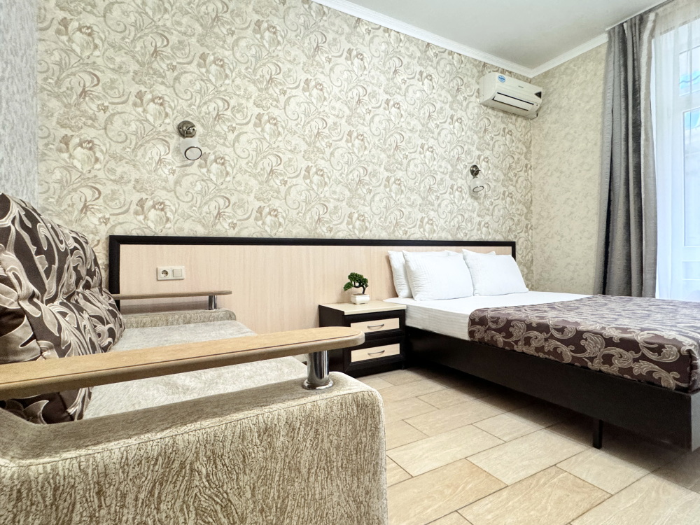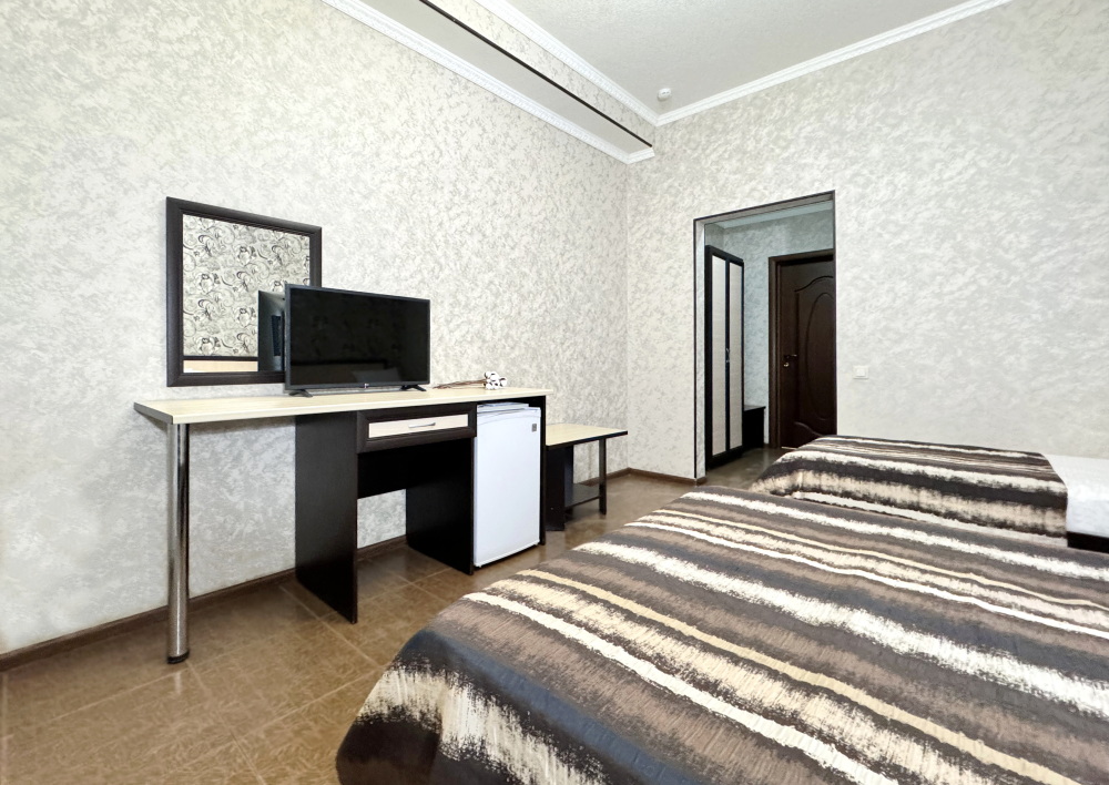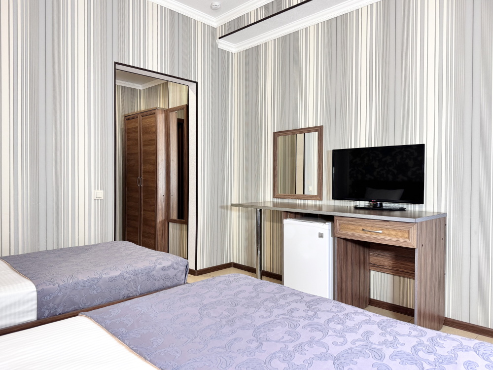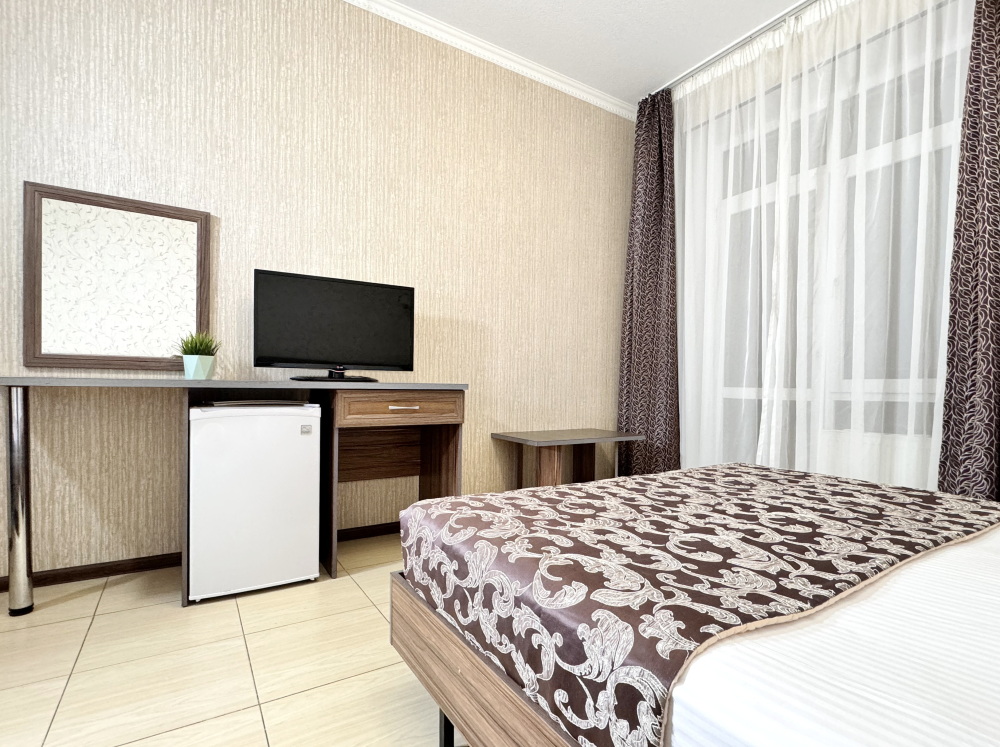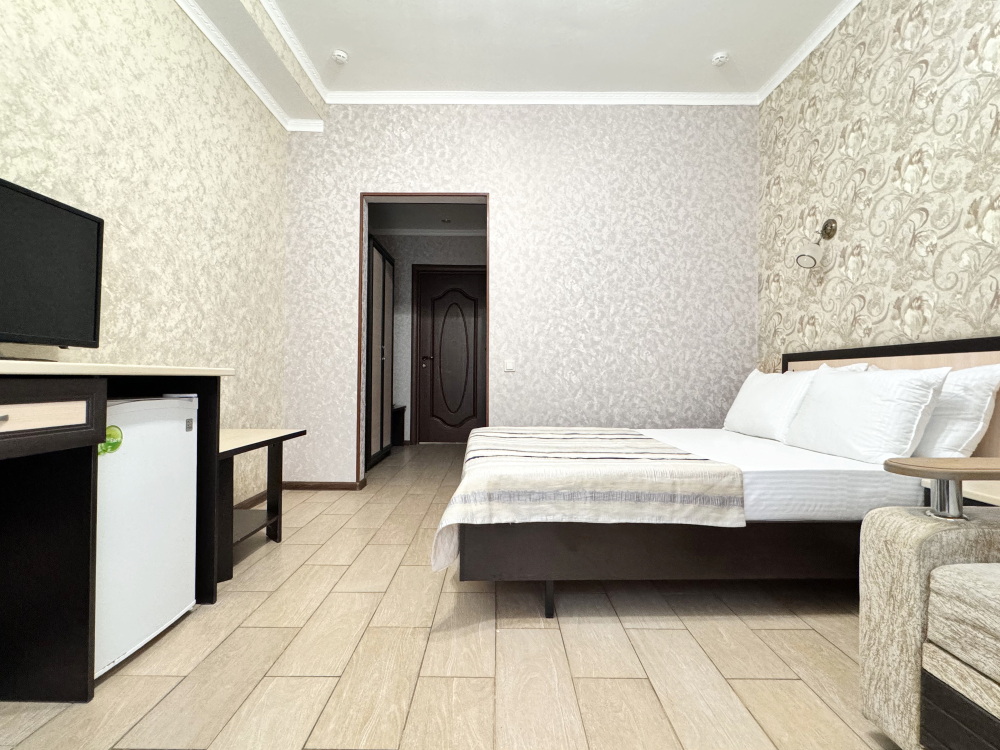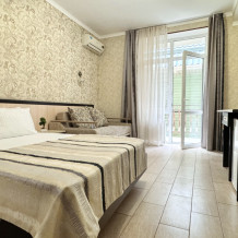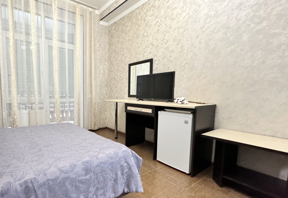 Однокомнатный номер. Двуспальная кровать (140*200) односпальная кровать, прикроватные тумбочки, бра, кондиционер, телевизор, журнальный столик, туалетный столик, зеркало, мини-холодильник, сейф. В прихожей находится вешалка для одежды, шкаф для хранения вещей. Балкон с видом на соседнее здание оборудован летней мебелью для отдыха, стол и стулья. Ванная комната: душ или ванная, фен, раковина и санузел.