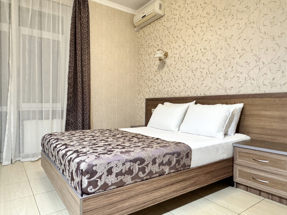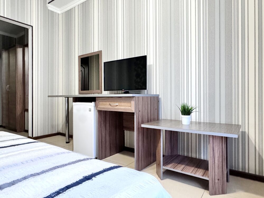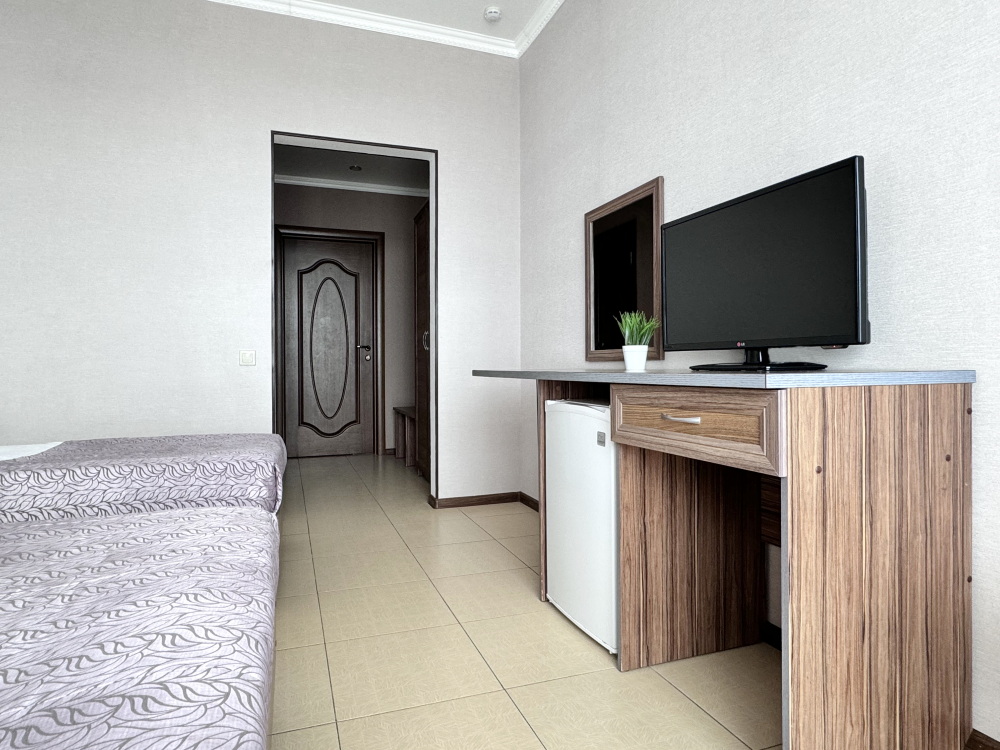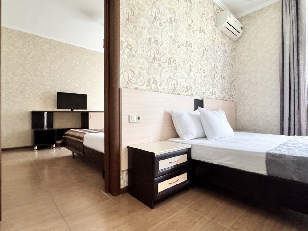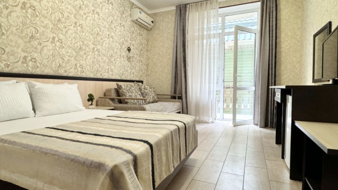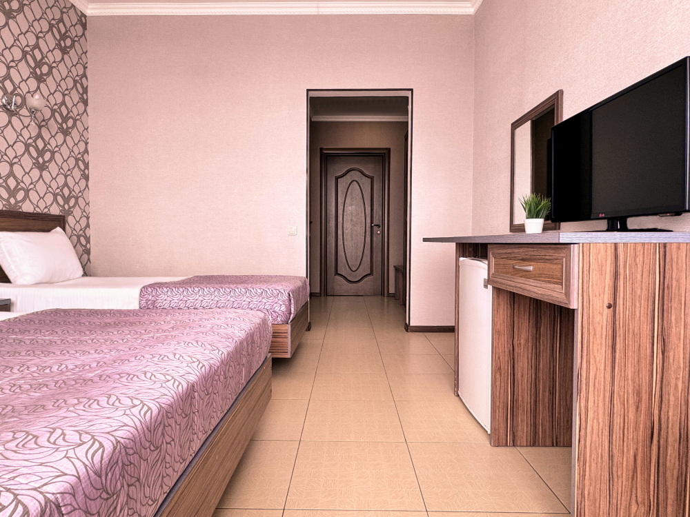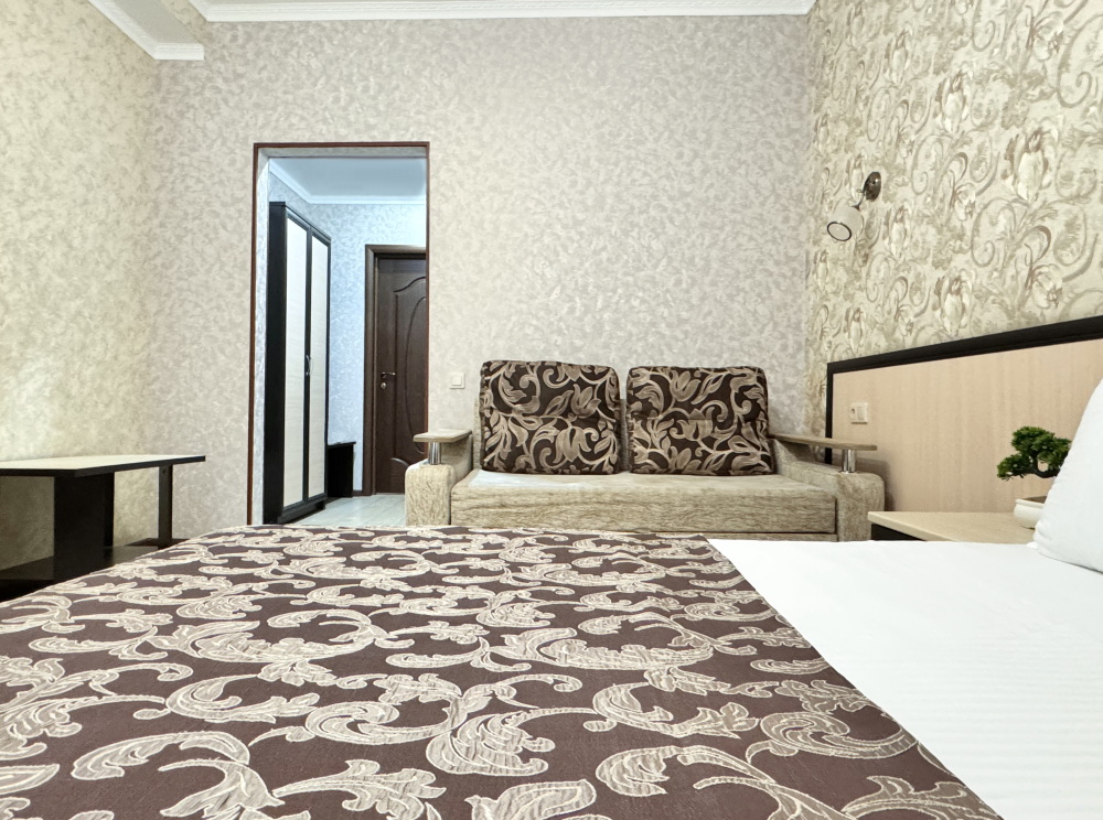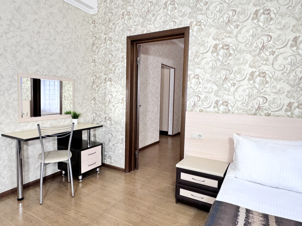 Однокомнатный номер. Двуспальная кровать (140*200) односпальная кровать, прикроватные тумбочки, бра, кондиционер, телевизор, журнальный столик, туалетный столик, зеркало, мини-холодильник, сейф. В прихожей находится вешалка для одежды, шкаф для хранения вещей. Балкон с видом на соседнее здание оборудован летней мебелью для отдыха, стол и стулья. Ванная комната: душ или ванная, фен, раковина и санузел.