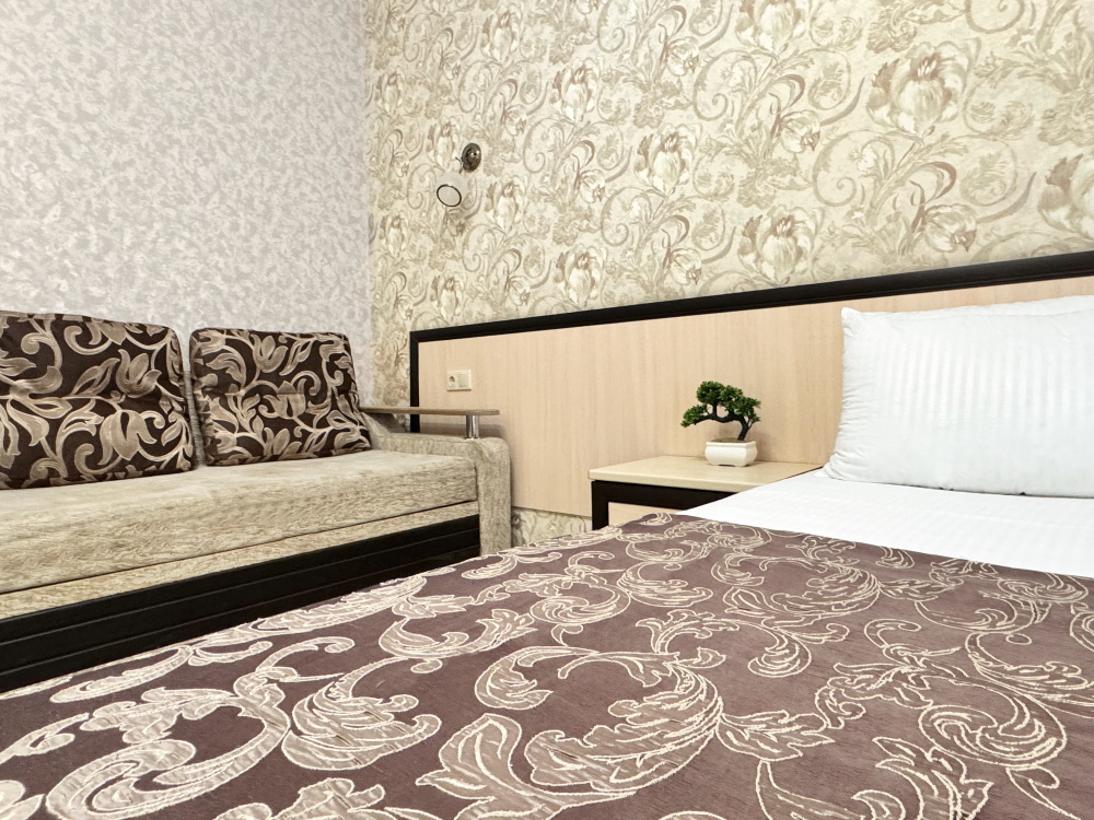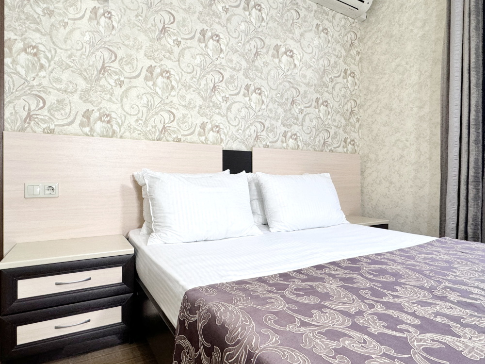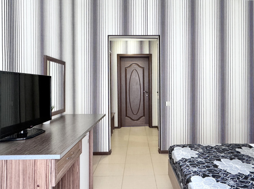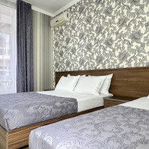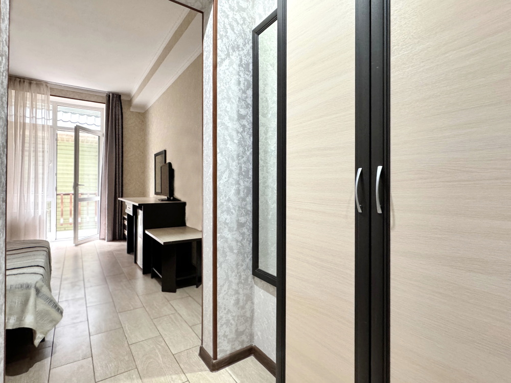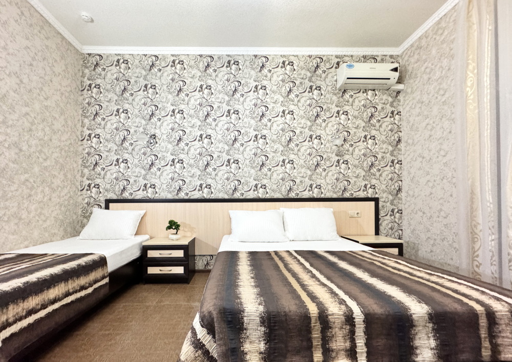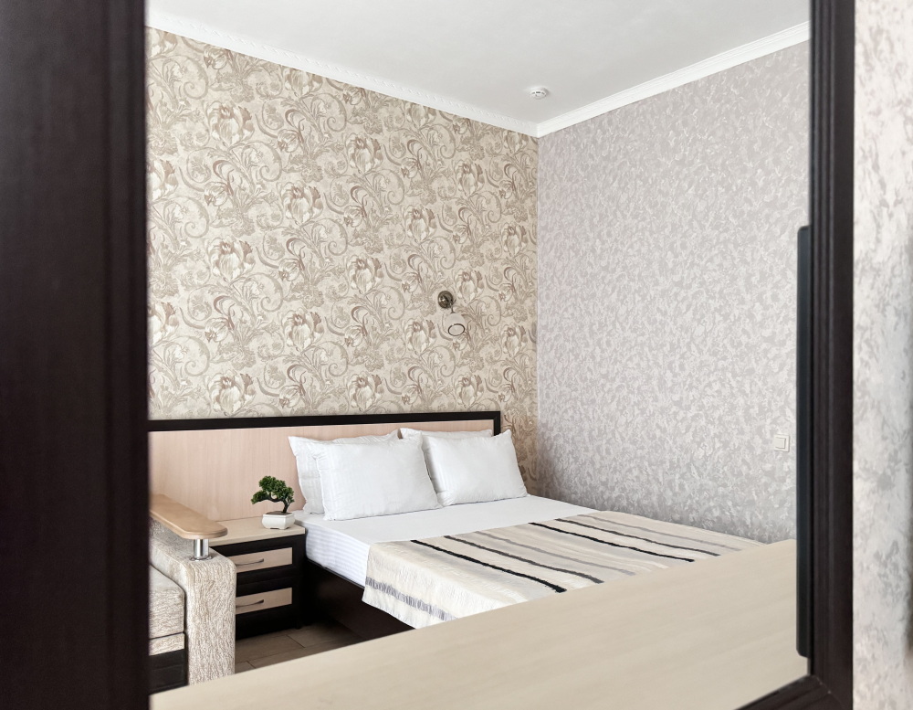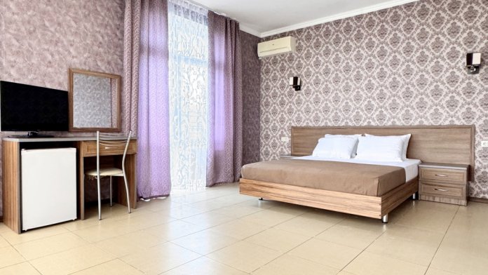 Однокомнатный номер. Двуспальная кровать (140*200) односпальная кровать, прикроватные тумбочки, бра, кондиционер, телевизор, журнальный столик, туалетный столик, зеркало, мини-холодильник, сейф. В прихожей находится вешалка для одежды, шкаф для хранения вещей. Балкон с видом на соседнее здание оборудован летней мебелью для отдыха, стол и стулья. Ванная комната: душ или ванная, фен, раковина и санузел.
