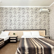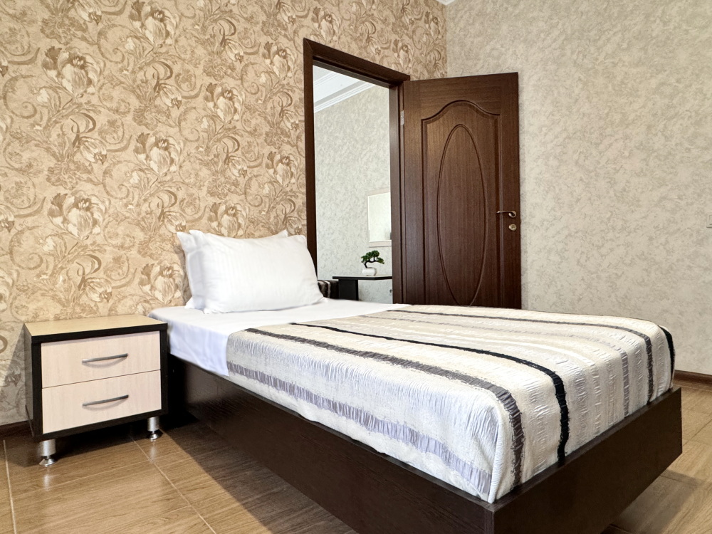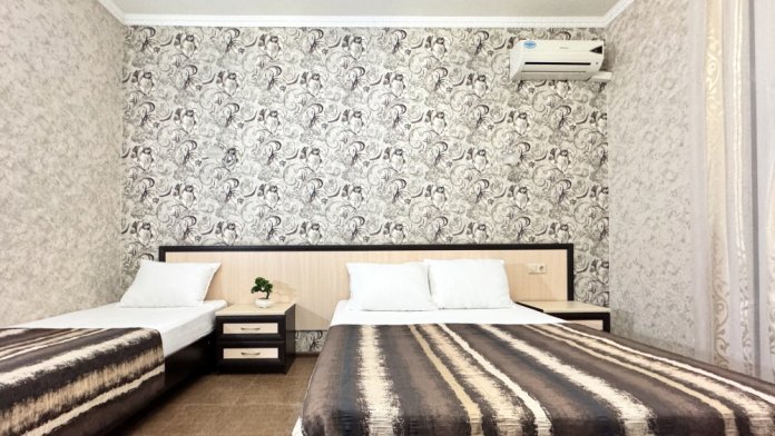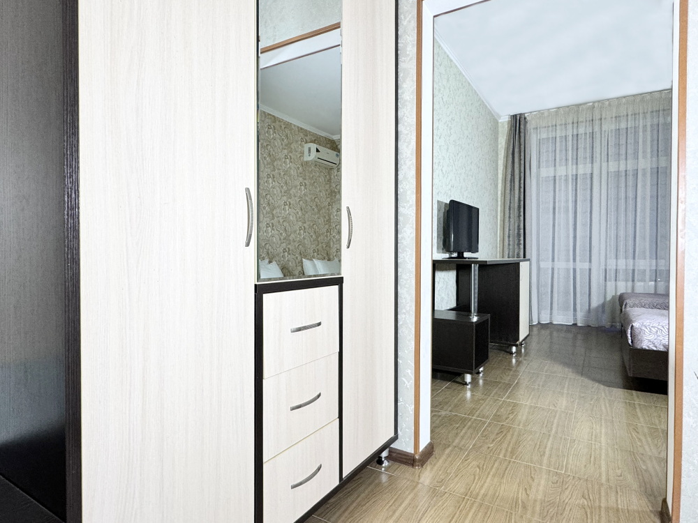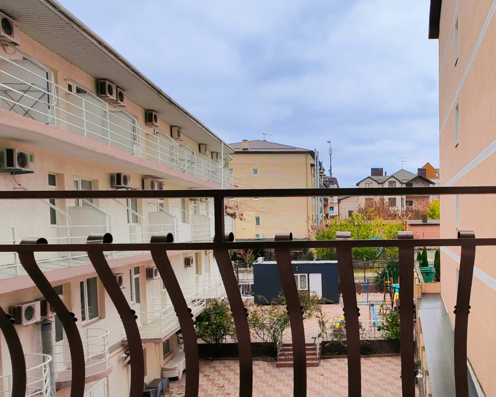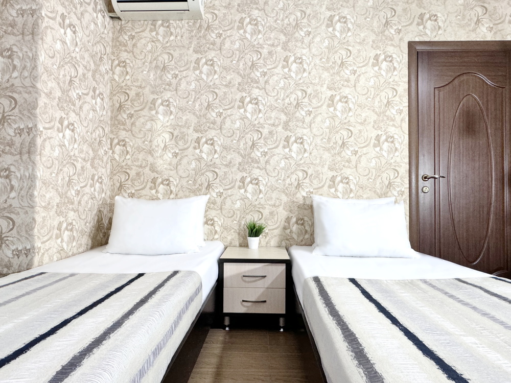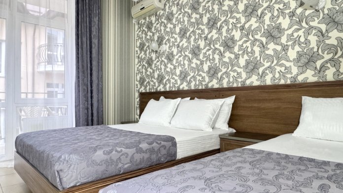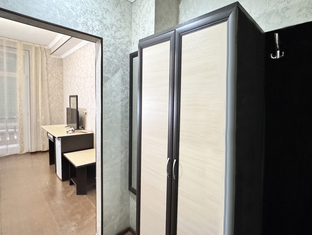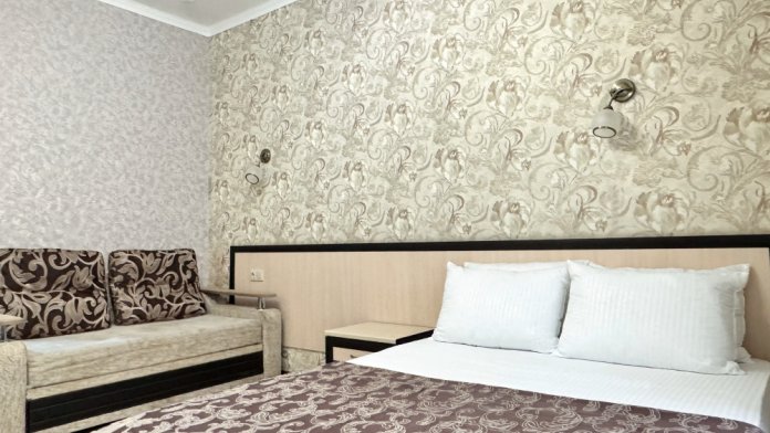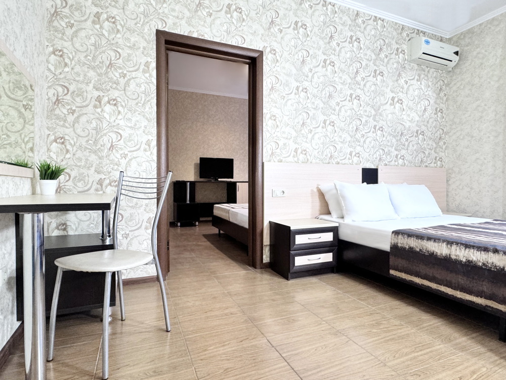 Однокомнатный номер. Двуспальная кровать (140*200) односпальная кровать, прикроватные тумбочки, бра, кондиционер, телевизор, журнальный столик, туалетный столик, зеркало, мини-холодильник, сейф. В прихожей находится вешалка для одежды, шкаф для хранения вещей. Балкон с видом на соседнее здание оборудован летней мебелью для отдыха, стол и стулья. Ванная комната: душ или ванная, фен, раковина и санузел.