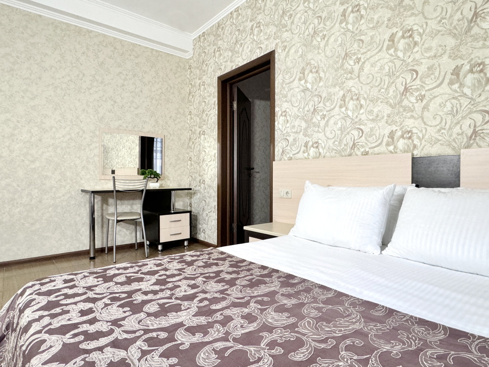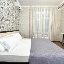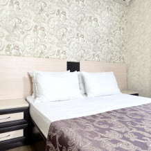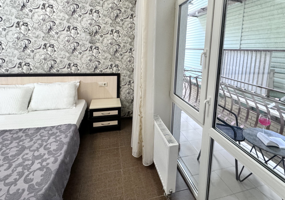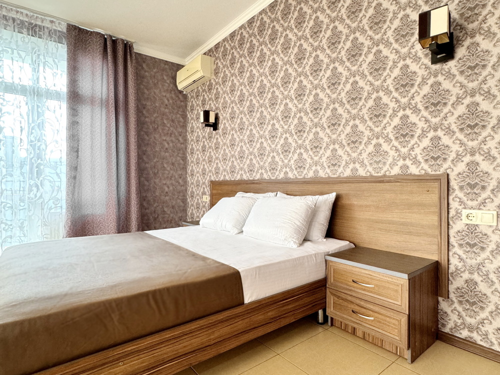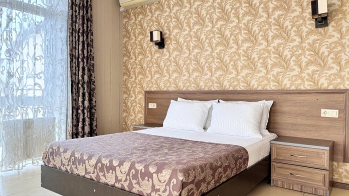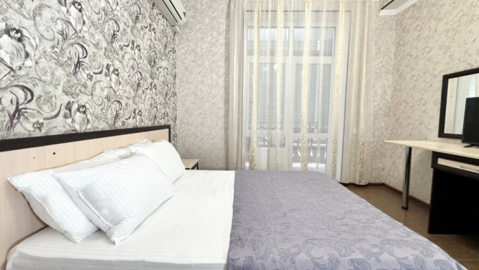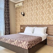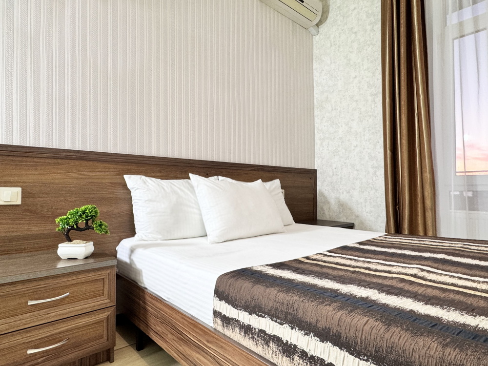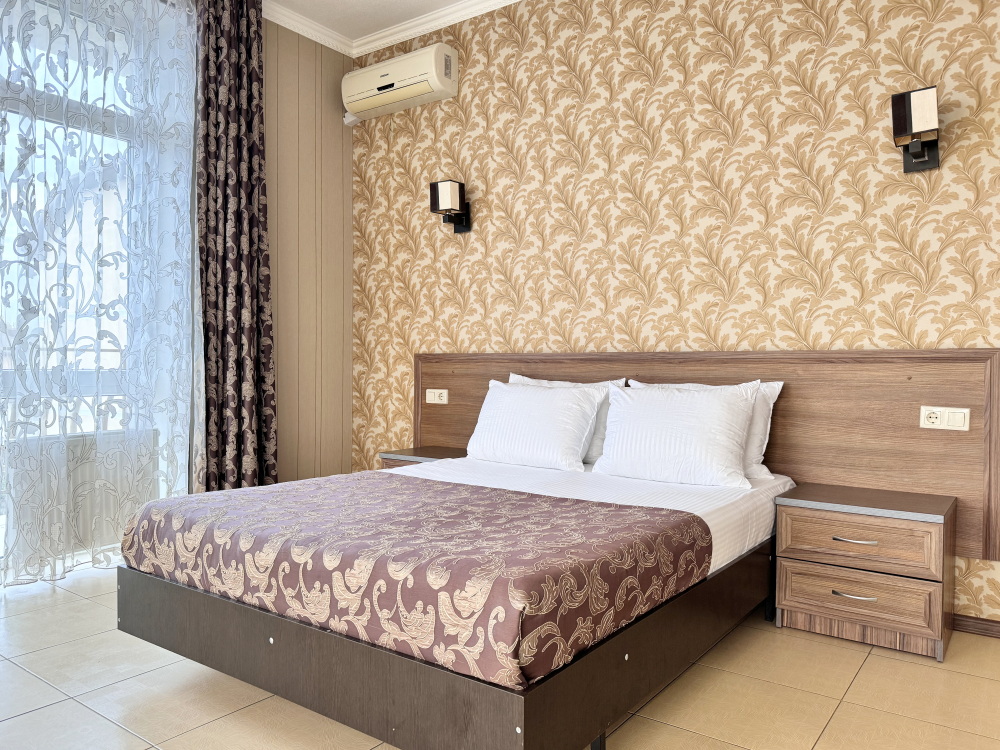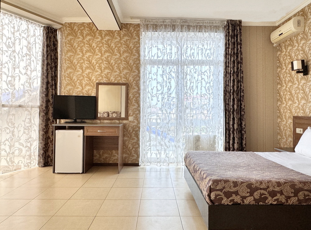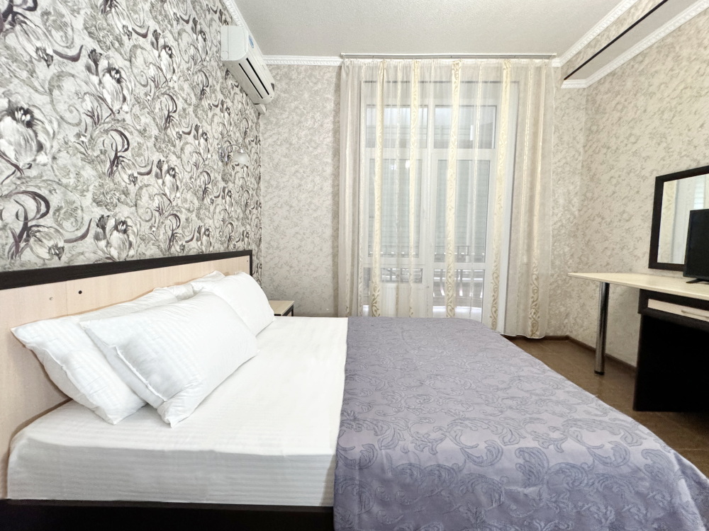 Однокомнатный номер. Двуспальная кровать (140*200), прикроватные тумбочки, бра, кондиционер, телевизор, журнальный столик, туалетный столик, зеркало, мини-холодильник, сейф. В прихожей находится вешалка для одежды, шкаф для хранения вещей. Балкон с видом на соседнее здание оборудован летней мебелью для отдыха, стол и стулья. Ванная комната: душ или ванная, фен, раковина и санузел.
