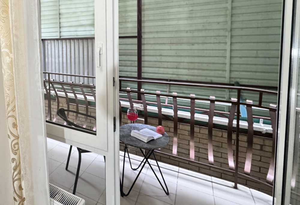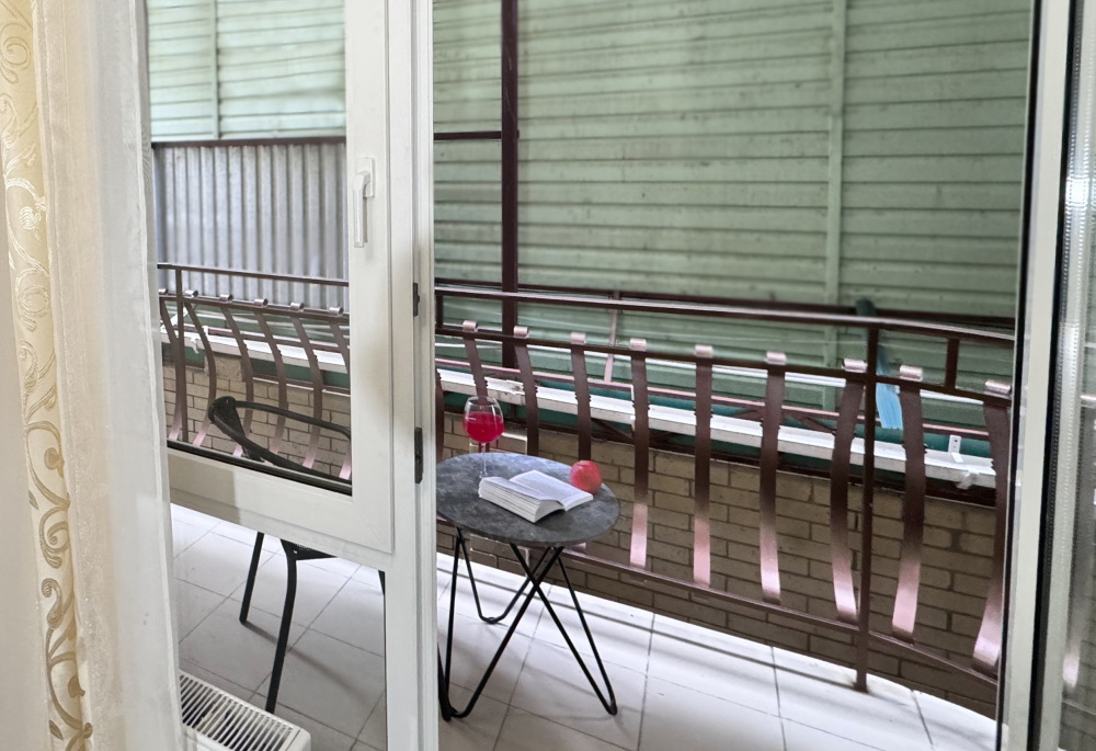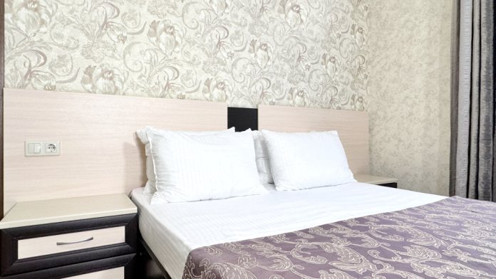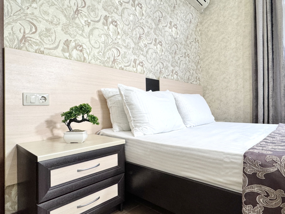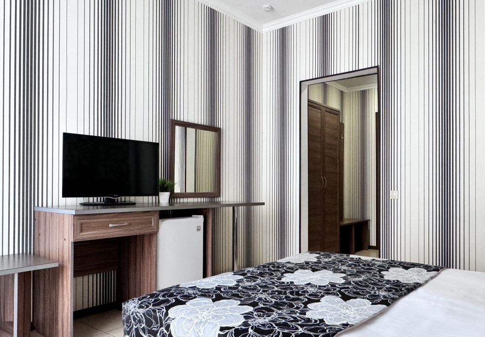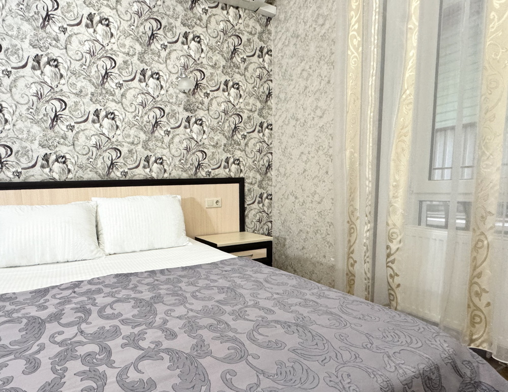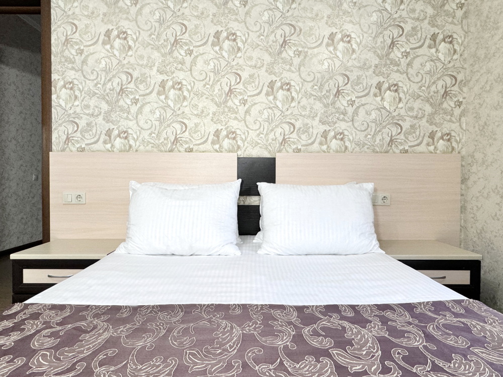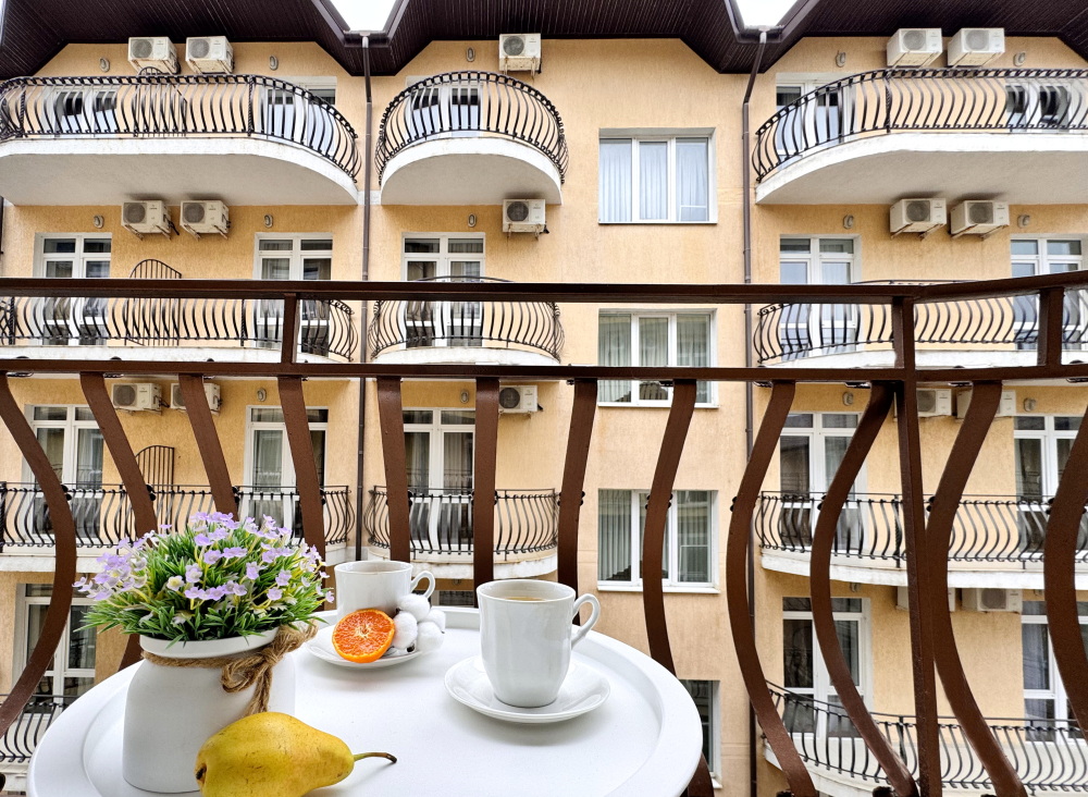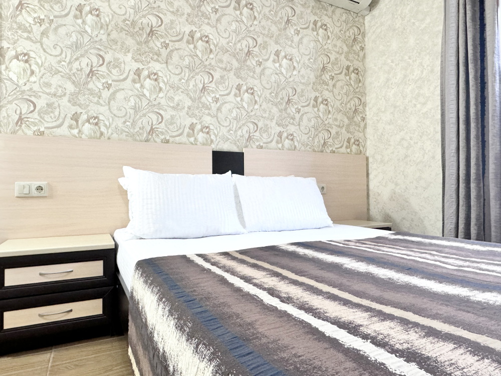 Однокомнатный номер. Двуспальная кровать (140*200), прикроватные тумбочки, бра, кондиционер, телевизор, журнальный столик, туалетный столик, зеркало, мини-холодильник, сейф. В прихожей находится вешалка для одежды, шкаф для хранения вещей. Балкон с видом на соседнее здание оборудован летней мебелью для отдыха, стол и стулья. Ванная комната: душ или ванная, фен, раковина и санузел.
