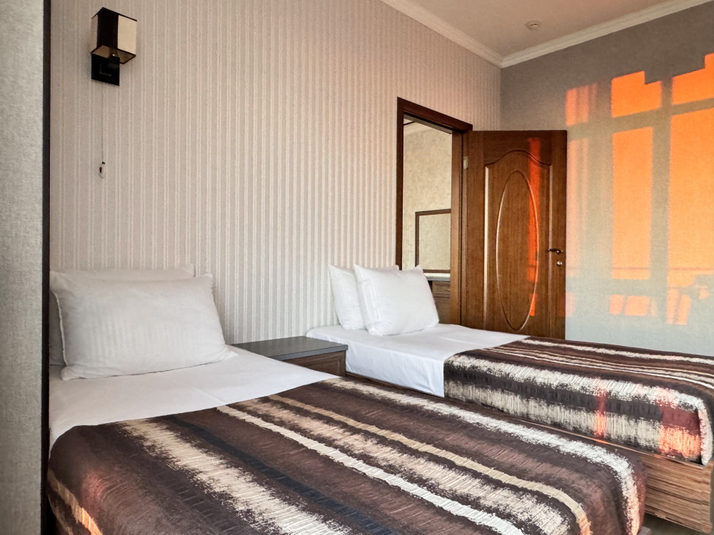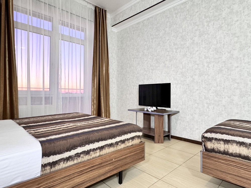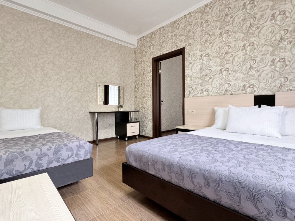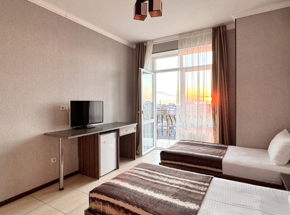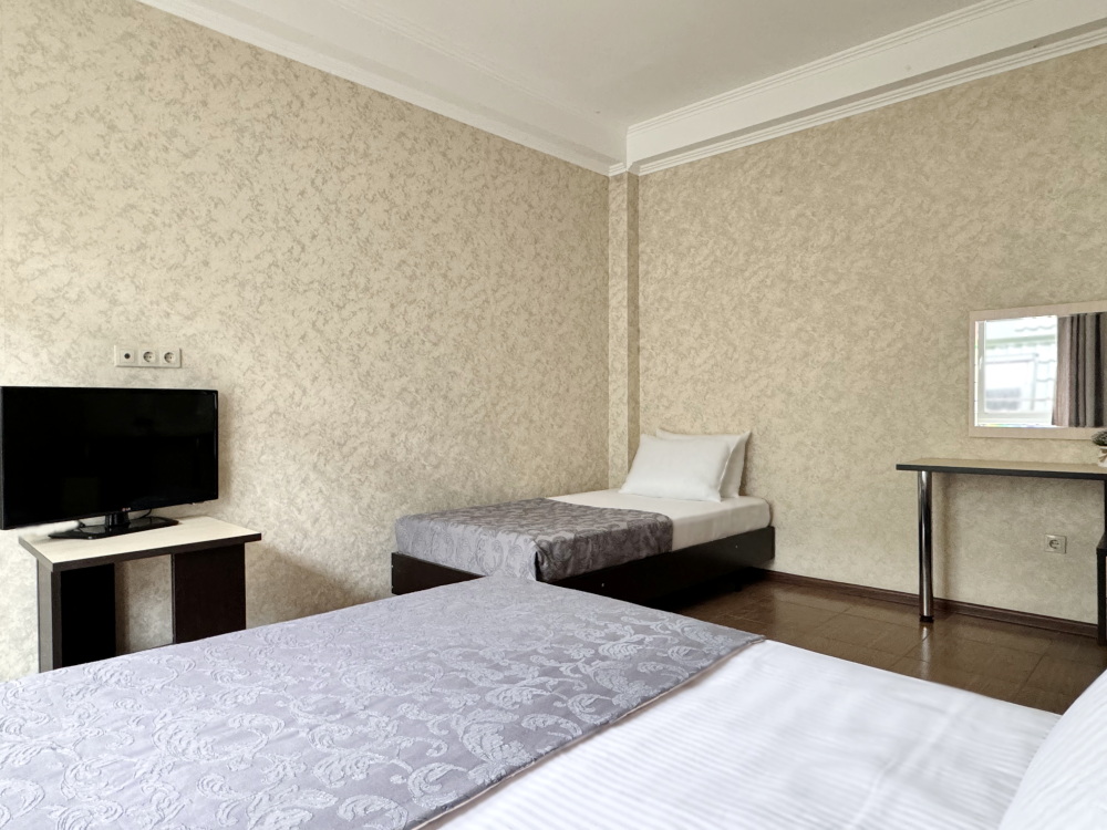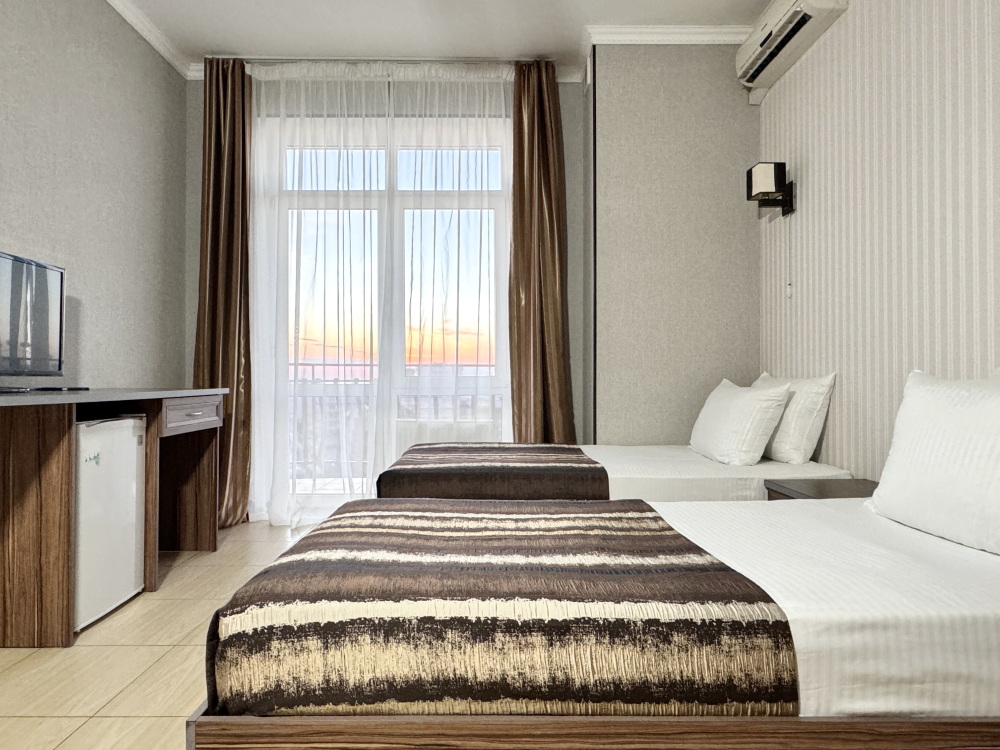 Номер с видом на город. Двуспальная кровать (140*200), односпальная кровать, прикроватные тумбочки, бра, кондиционер, журнальный столик, телевизор, туалетный столик, зеркало, мини-холодильник, сейф. В прихожей находится вешалка для одежды, шкаф для хранения вещей. Балкон оборудован летней мебелью для отдыха, стол и стулья. Ванная комната: душ или ванная, фен, раковина и санузел.