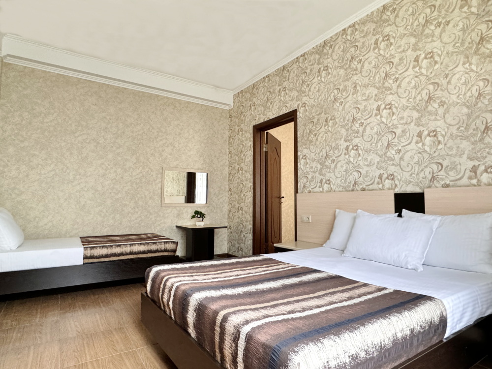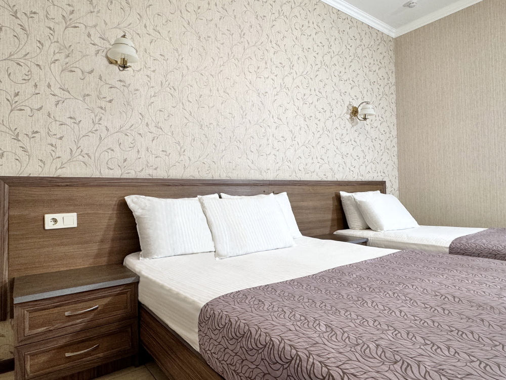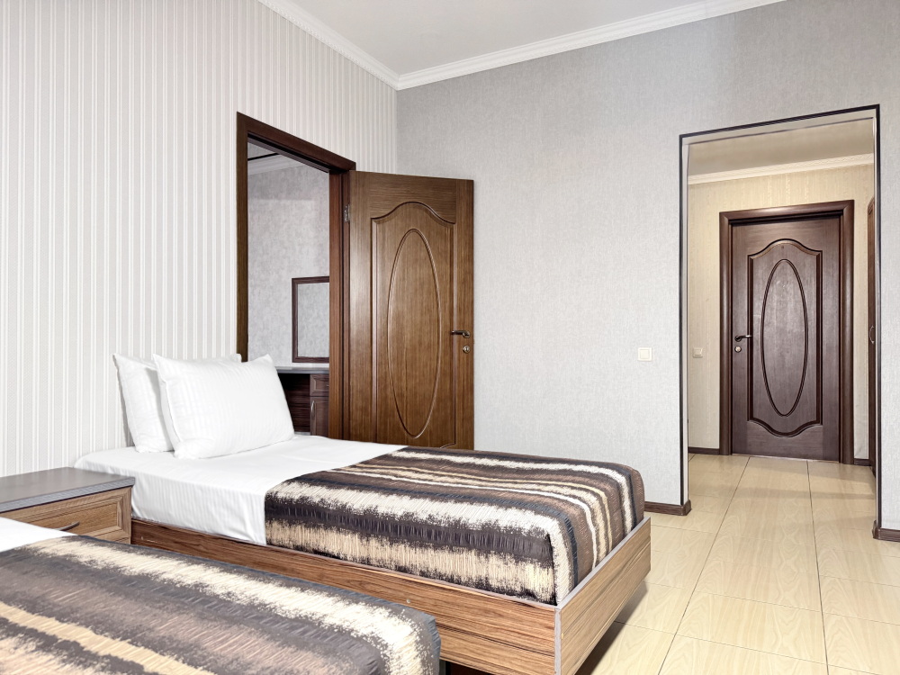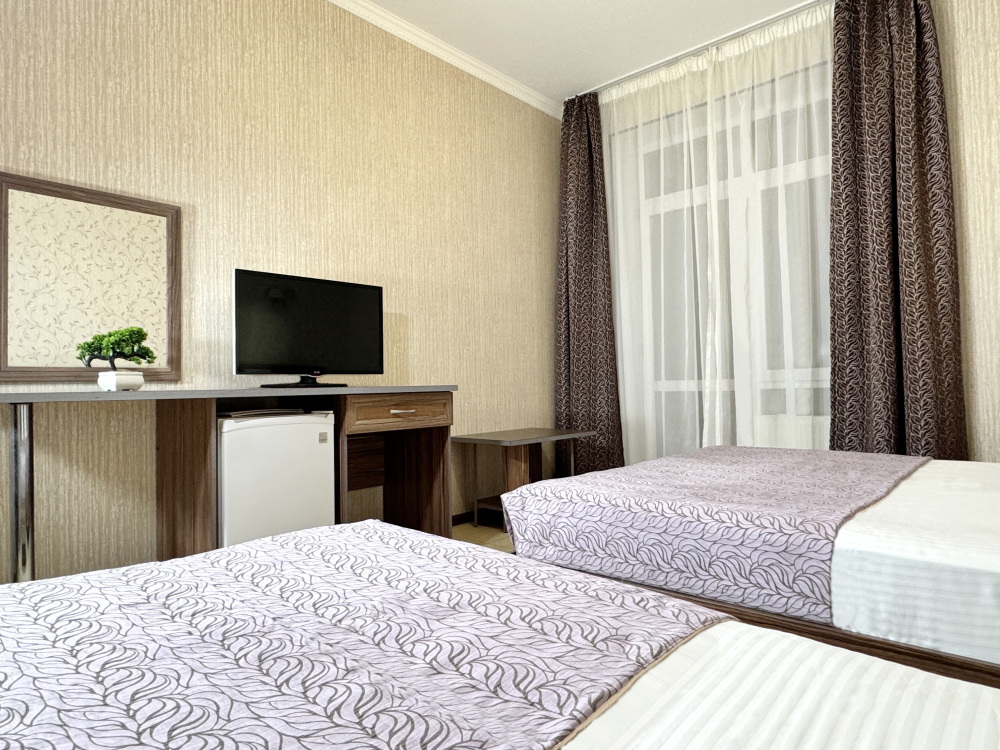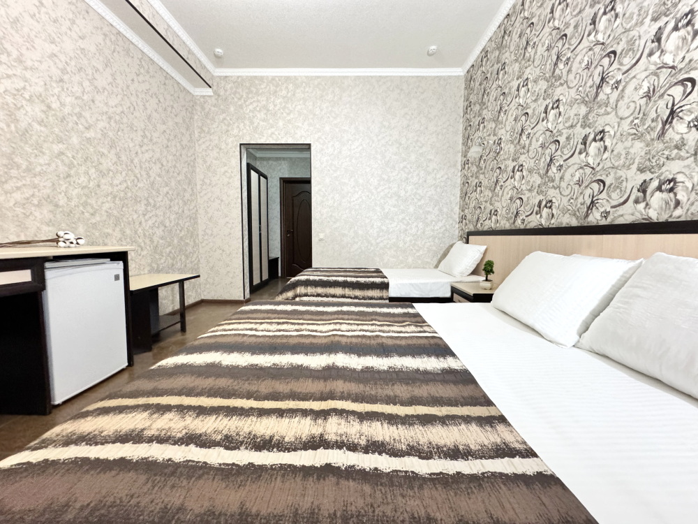 Номер с видом на город. Двуспальная кровать (140*200), односпальная кровать, прикроватные тумбочки, бра, кондиционер, журнальный столик, телевизор, туалетный столик, зеркало, мини-холодильник, сейф. В прихожей находится вешалка для одежды, шкаф для хранения вещей. Балкон оборудован летней мебелью для отдыха, стол и стулья. Ванная комната: душ или ванная, фен, раковина и санузел.