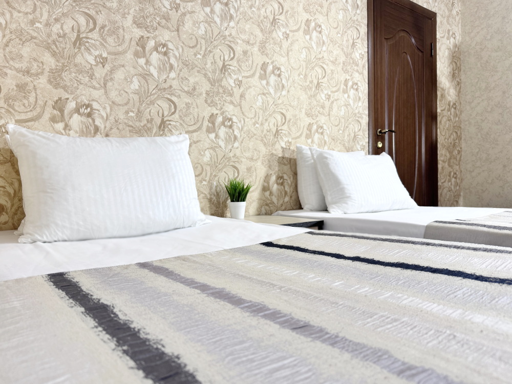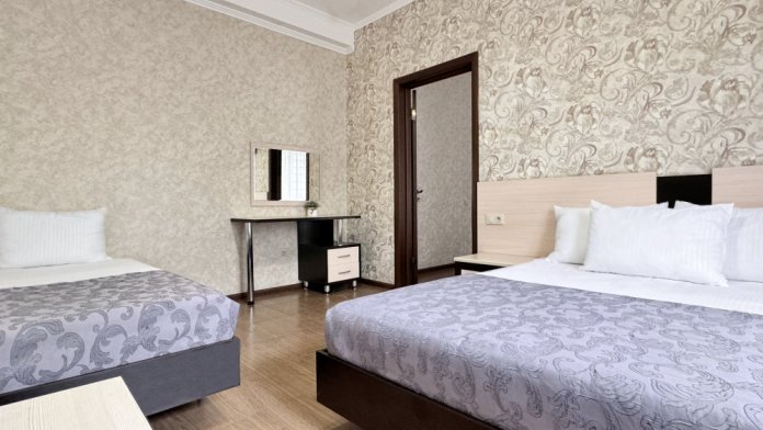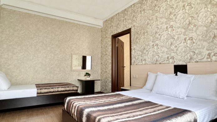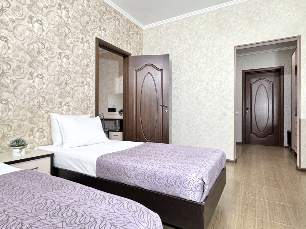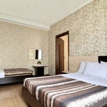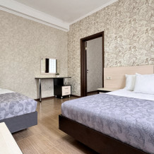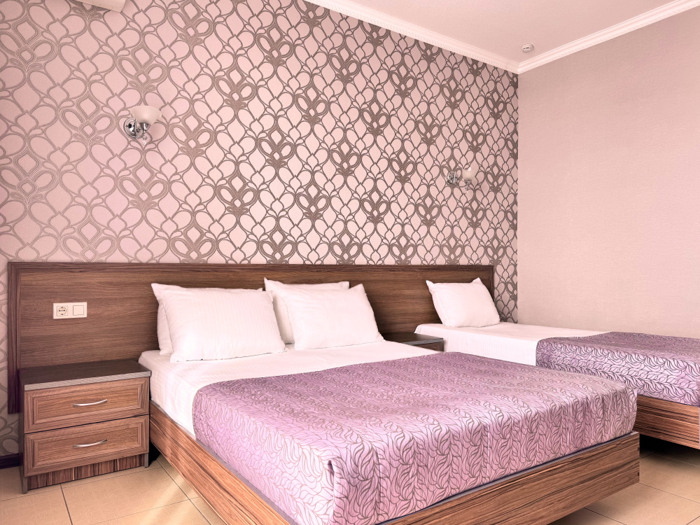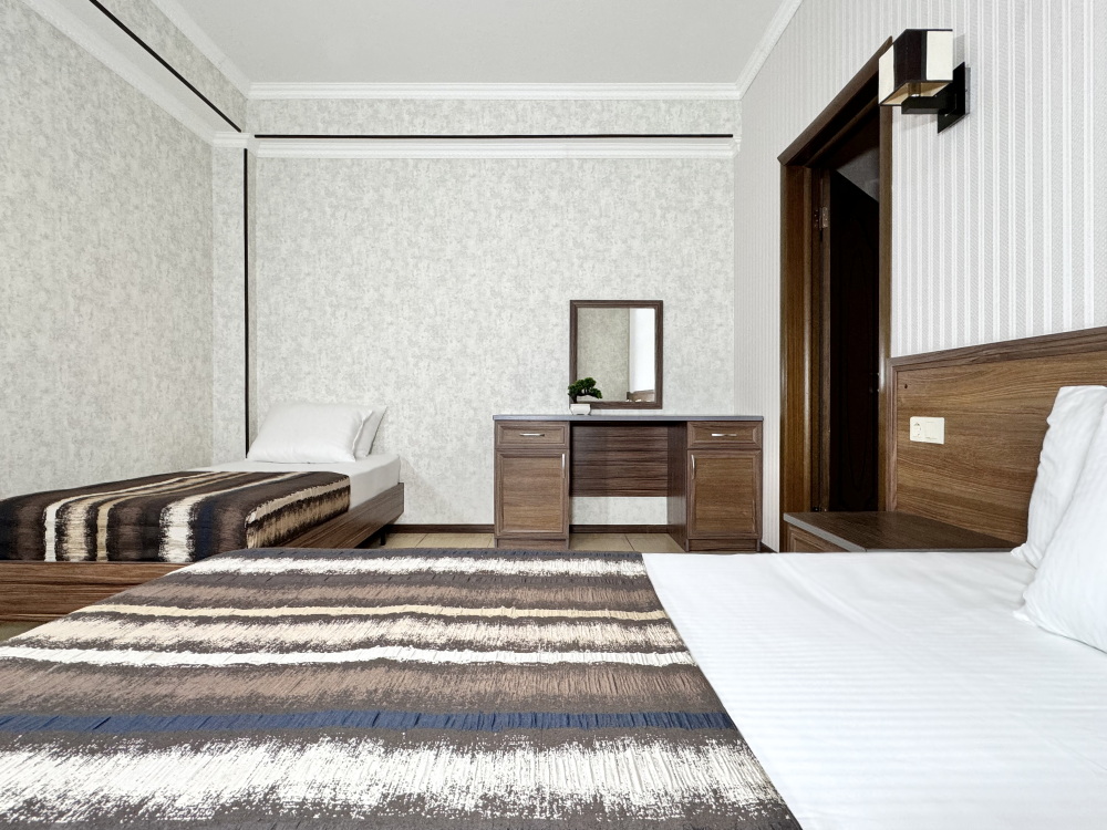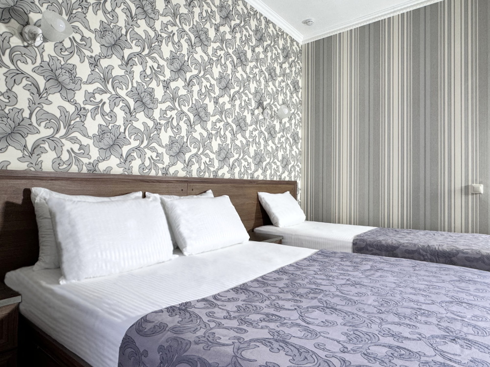 Номер с видом на город. Двуспальная кровать (140*200), односпальная кровать, прикроватные тумбочки, бра, кондиционер, журнальный столик, телевизор, туалетный столик, зеркало, мини-холодильник, сейф. В прихожей находится вешалка для одежды, шкаф для хранения вещей. Балкон оборудован летней мебелью для отдыха, стол и стулья. Ванная комната: душ или ванная, фен, раковина и санузел.